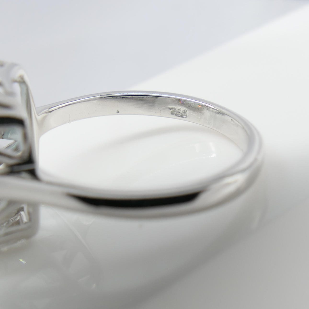 Ring: head measurements: 13 x 11m; geometric pattern to sides; tested as 18k white gold, stamped "750"