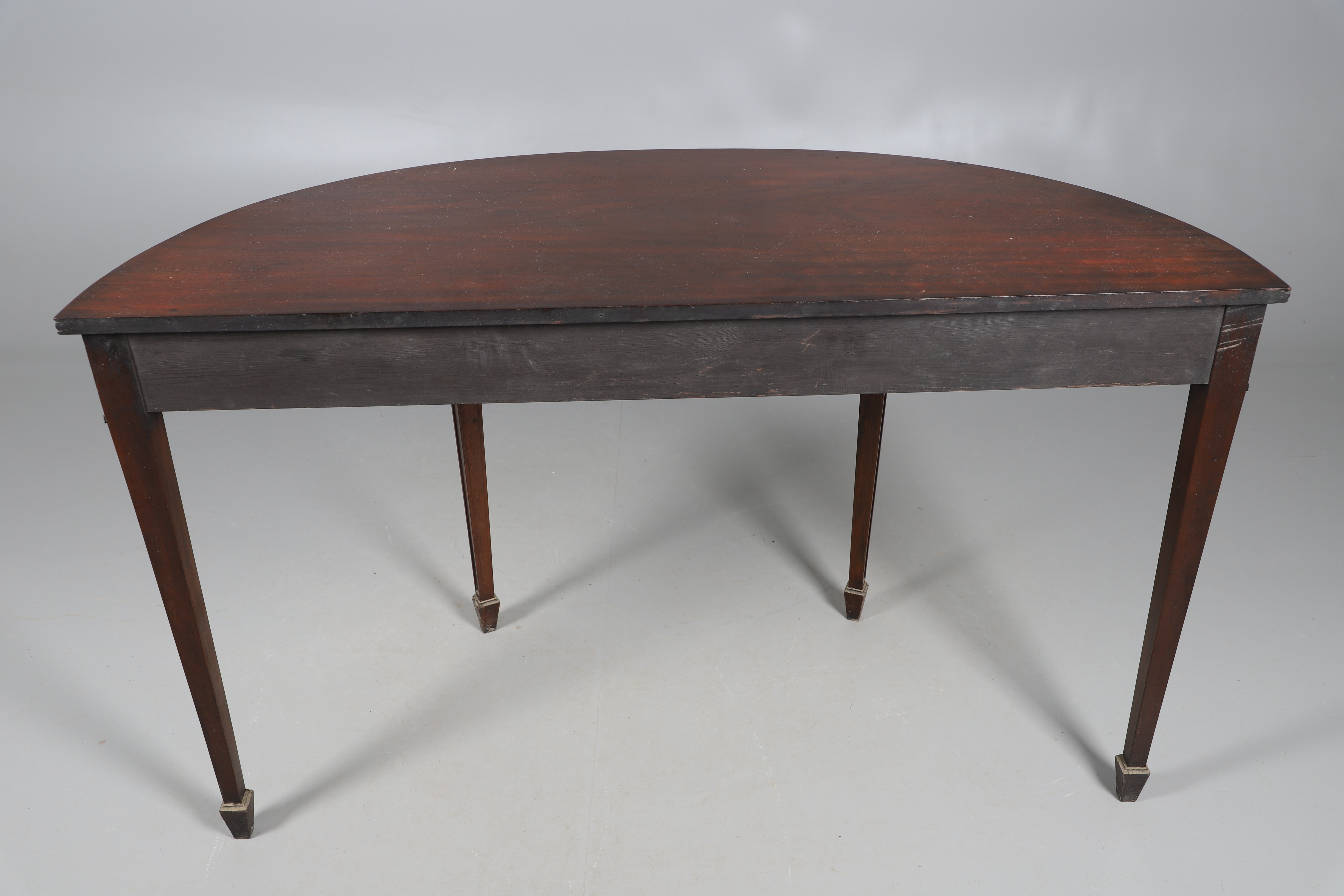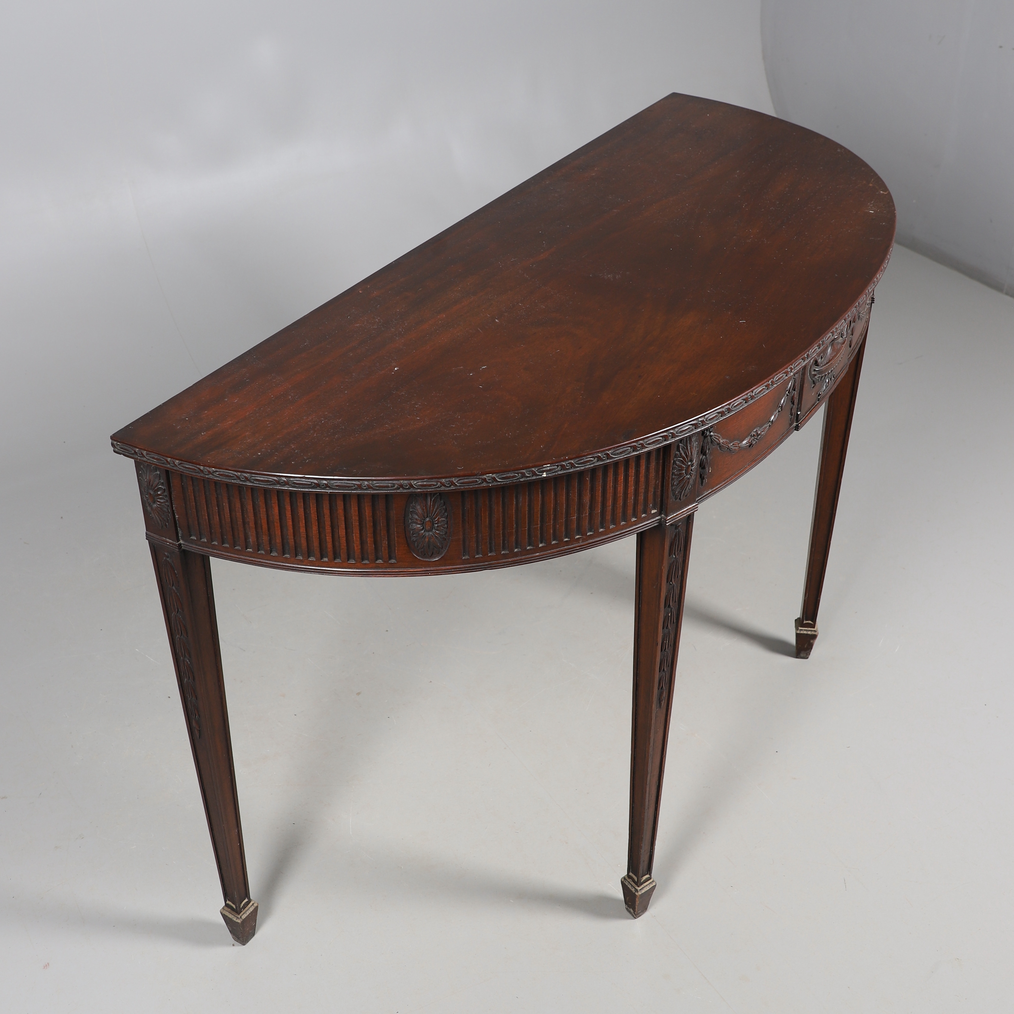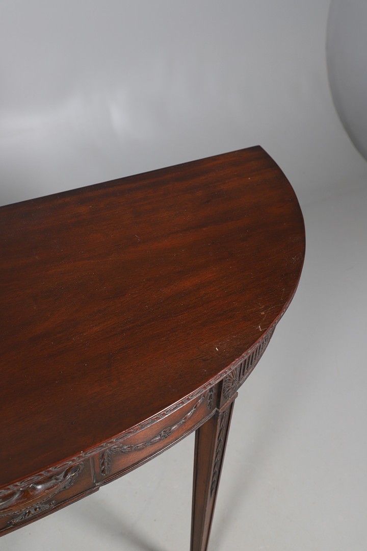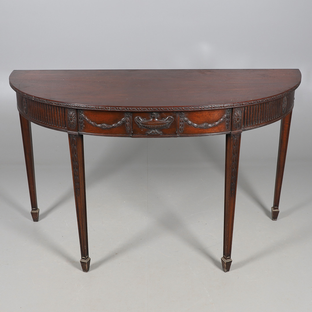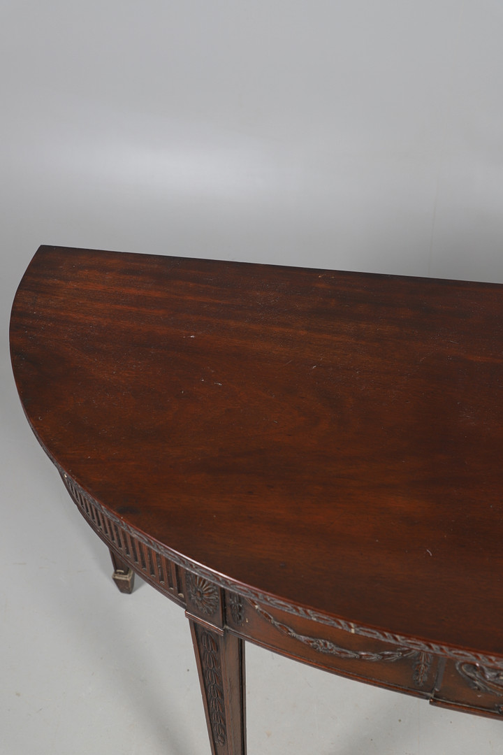3979723. A MAHOGANY DEMI LUNE SIDE TABLE.