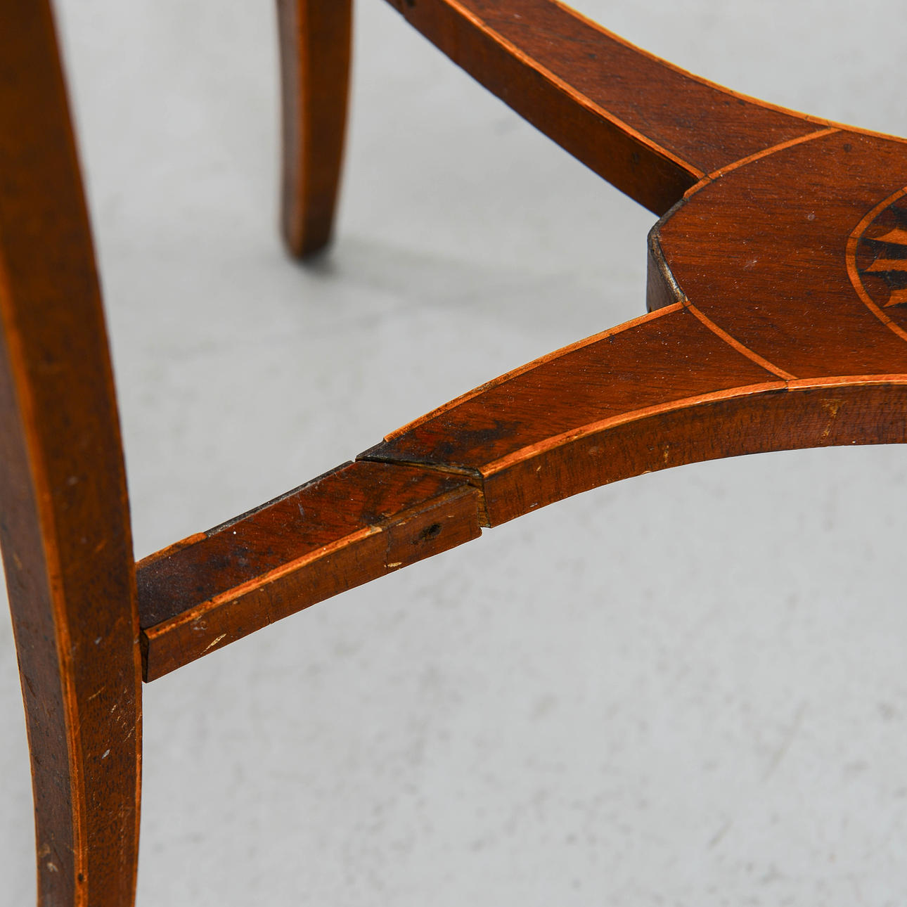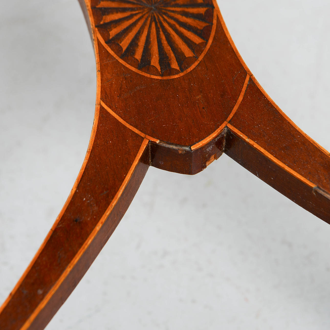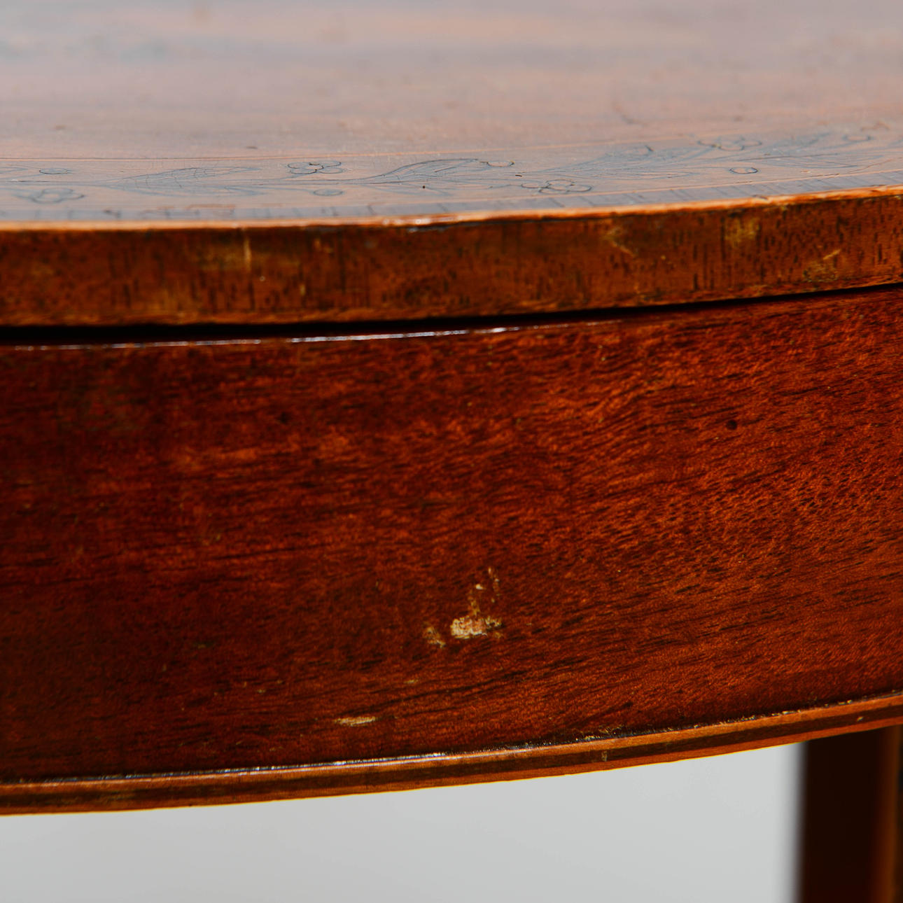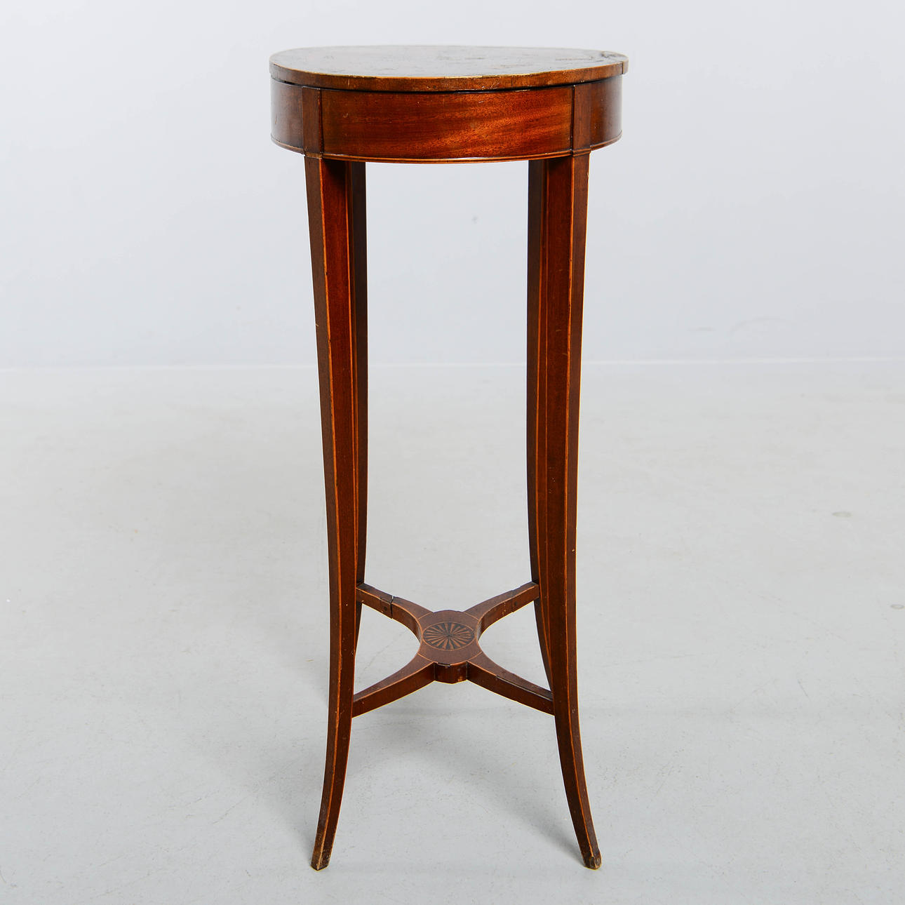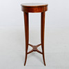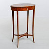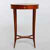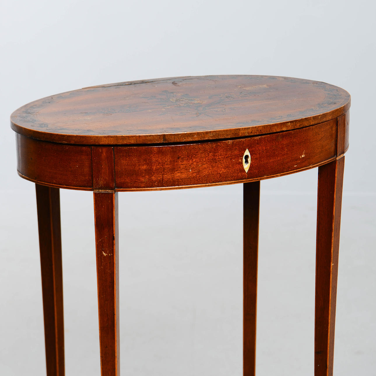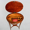 Oval table with fold-out top, underlying compartment interior and needle pad. Width 49, depth 34, height 76 cm.
