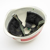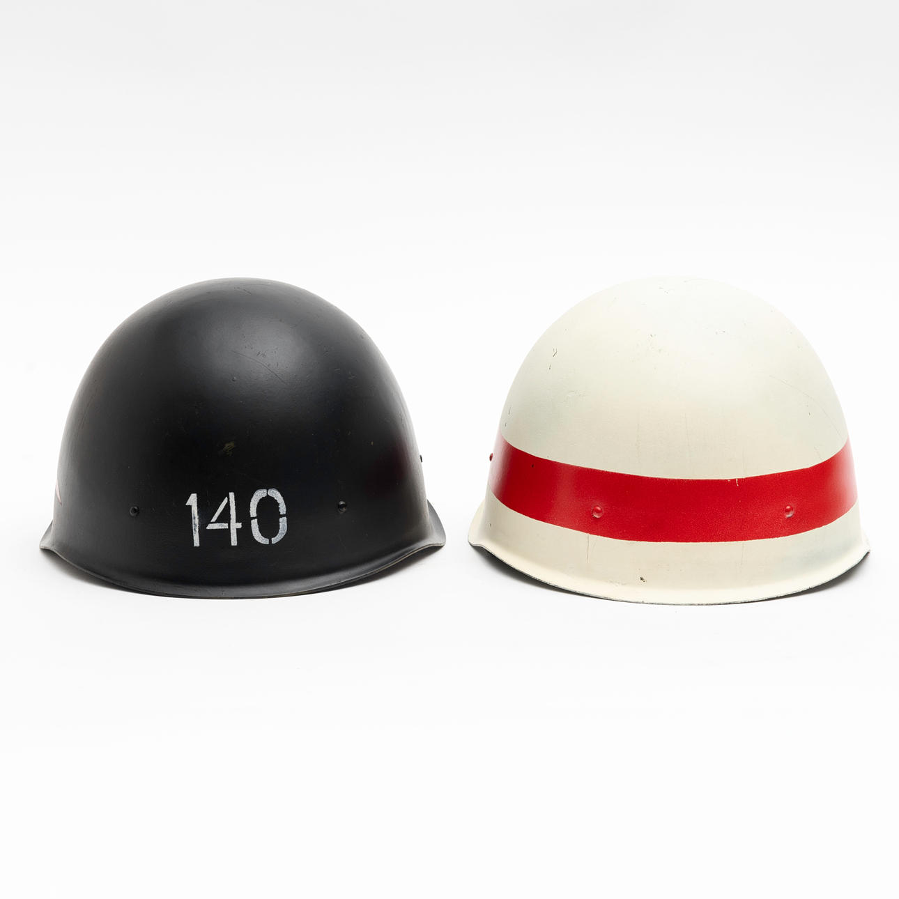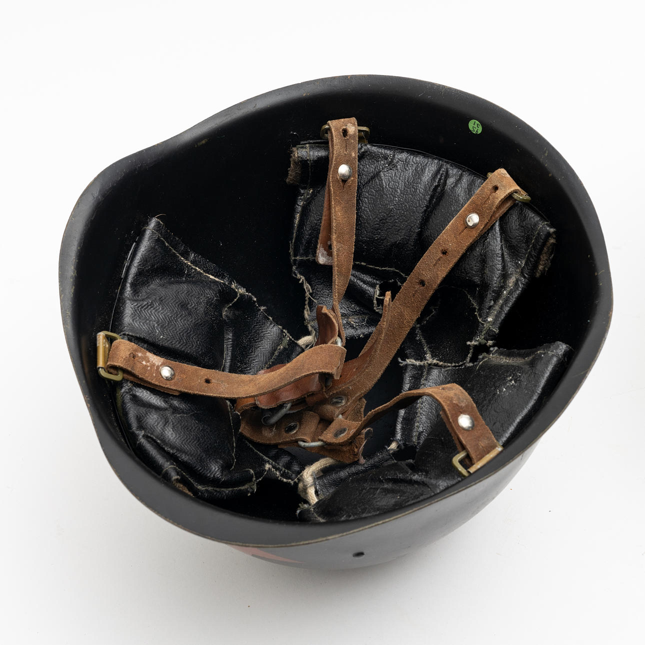 White helmet for mil-cop, decorated with red border and star. Partially furnished with three cushions and chinstrap in fabric.