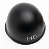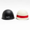Black helmet with red star decoration, navy emblem on the side and numbered 140 at the back, decorated with three cushions and chin strap.