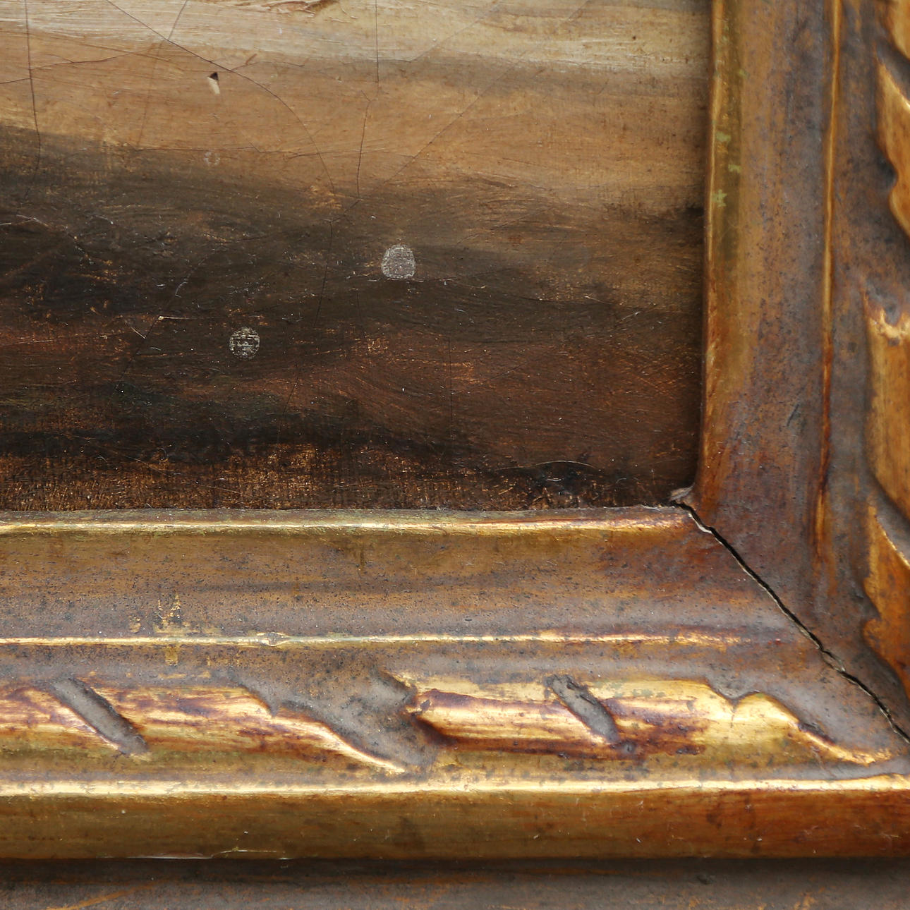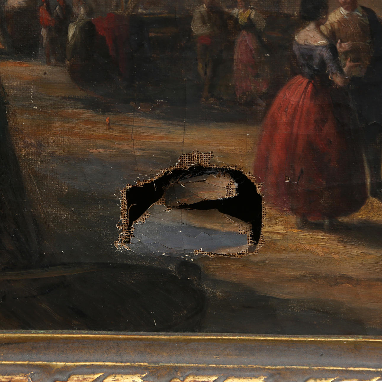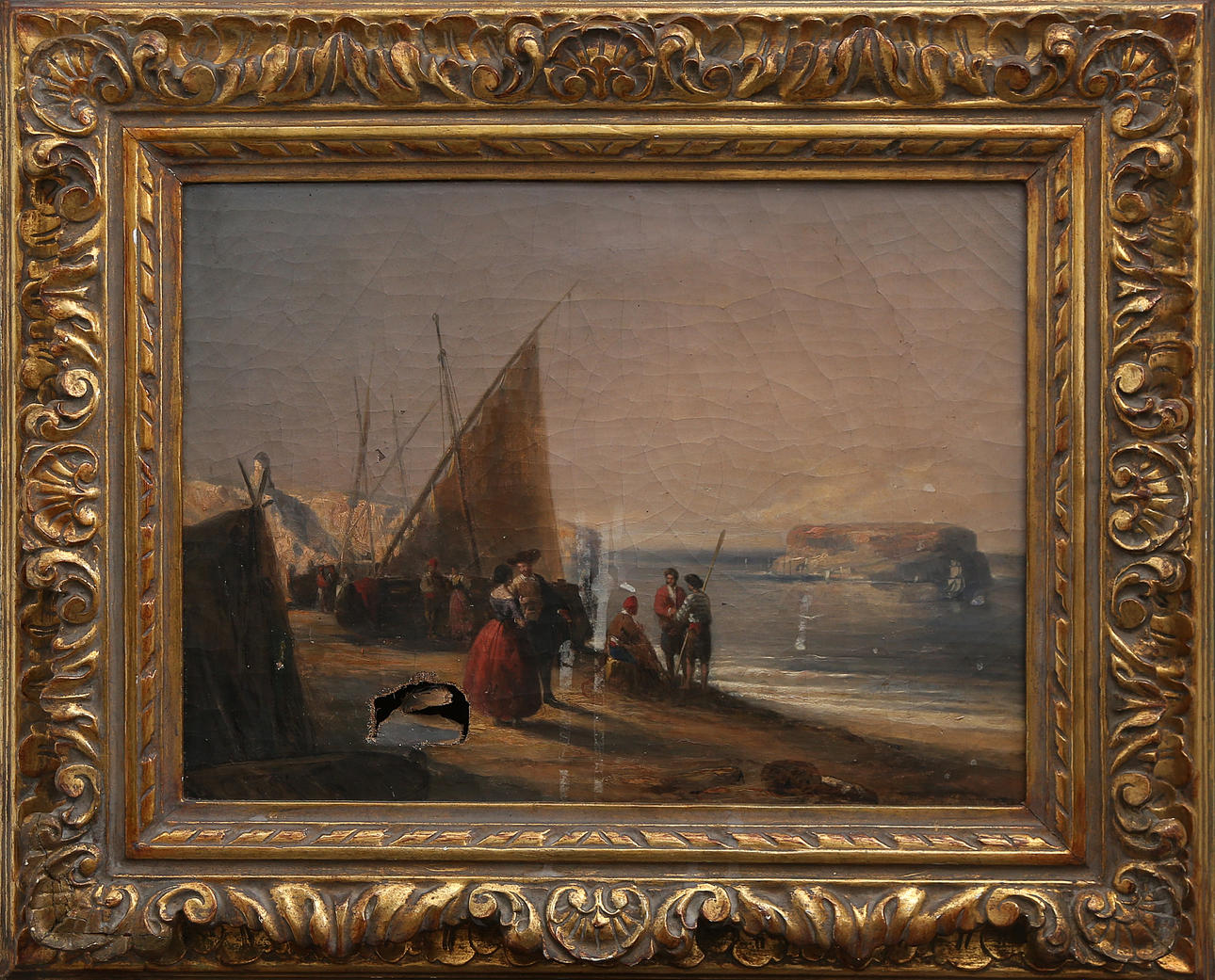 Breakage in the support, cracked on the pictorial layer. Frame in carved and gilt wood.