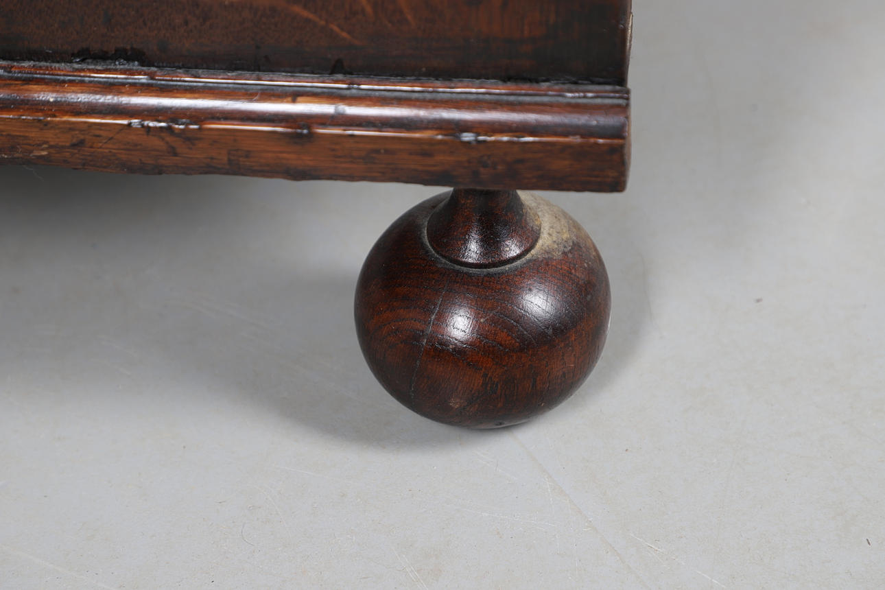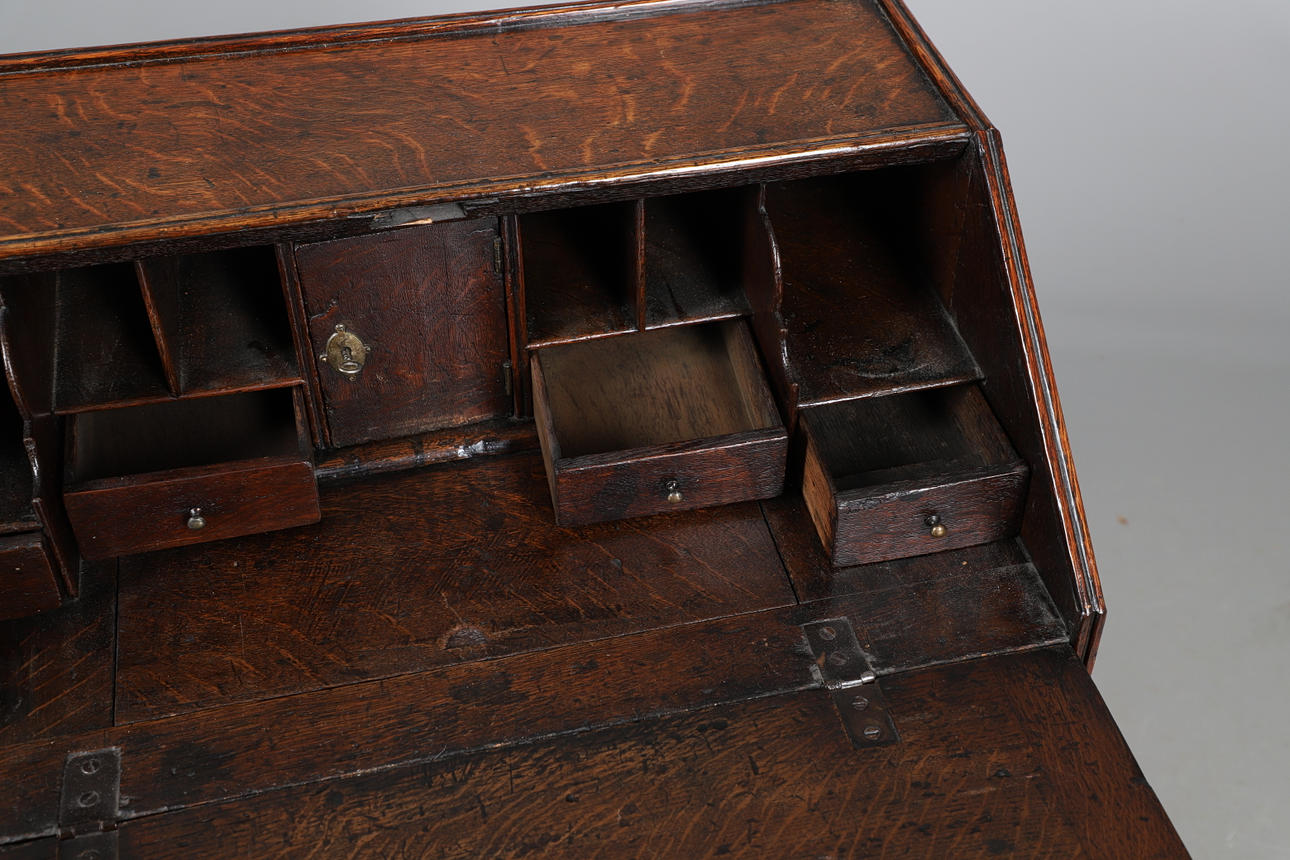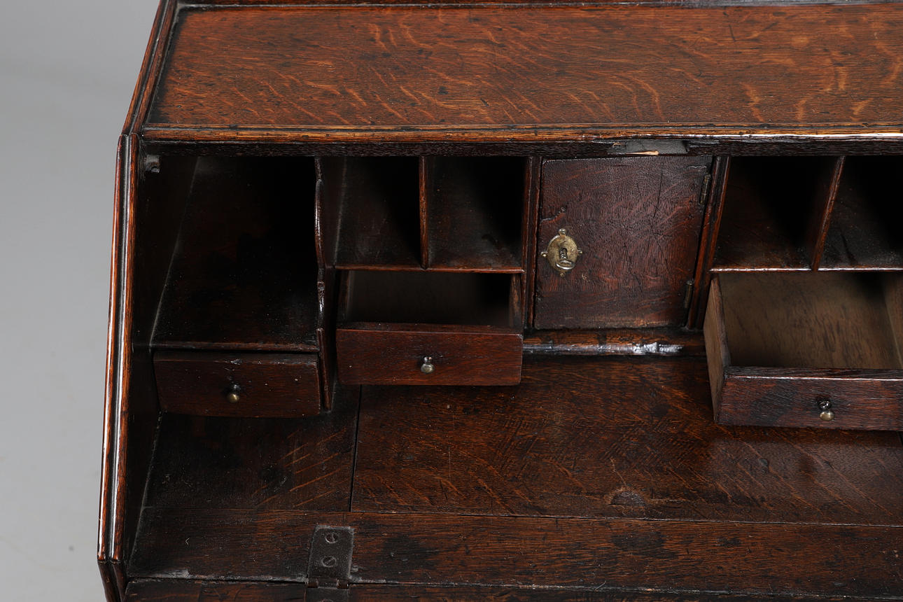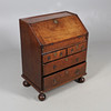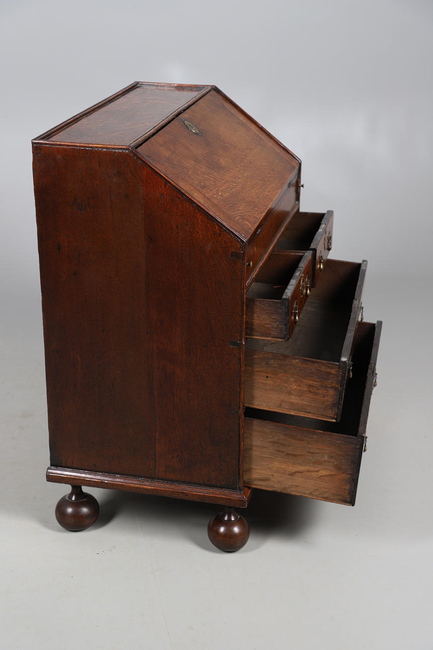 Early 18th century, of small proportions, the fall-front enclosing a fitted interior, above an arrangement of drawers and raised on bun feet.