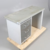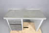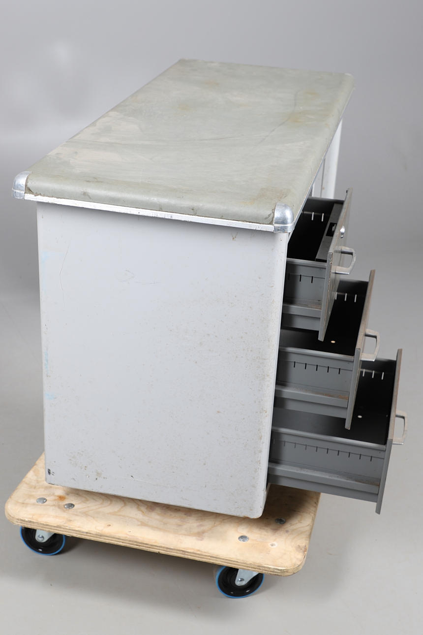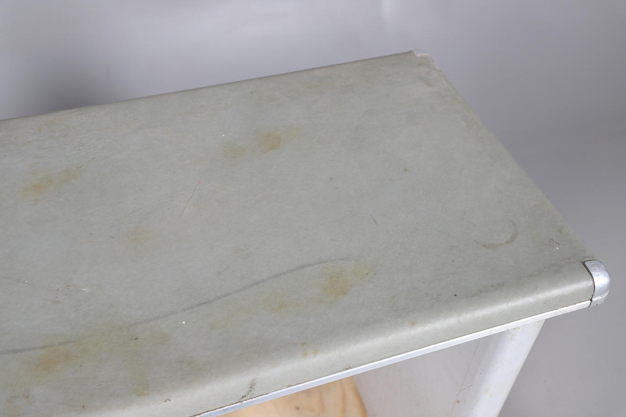 A metal and chrome mounted single pedestal desk, with three drawers on one side. 111cms by 46cms, 69cms high.