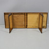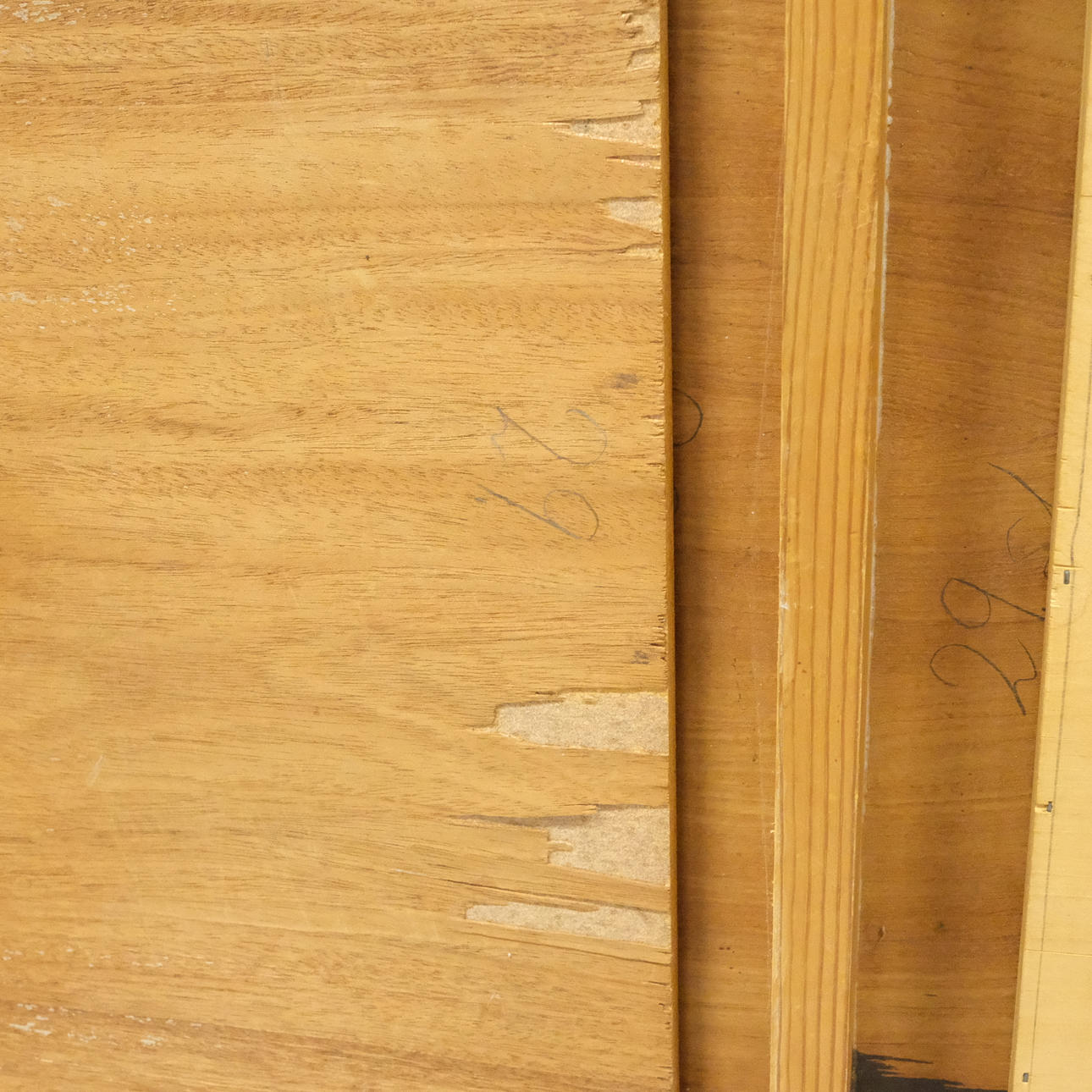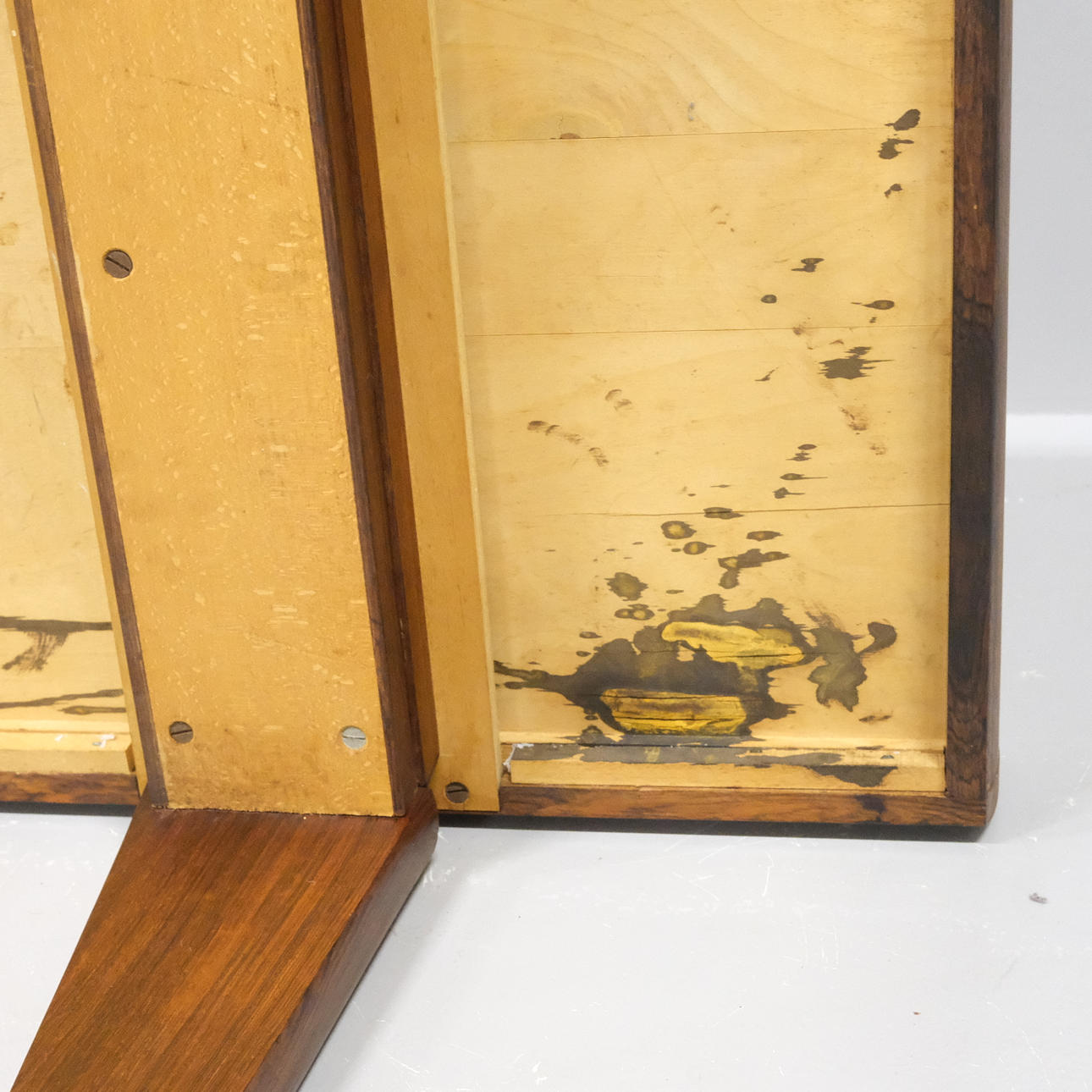 Underside with stains and veneer damage. Long side with small jack. Laminate board with wear. Somewhat unsteady.