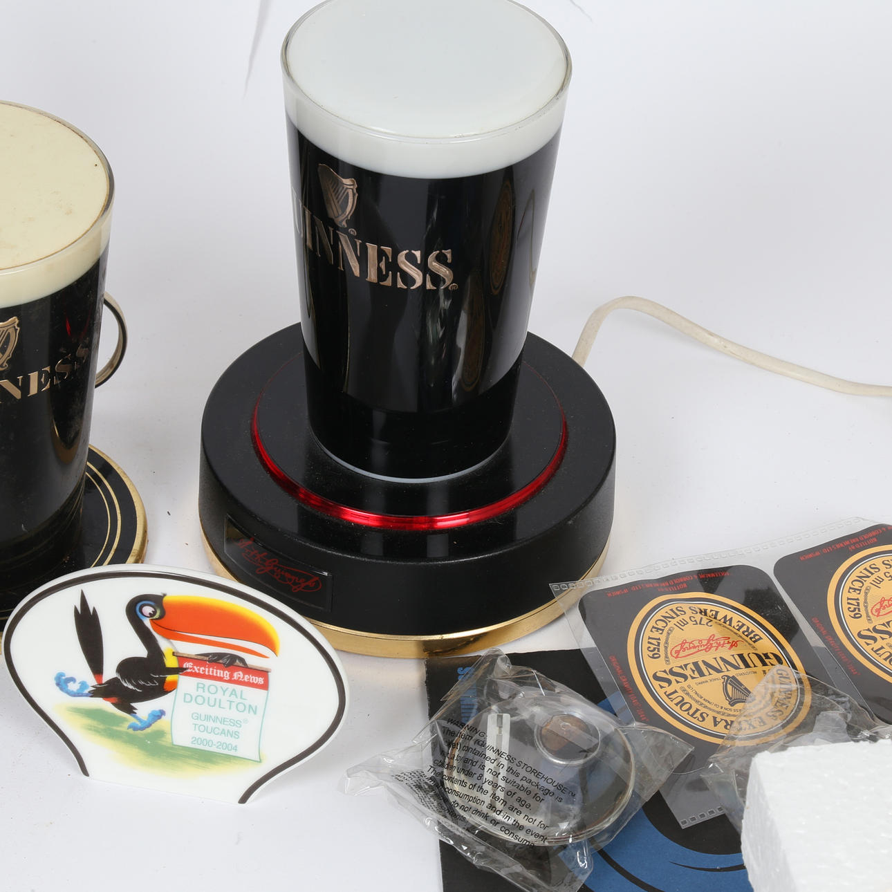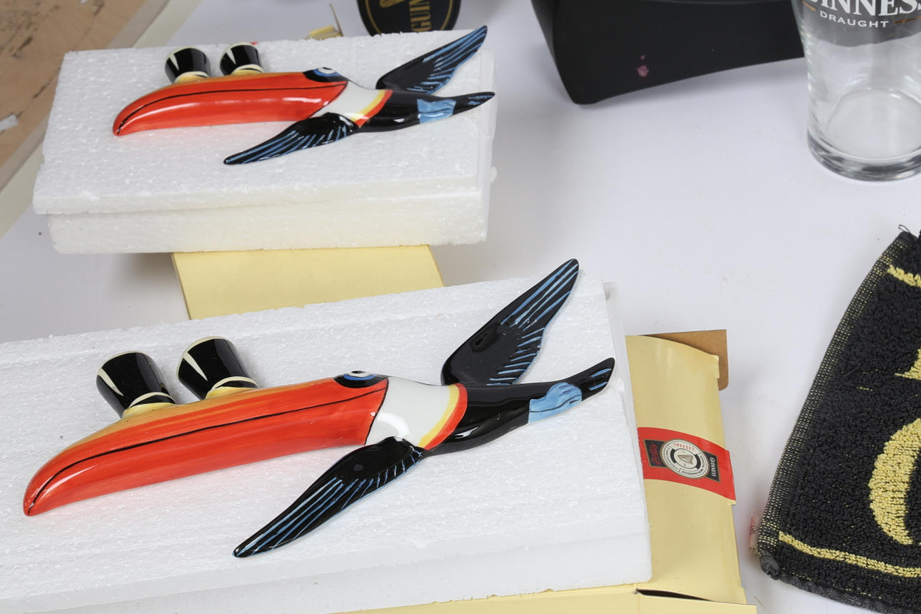 To include a Royal Doulton Guinness Toucan 2000-2004 news vendor name stand MCL 11 no. 1462/2000, three boxed flying toucan wall plaques (small, medium and large), two pint glasses, a Coalport 'Ringmaster' figure no. 271/2000, beer mat, three pump lights and an unmarked pump. (qty).