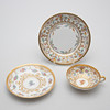 White porcelain with gold and polychrome paintings. Flat, smooth shape Flower tendrils, C-curves, passive flower vases and finely woven latticework on the edges and on the inside of the cup wall. Glazed blue manufacturer's mark with gold-colored sticker.