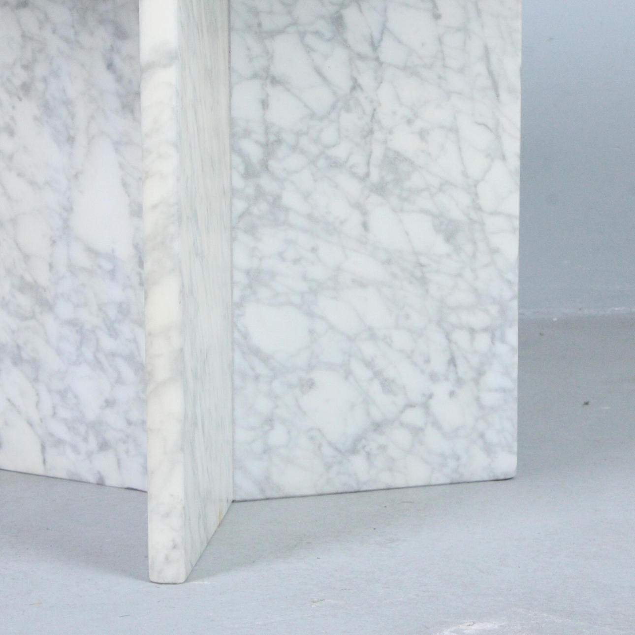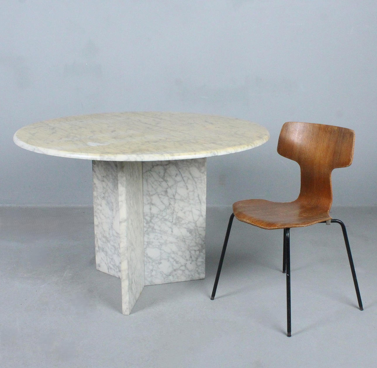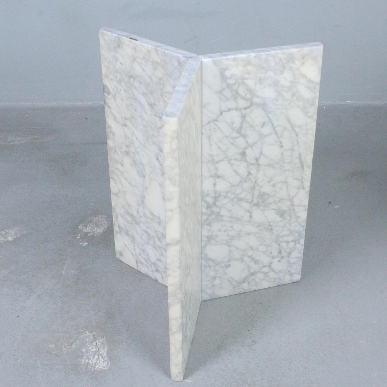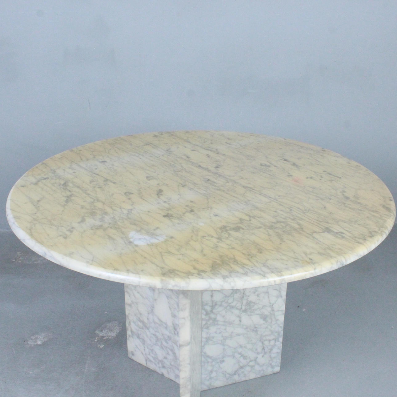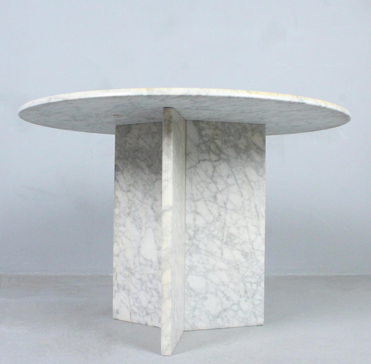 Round table/marble dining table, Italy, 1970s, white marble three-star frame, resting table top,