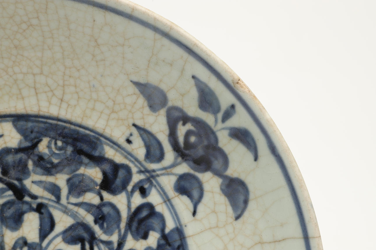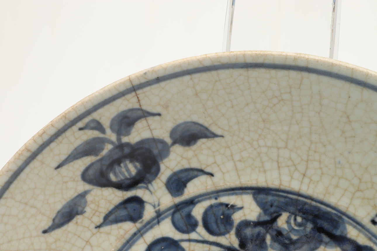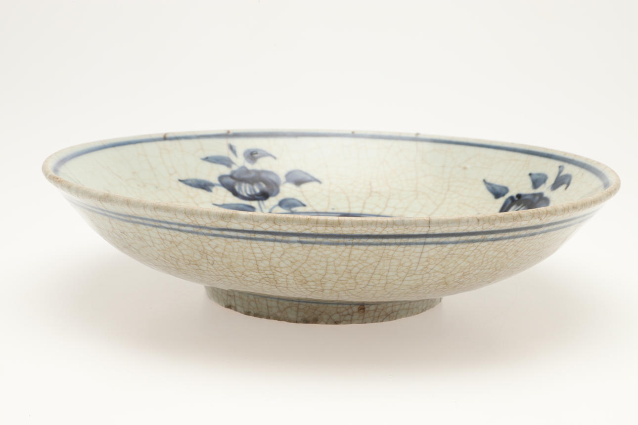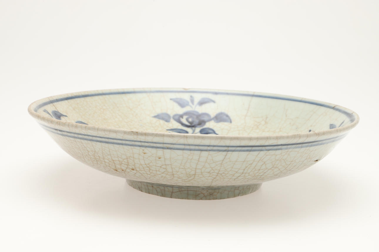 The large blue and white dish painted with flowers and leaves to the interior and with a crackle glaze. With double circle marks to the exterior, 32cms diameter.
