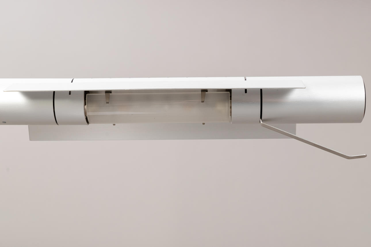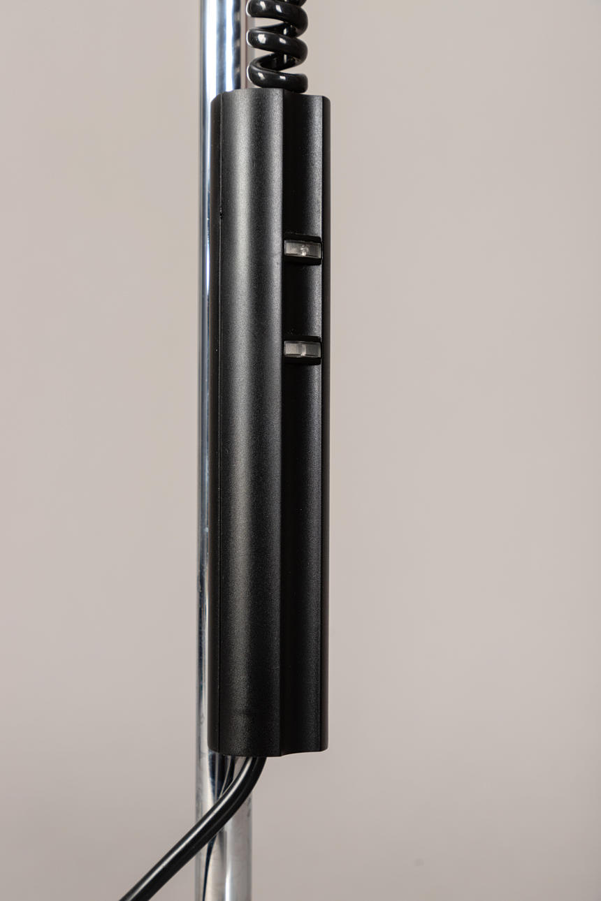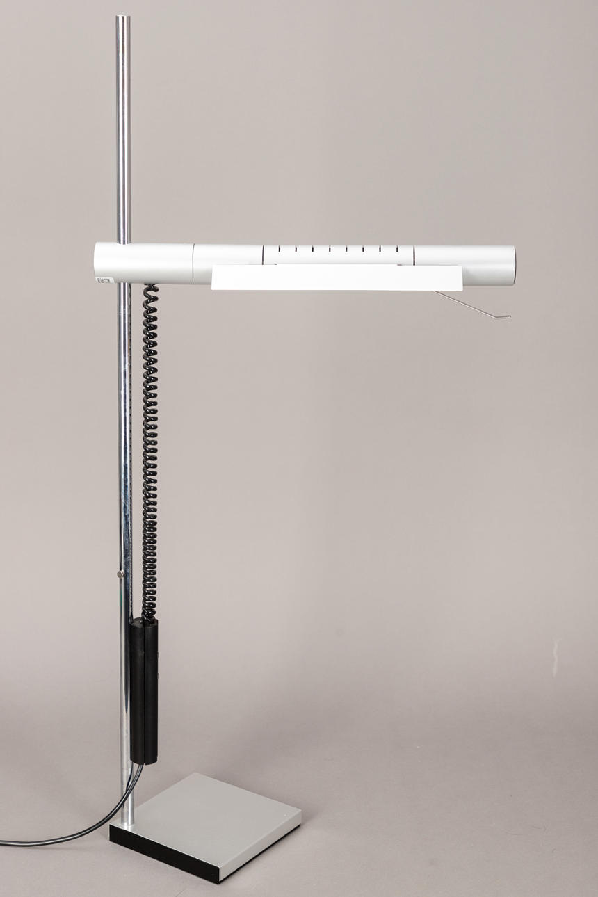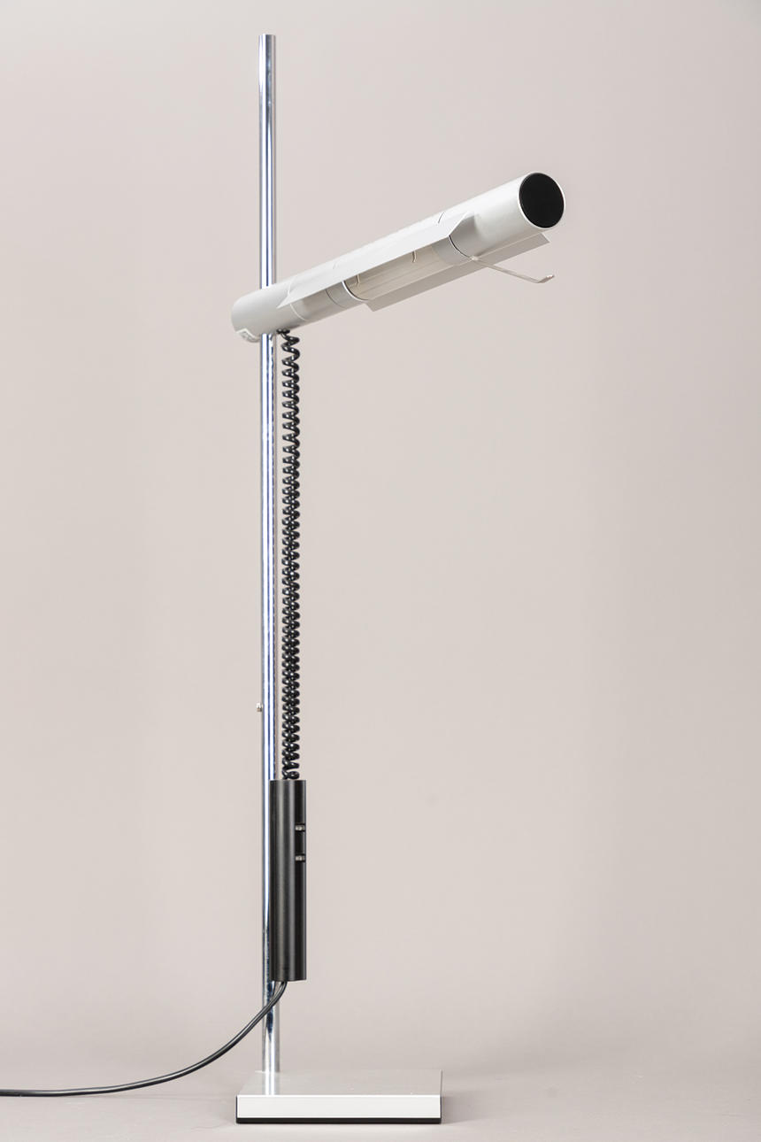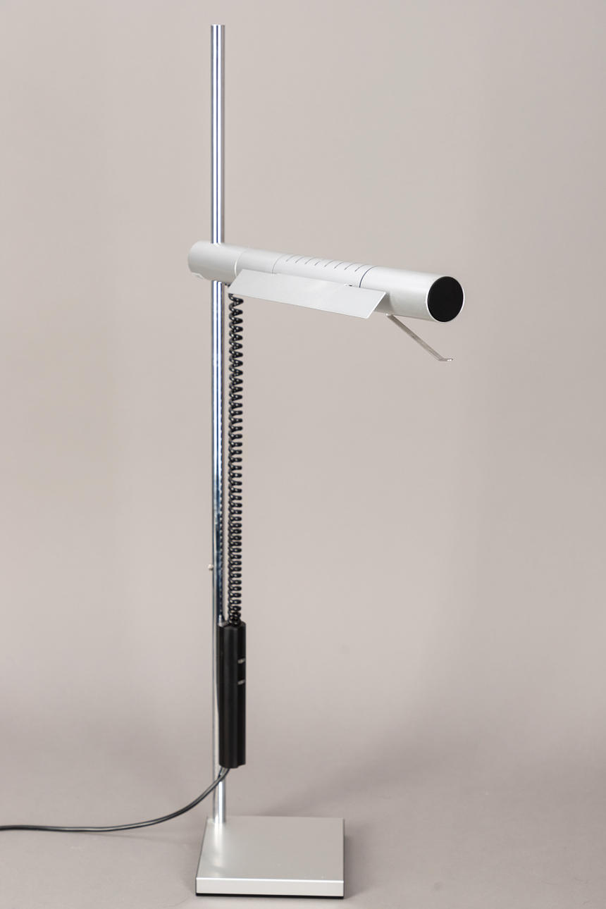 Design: 1976. Chrome-plated steel tube, height-adjustable aluminum reflector. Inscribed with manufacturer label.