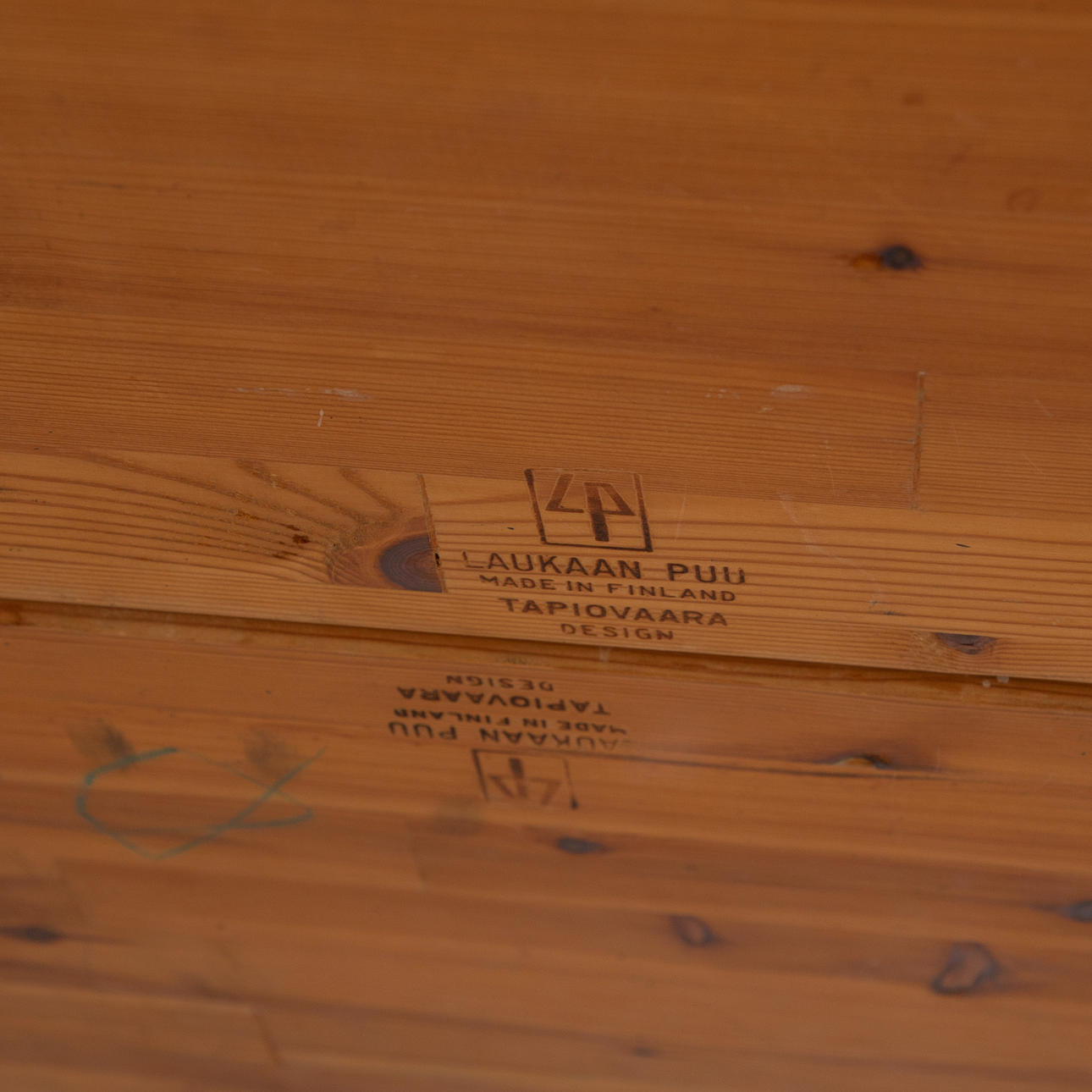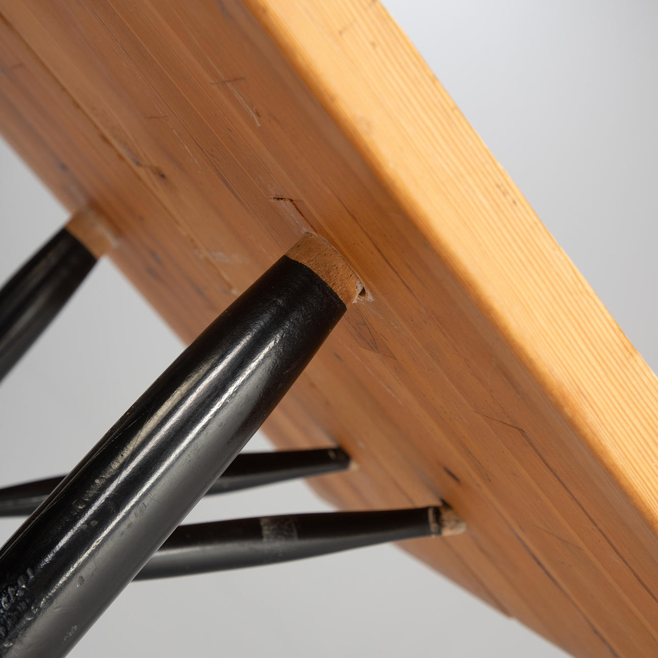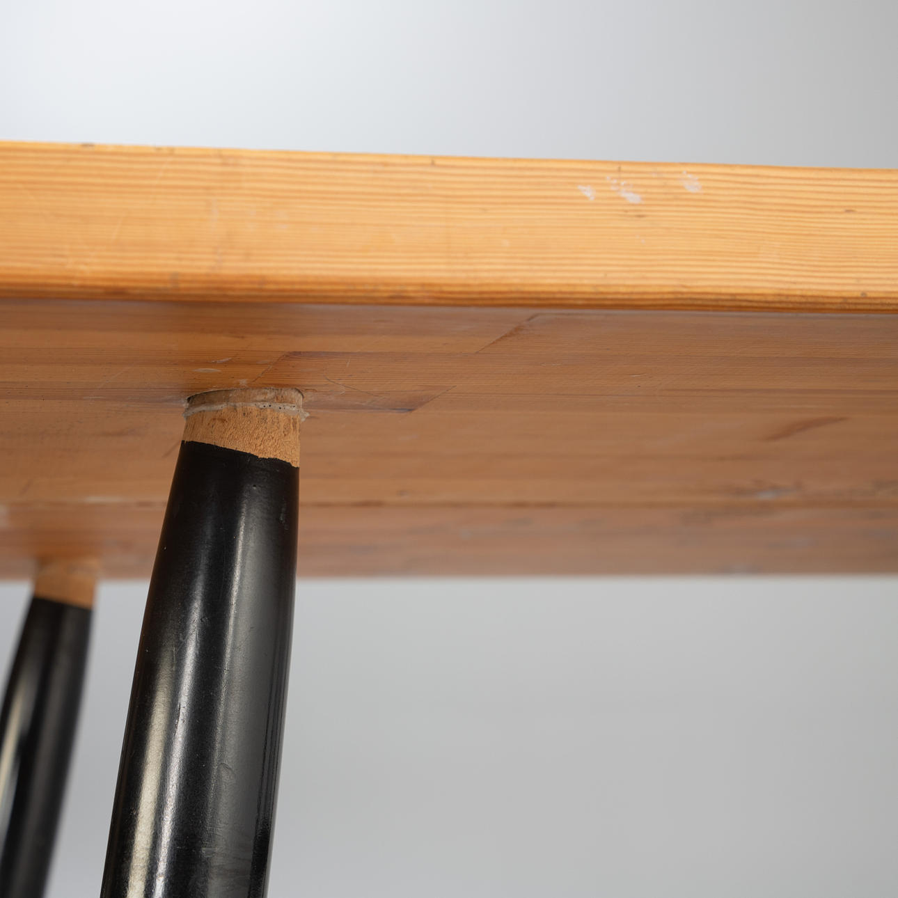 Ilmari Tapiovaara (1914-1999) for Asko, dining table/dining table, 'Pirkka' model, pine, designed in the 1950s, Finland. Pine wood table structure with a braced, black-lacquered base and a rectangular, two-piece table top, sealed with clear lacquer, branded on the underside.