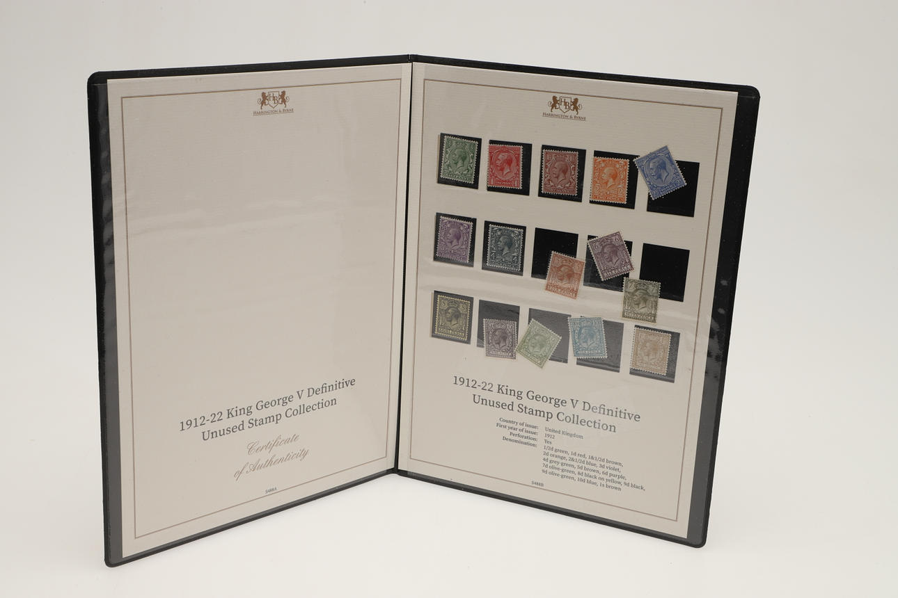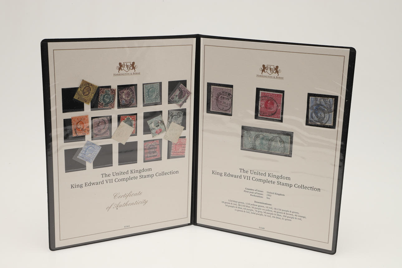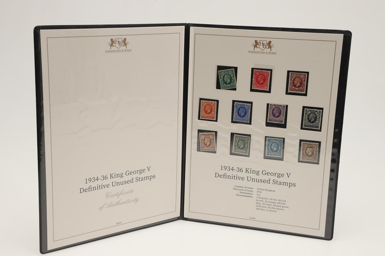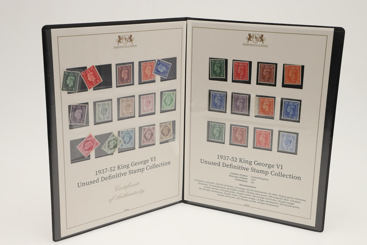 12 sets of Great Britain stamps, issued by Harrington & Byrne in booklets. Including King George V Definitive stamps, QV Lilac & Green stamps, QV 1887 stamp set, Festival of Britain 1951, George VI Definitive stamps, Edward VII including used £1 stamp, QEII Wilding Stamps, Overprinted Officials and others. (12).