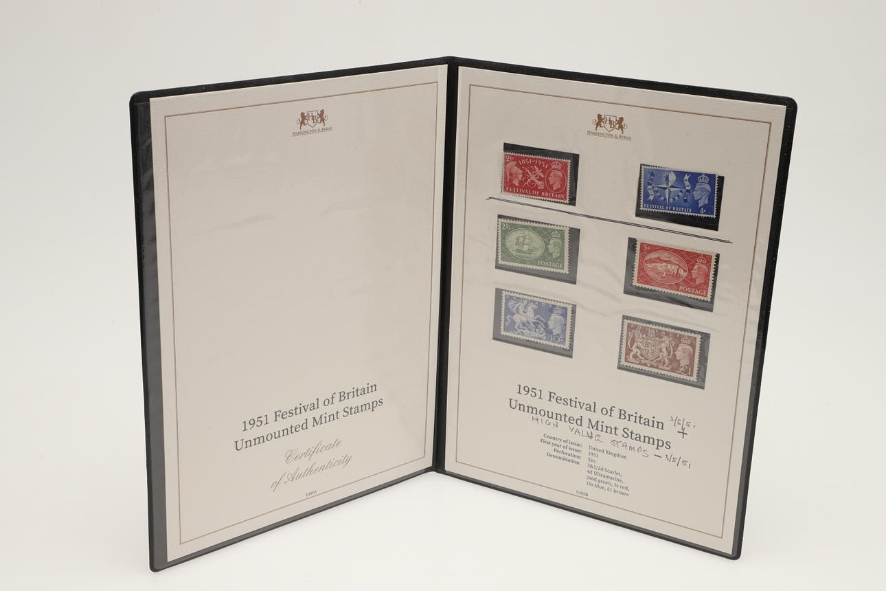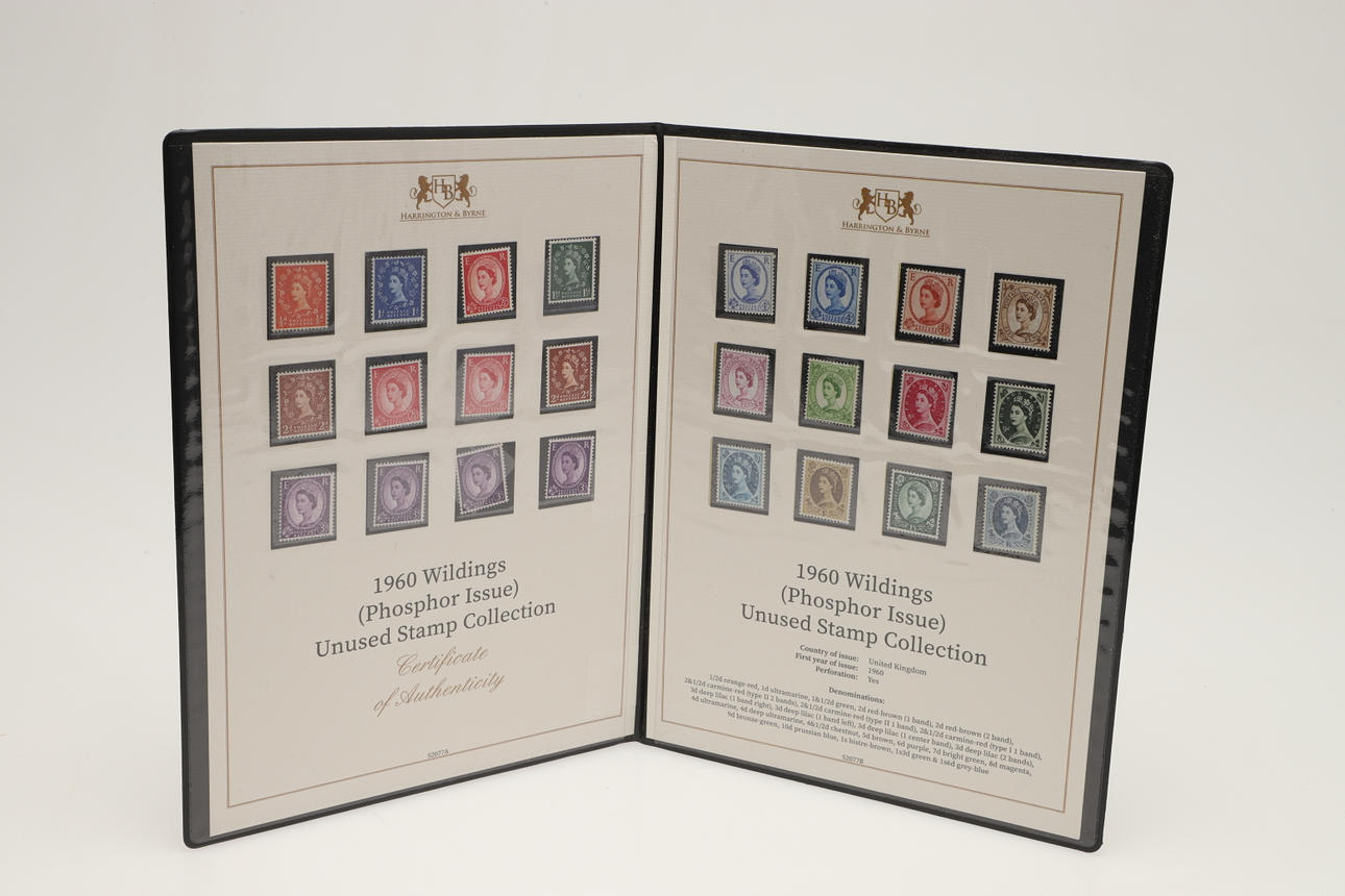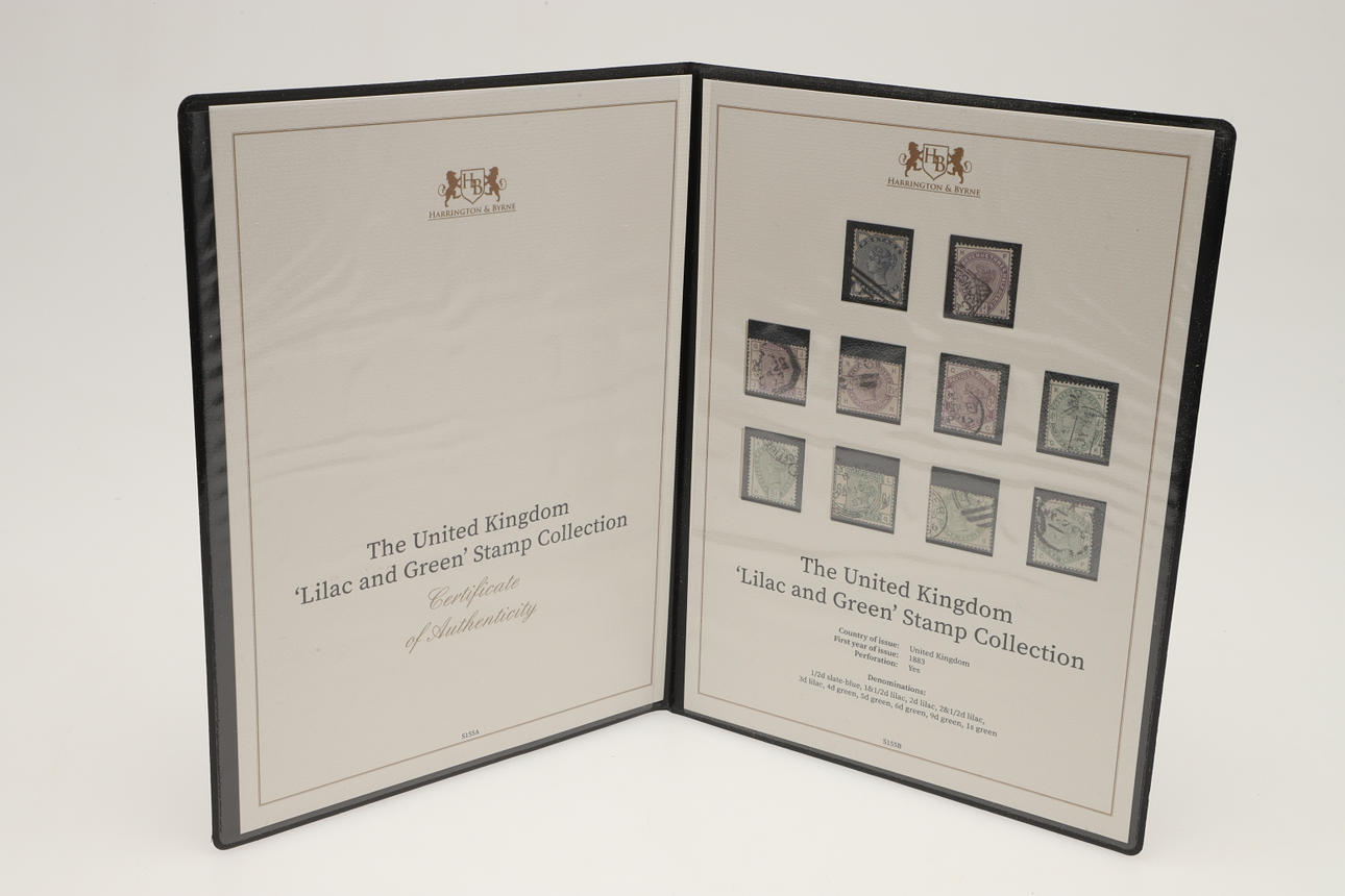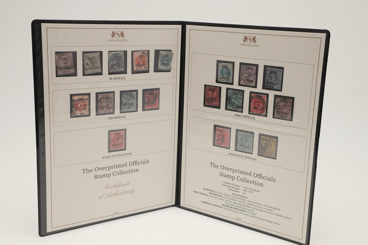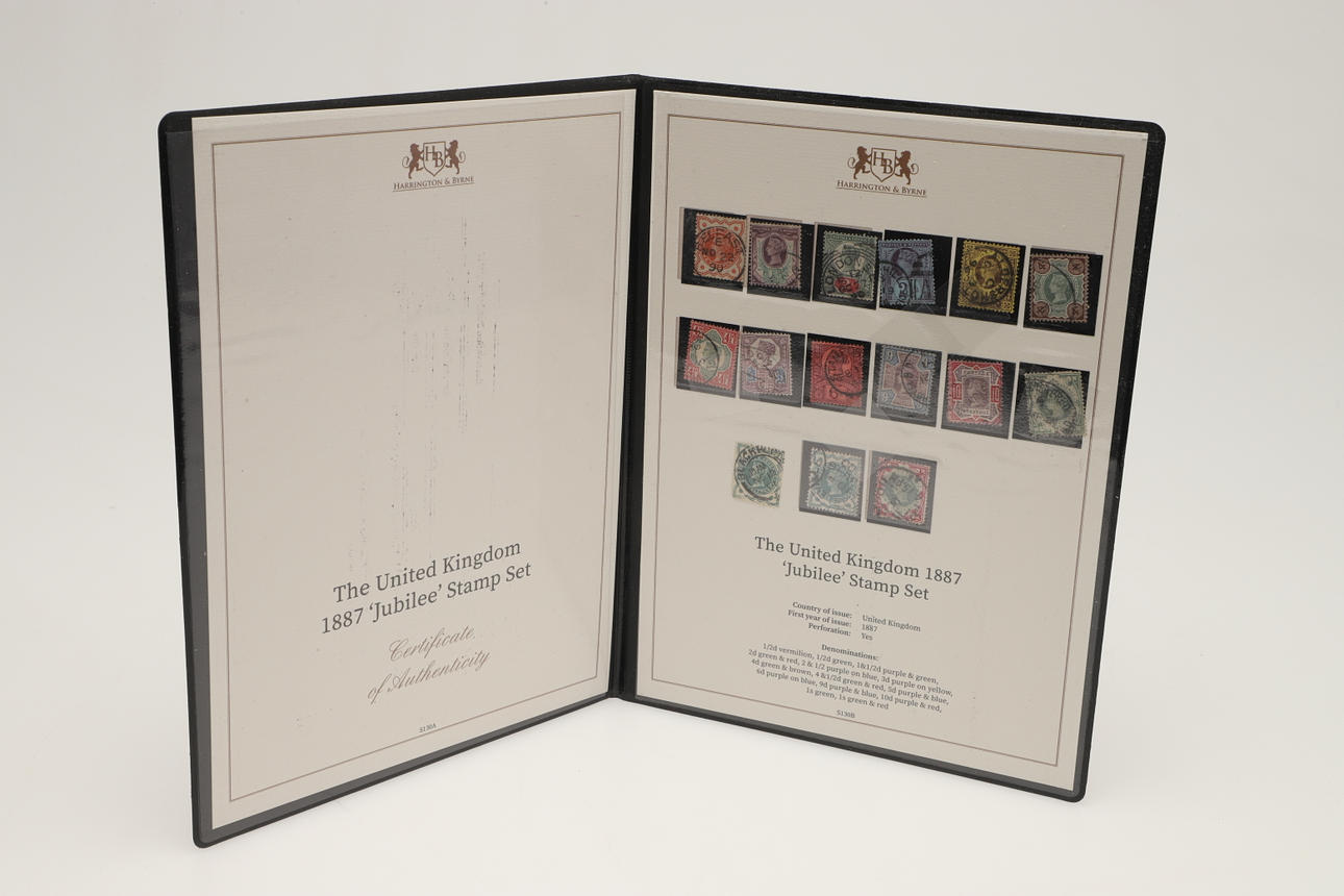 12 sets of Great Britain stamps, issued by Harrington & Byrne in booklets. Including King George V Definitive stamps, QV Lilac & Green stamps, QV 1887 stamp set, Festival of Britain 1951, George VI Definitive stamps, Edward VII including used £1 stamp, QEII Wilding Stamps, Overprinted Officials and others. (12).
