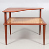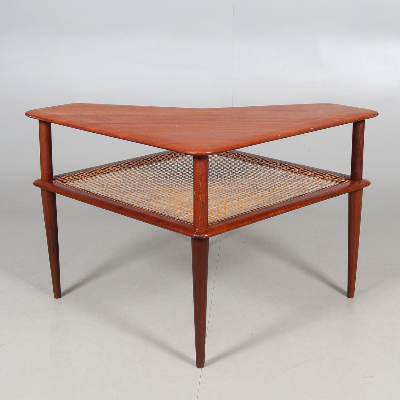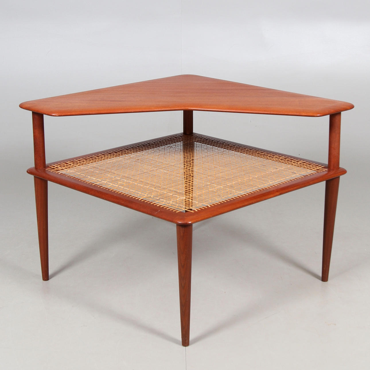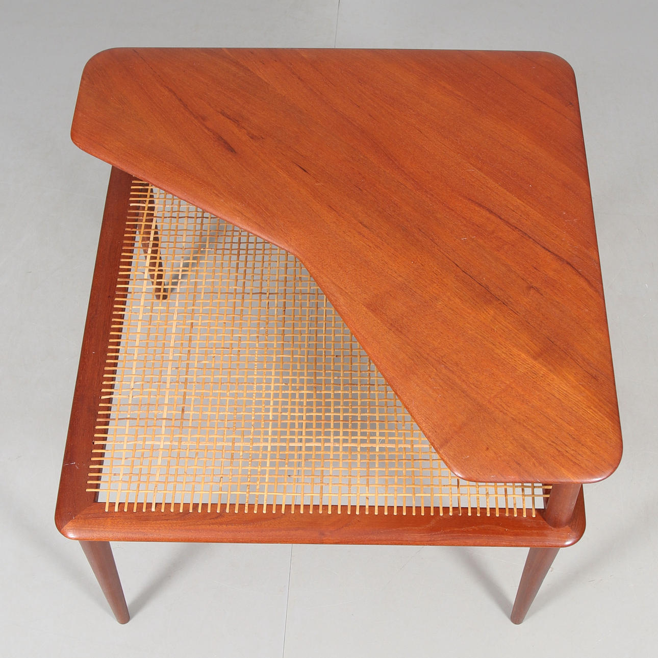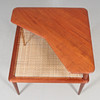 Frame and table top made of teak, wicker bottom shelf. Length 78, width 78, height 60 cm.
