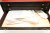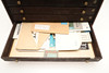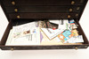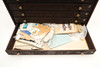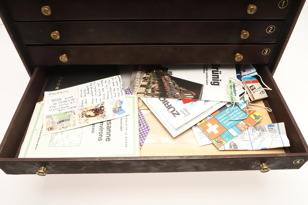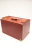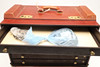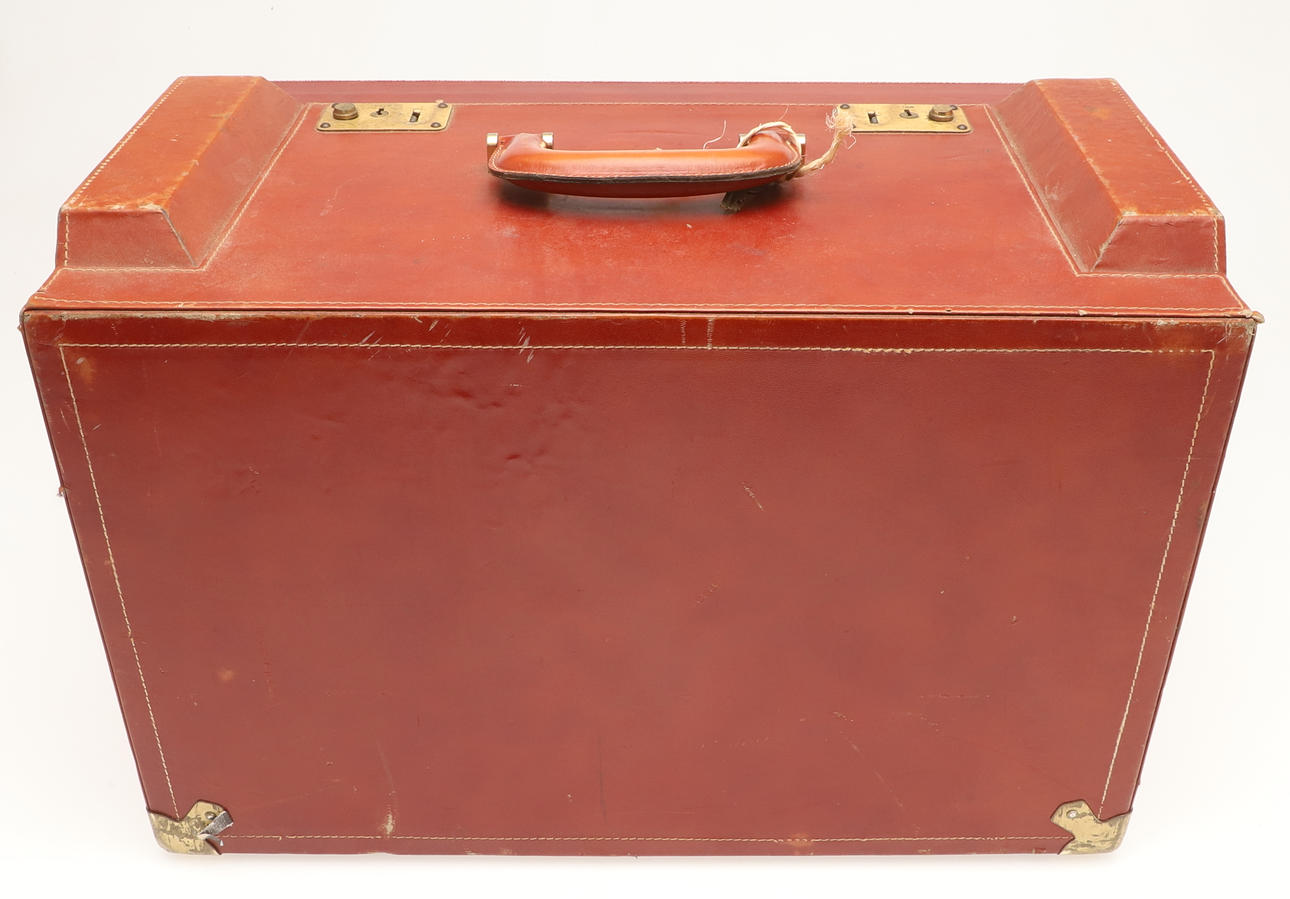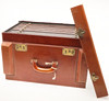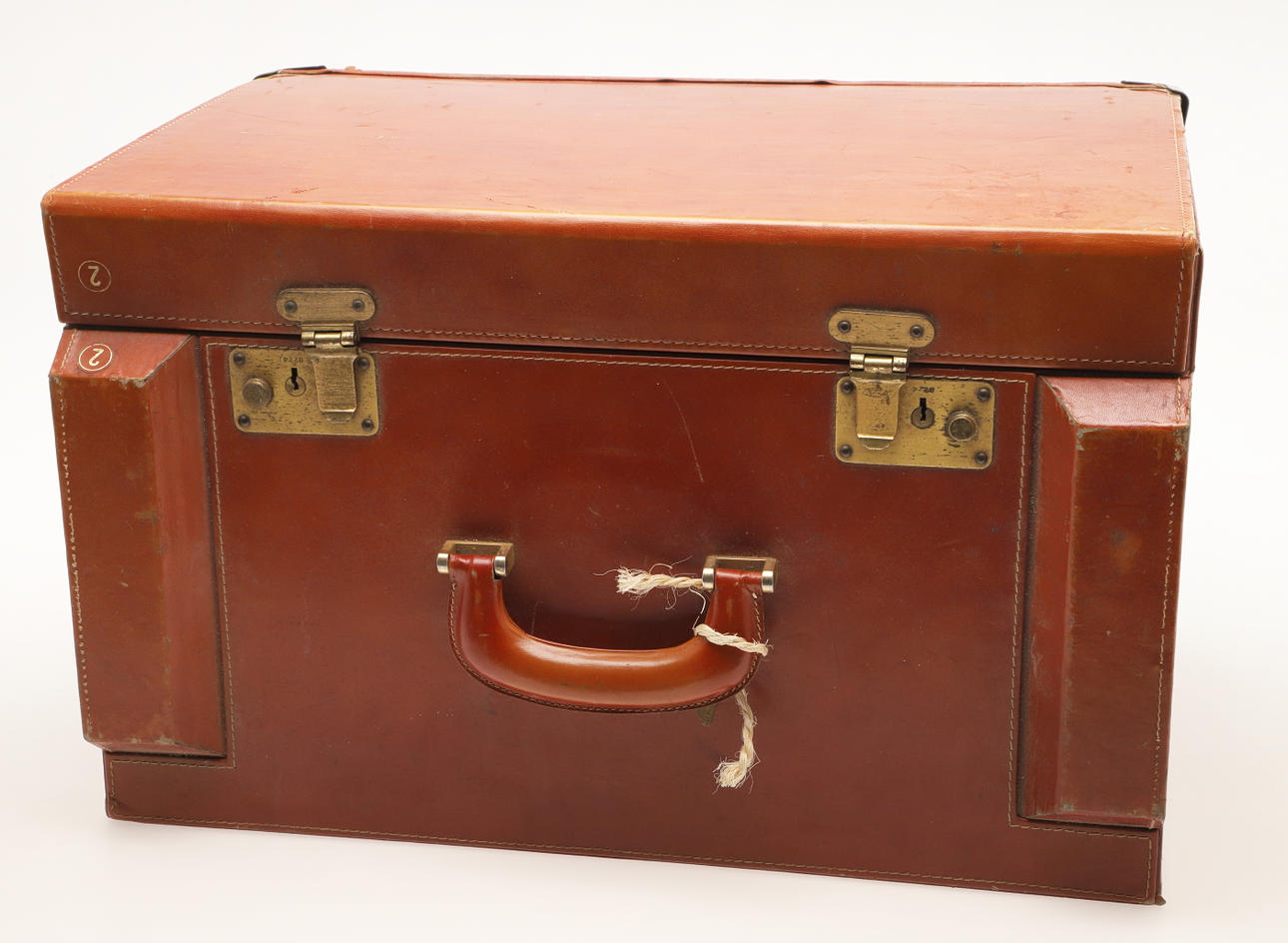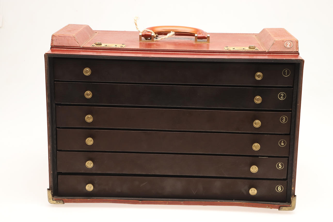 An unusual leather case, probably bespoke made. With six internal drawers to hold collectables, the front of the case is removable to access the drawers. Case 48.5cms by 32cms, by 32cms.