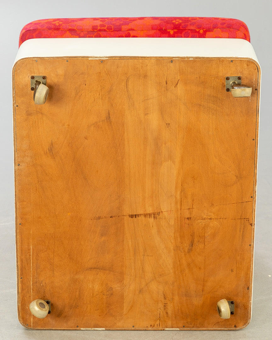 Composed of 3 armchairs, a stool and a table. Armchair elements can be connected together. Table with folding table top, storage space inside. Wooden construction, painted white, upholstered and covered with fabric. All items on wheels.