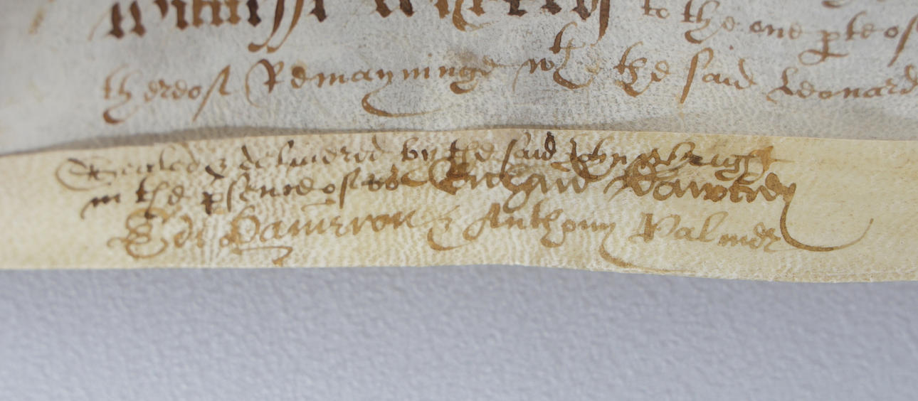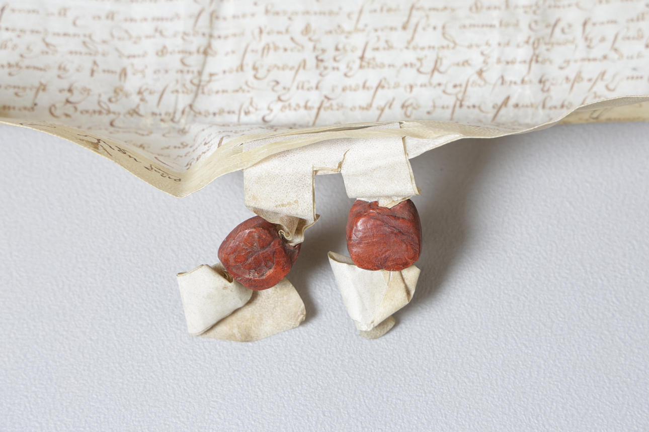 The document dated the fourth year in the reign of Lord James, the document between Leonard Eyllott of Bury St. Edmunds in the county of Suffolk and John Wright, with two red wax seals, 50.5cm wide, 42.5cm high approx.