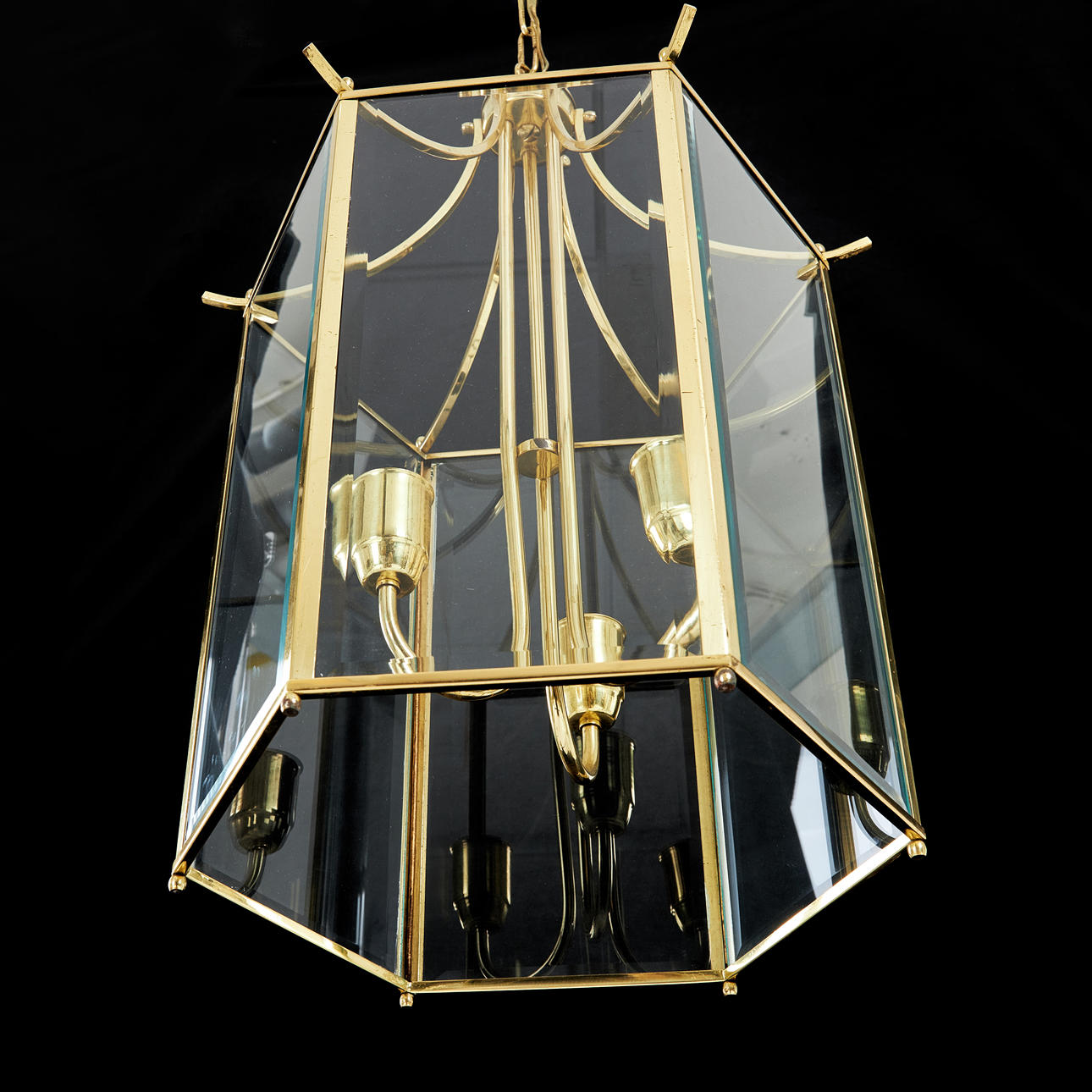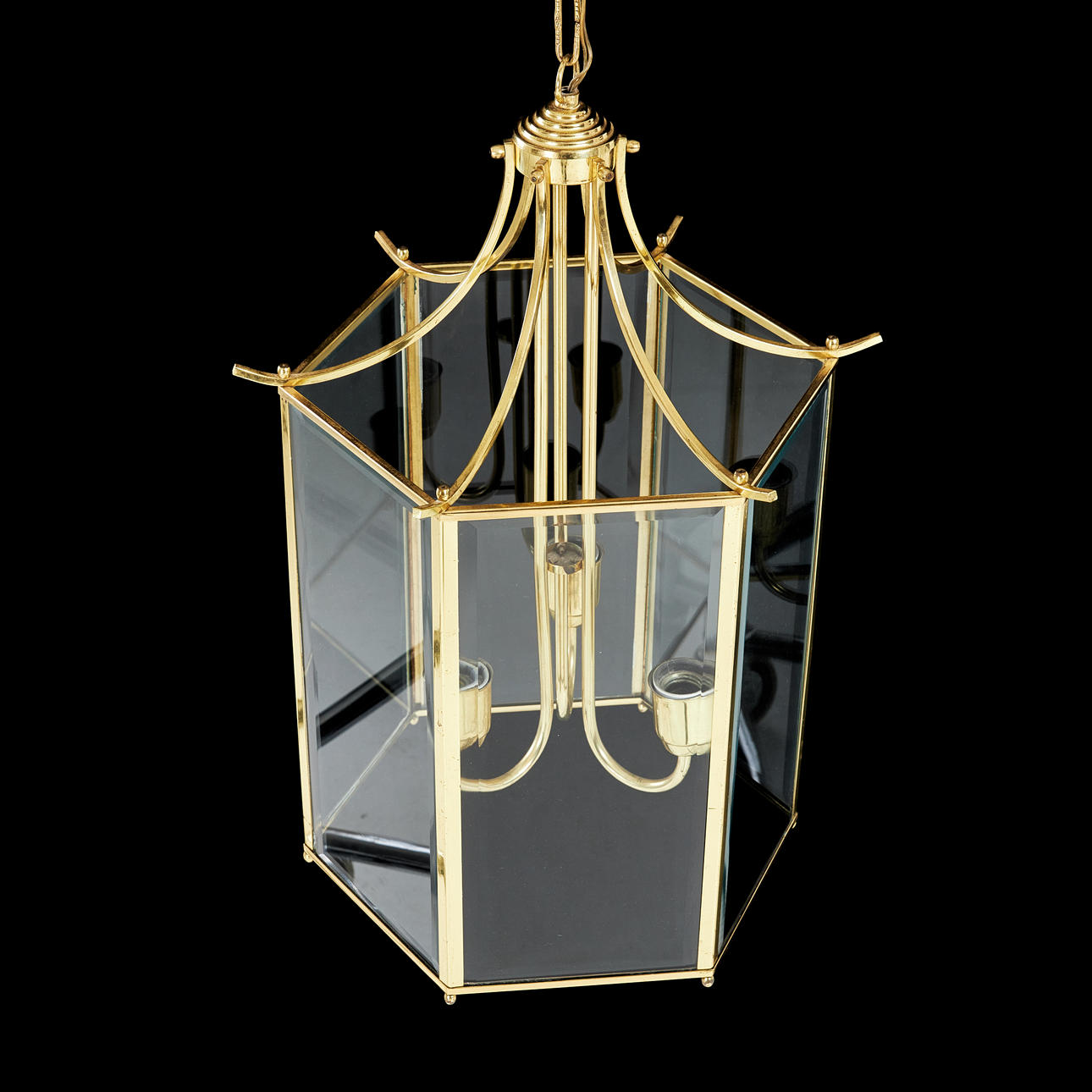 4064216. A ceiling lamp, so called Bellman's lantern, model Type 500, hexagon shape, glass, brass, second half of the 20th century, made of Classic Lanterns, three light points.