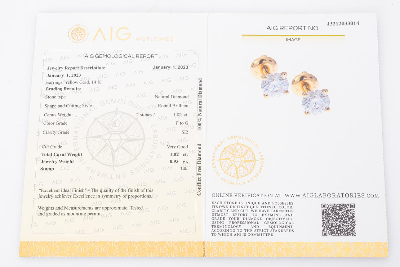 A pair of solitaire earrings made of 585 gold, set with diamonds totalling approx. 1.02 ct. Colour: Top Wesselton (G), Clarity: SI. Total weight approx. 0.9 grams Certificate included.
