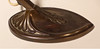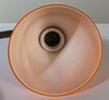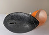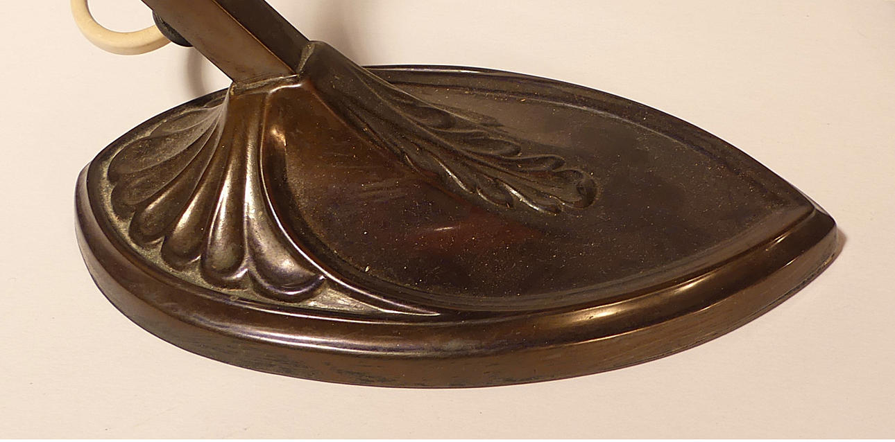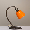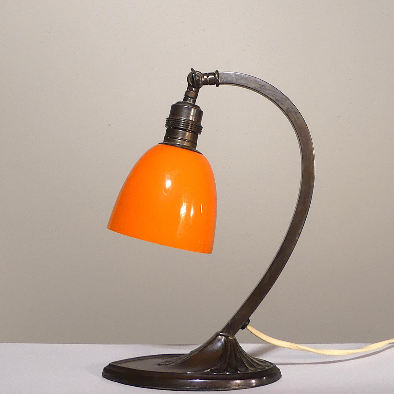 Foot in brown patinated metal with ornamented decor. Cup in orange and white glass.