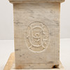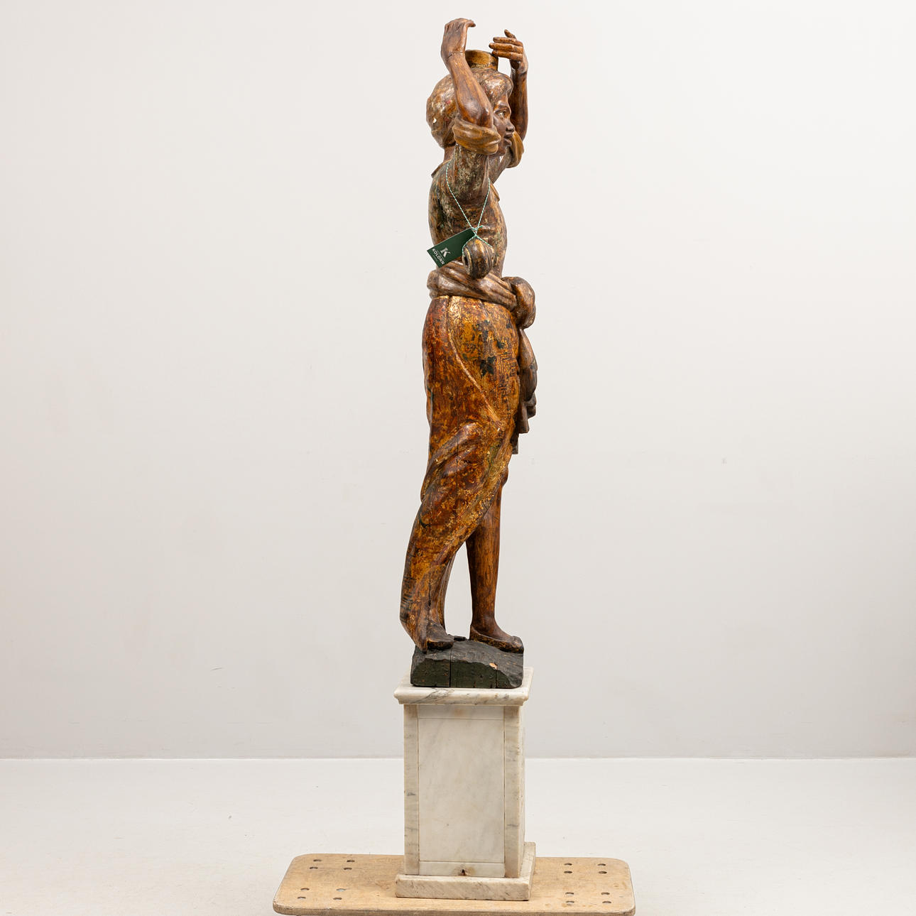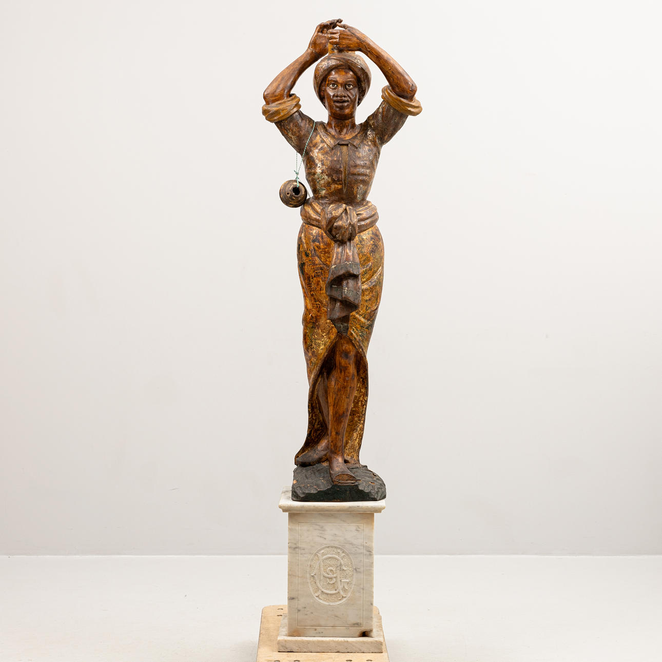 Torchbearer of painted wood on marble plinth, sustained mug on head.