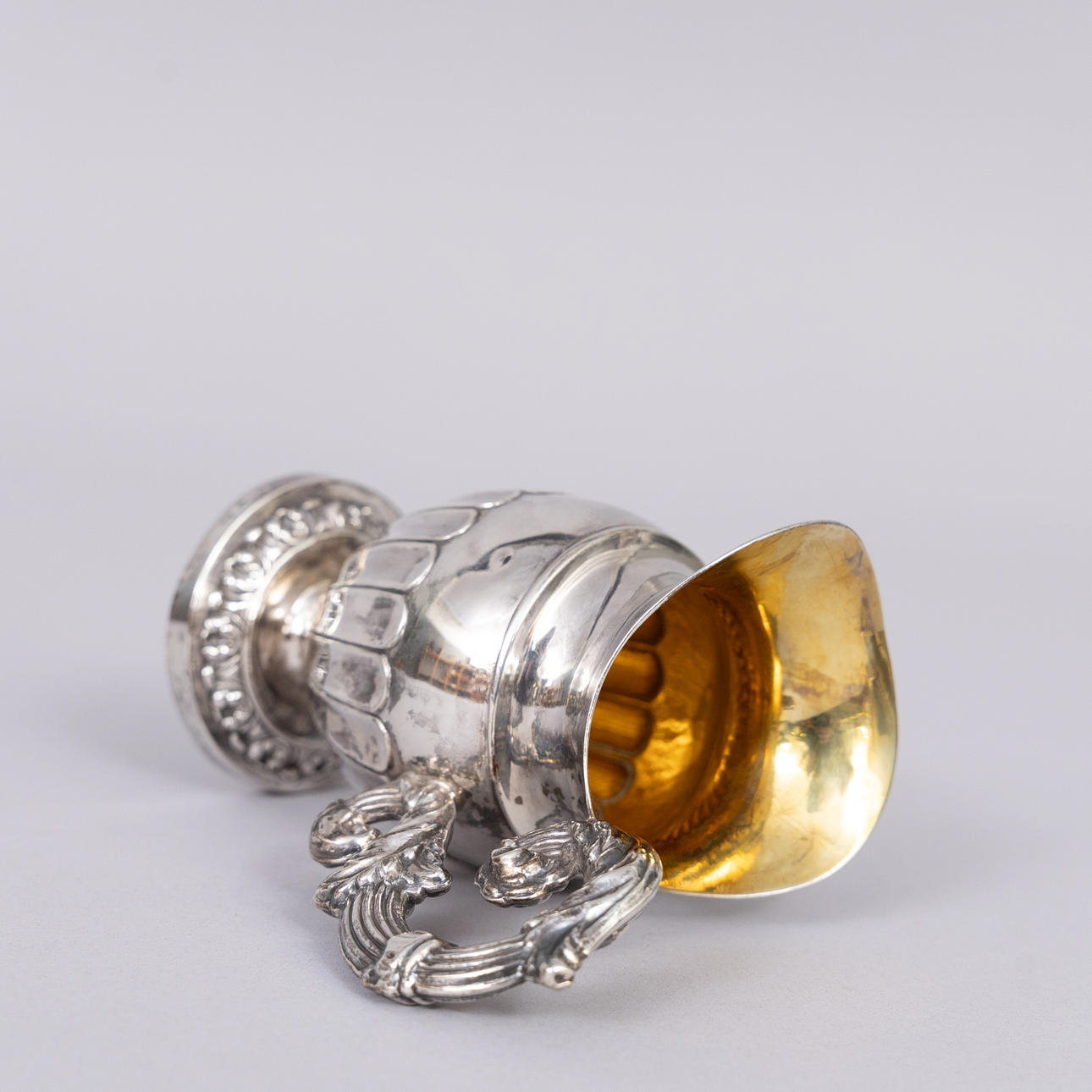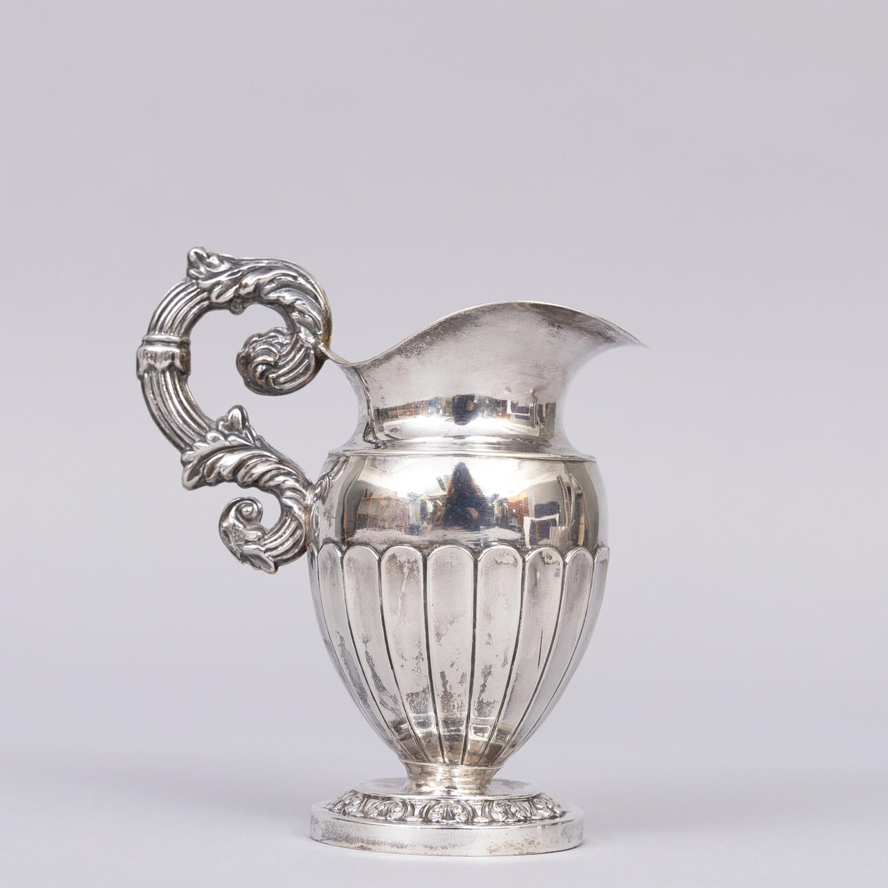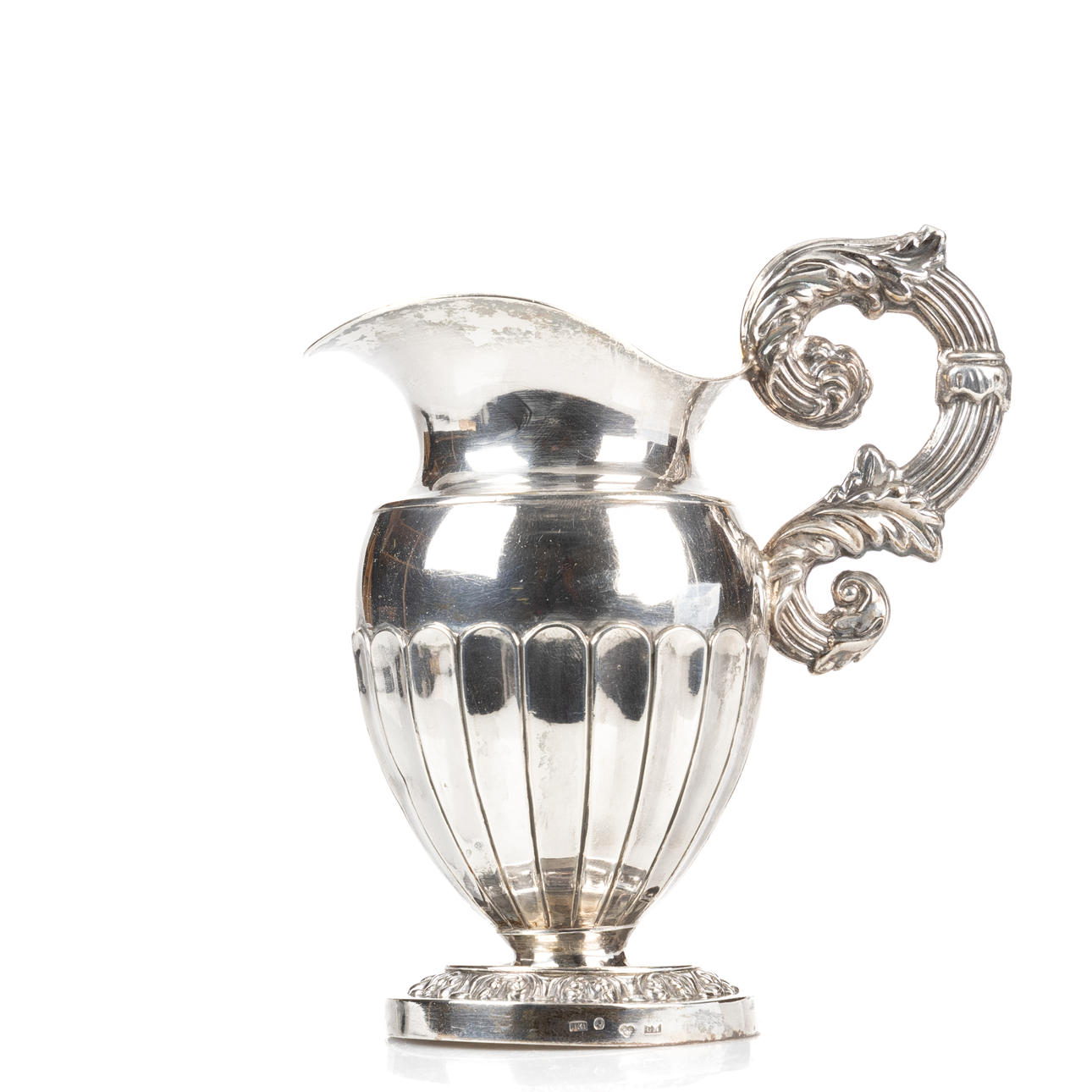Silver cream jug with gilt inside by Gustaf Möllenborg, Stockholm, 1838 Stamped GM, H4, cat's foot Height 15 cm Weight 194 grams.