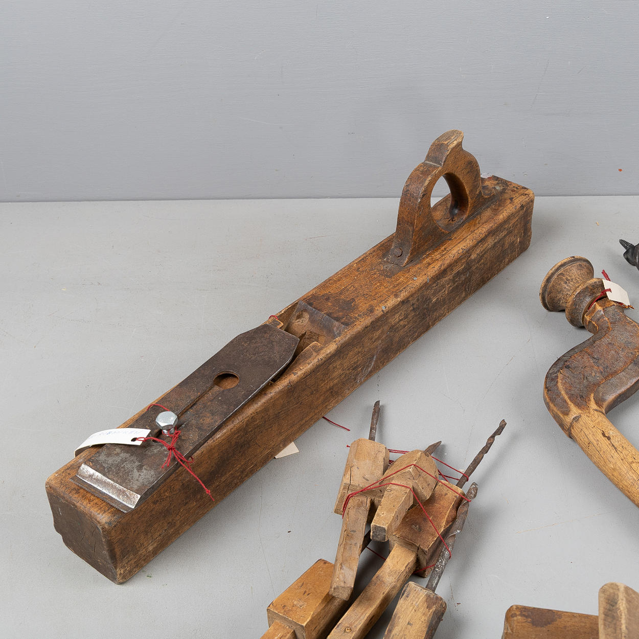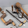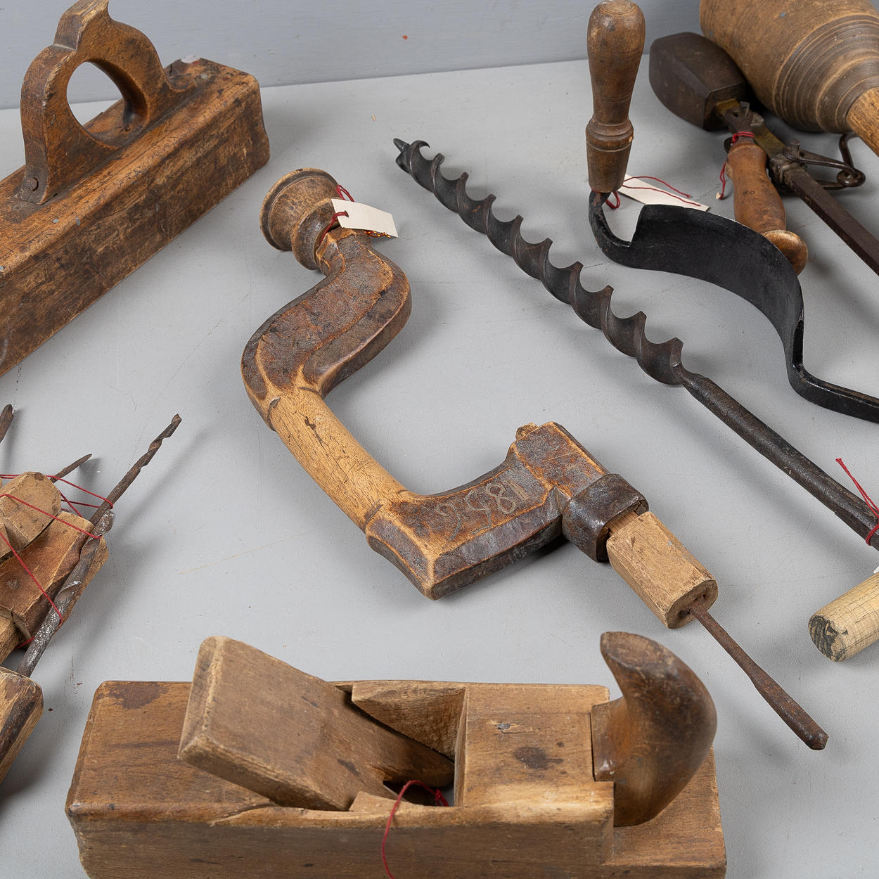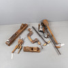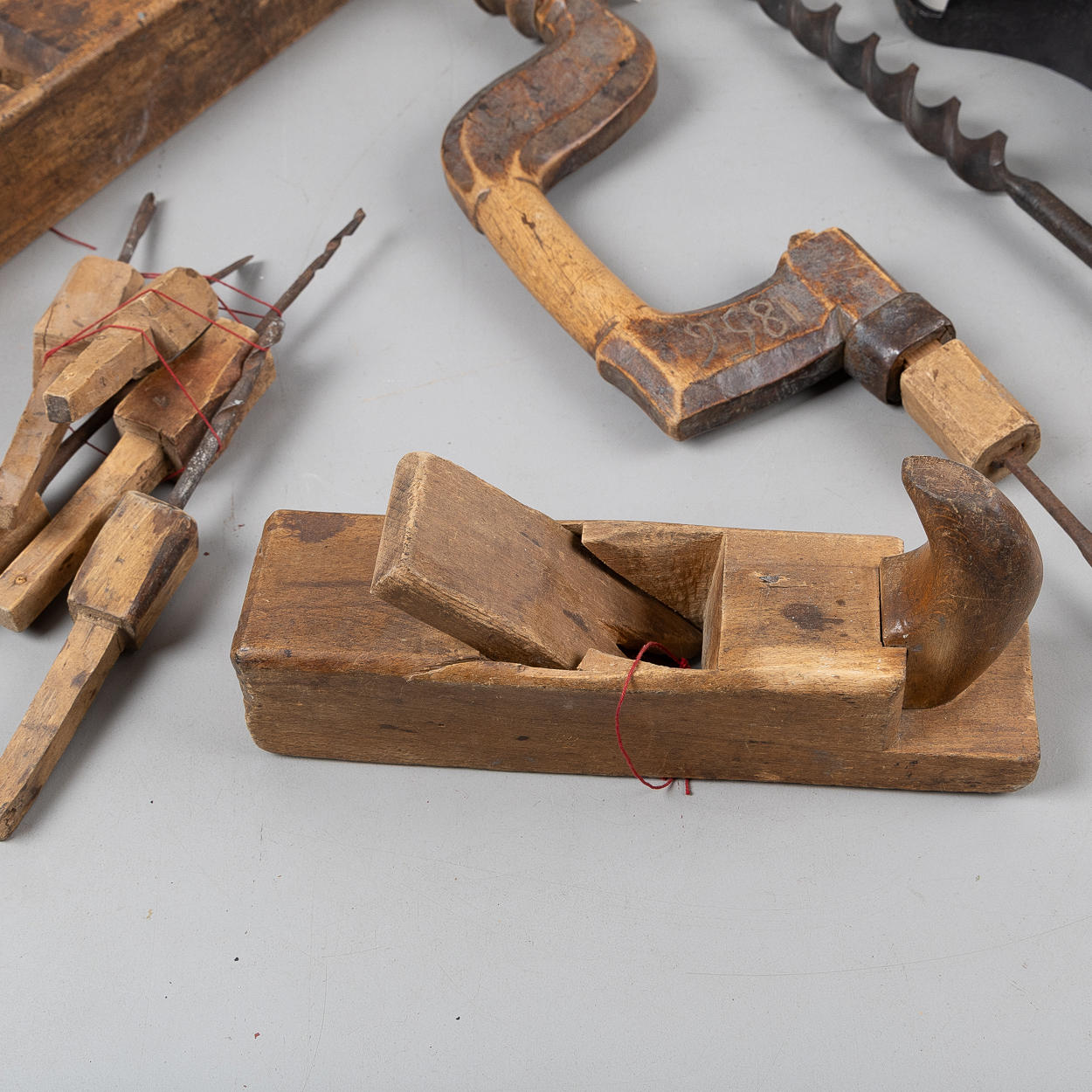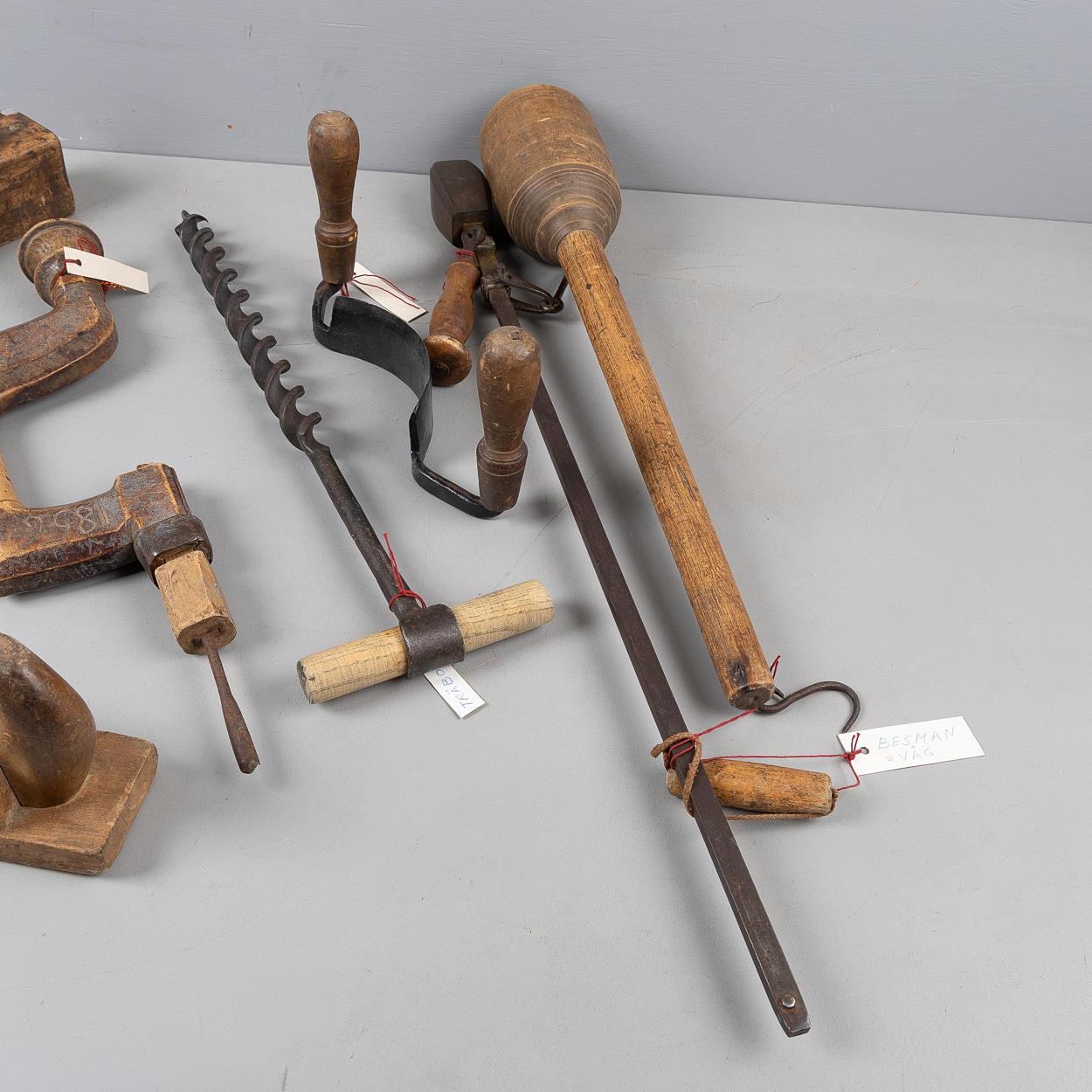 Besman, scale, wood drill, drill bit, 5 pcs drill bit, 2 planing iron, bark scraper and cast iron glue melter 'Fanner Manufactoring Co' USA.