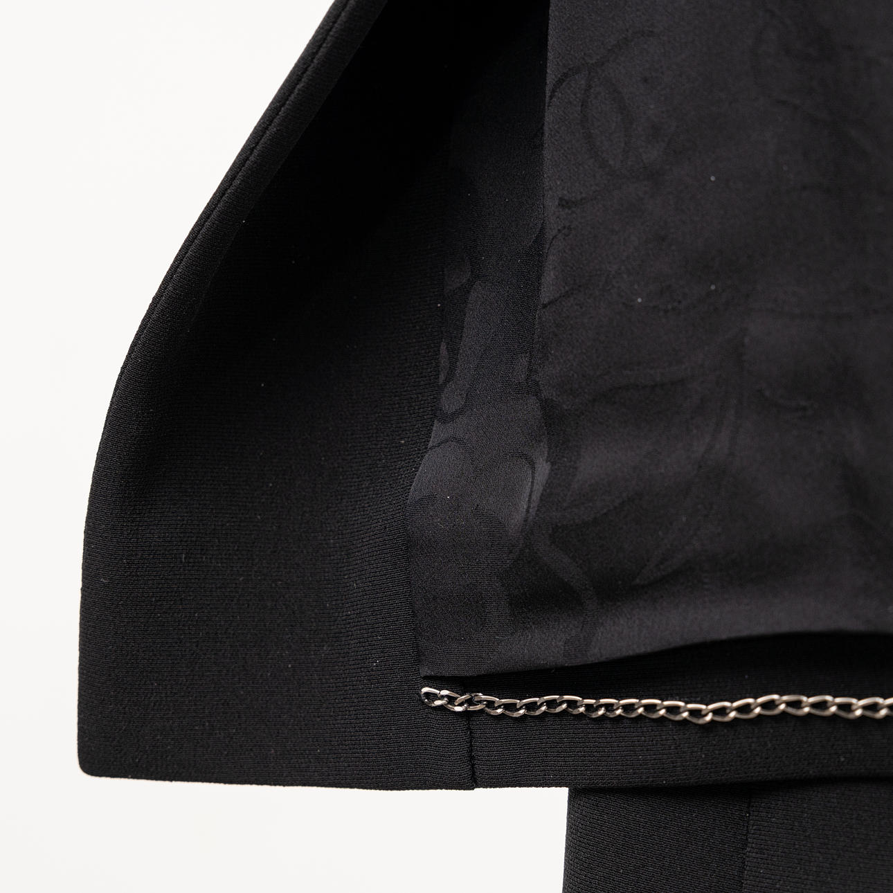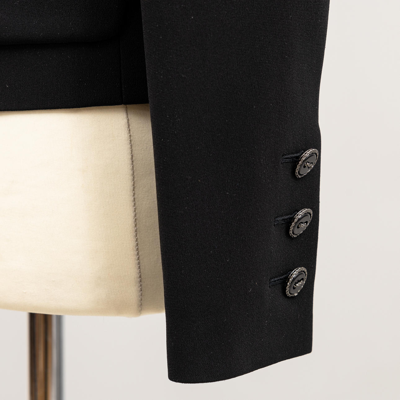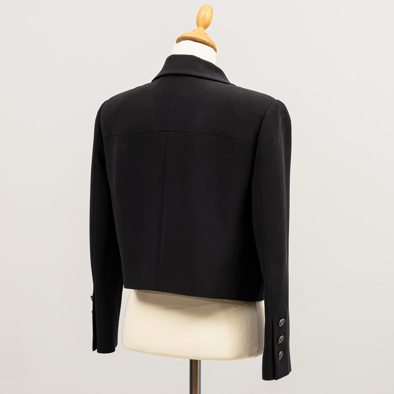 Short waist jacket in black silk with lapel and two small front pockets, cuffs with three buttons. Fully lined with black silk, hem with classic silver patinated Chanel chain. Label marked CHANEL and according to label French size 42.