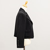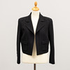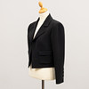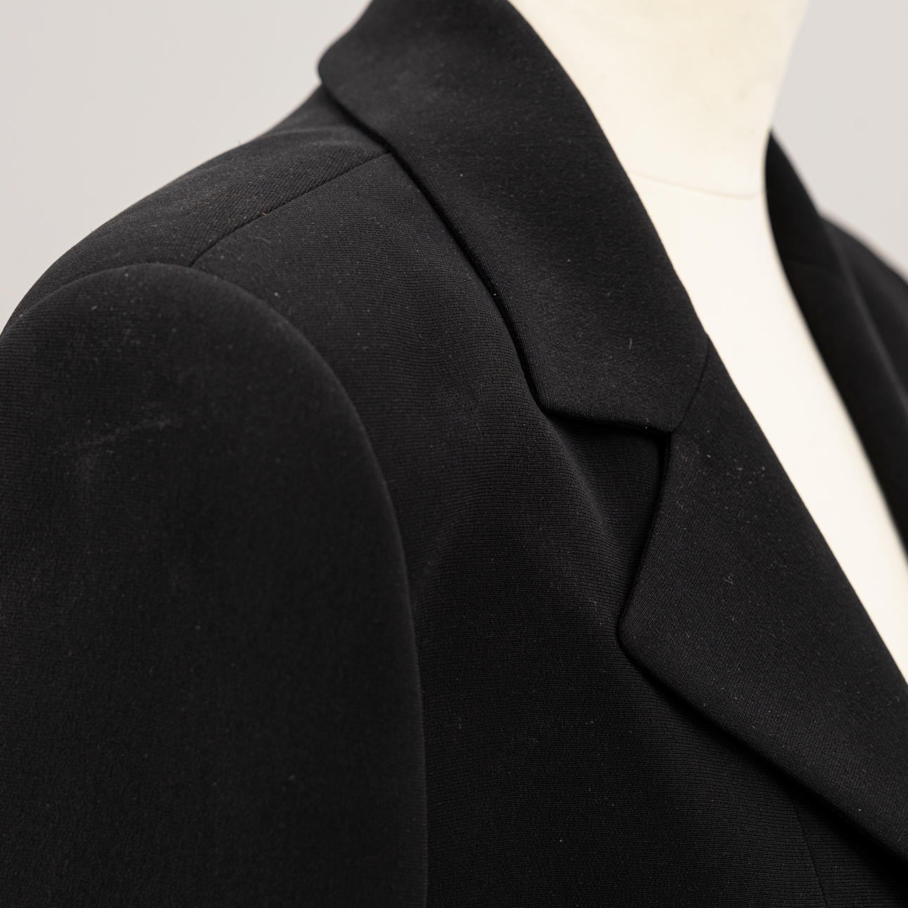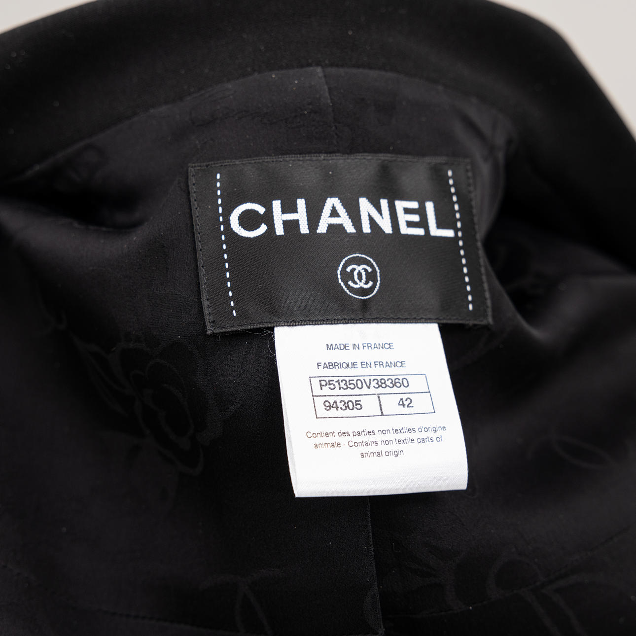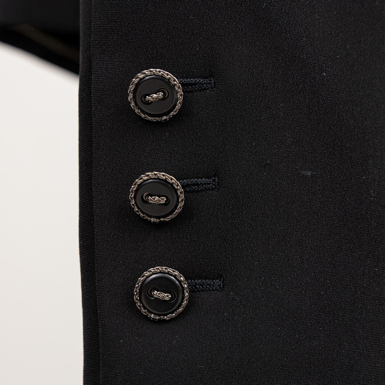 Short waist jacket in black silk with lapel and two small front pockets, cuffs with three buttons. Fully lined with black silk, hem with classic silver patinated Chanel chain. Label marked CHANEL and according to label French size 42.