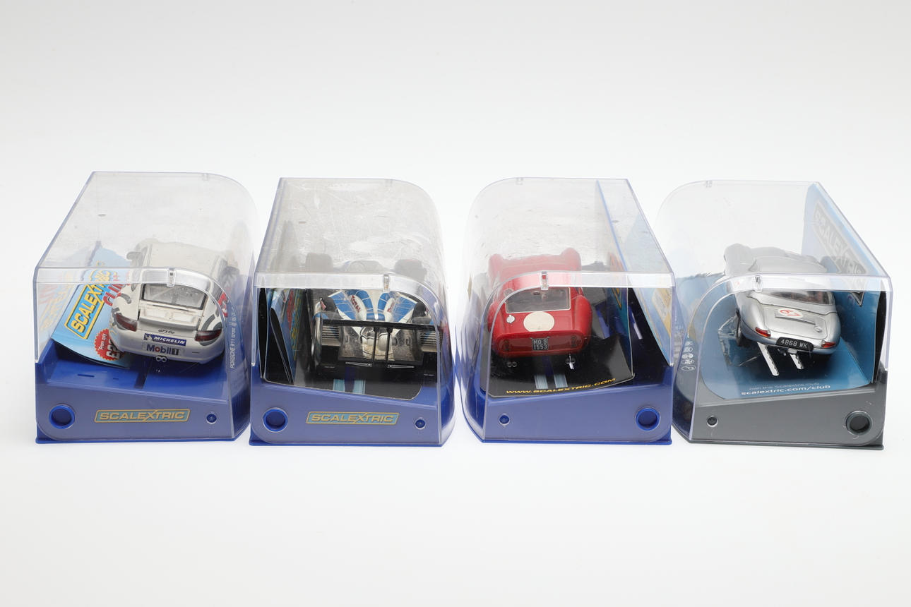 Four boxed cars including Peugeot 908 HDI, Jaguar E Type, Porsche 911 GT3R, and Ferrari 250 GT0. (4).