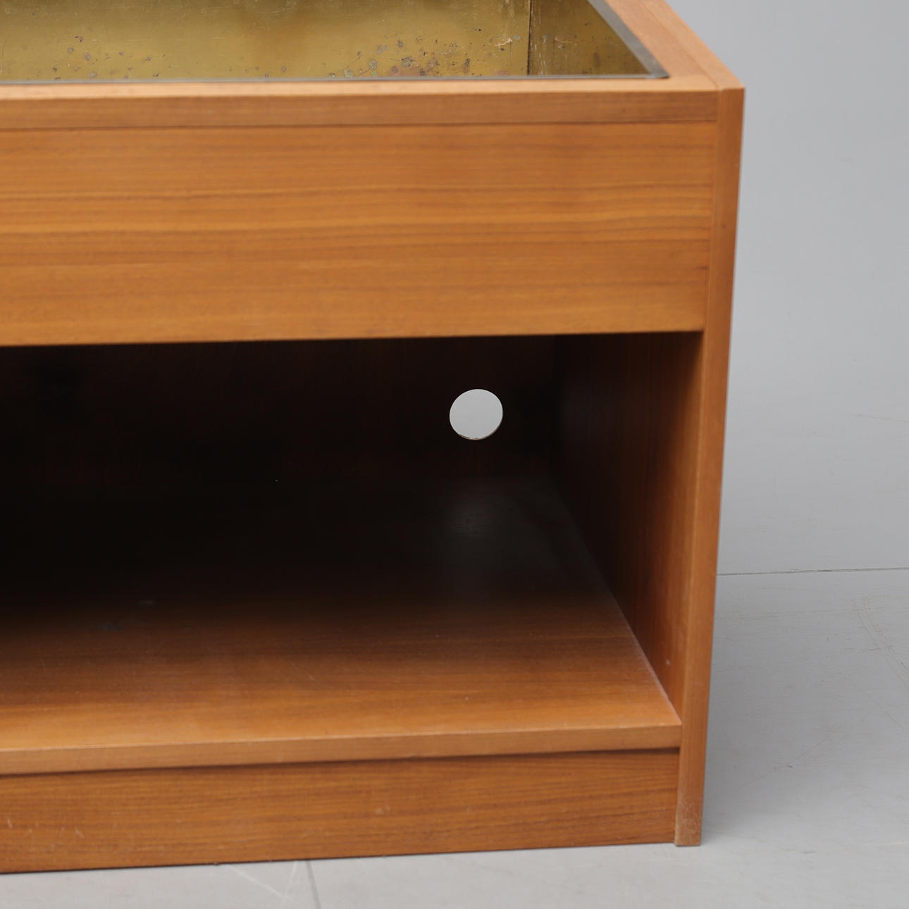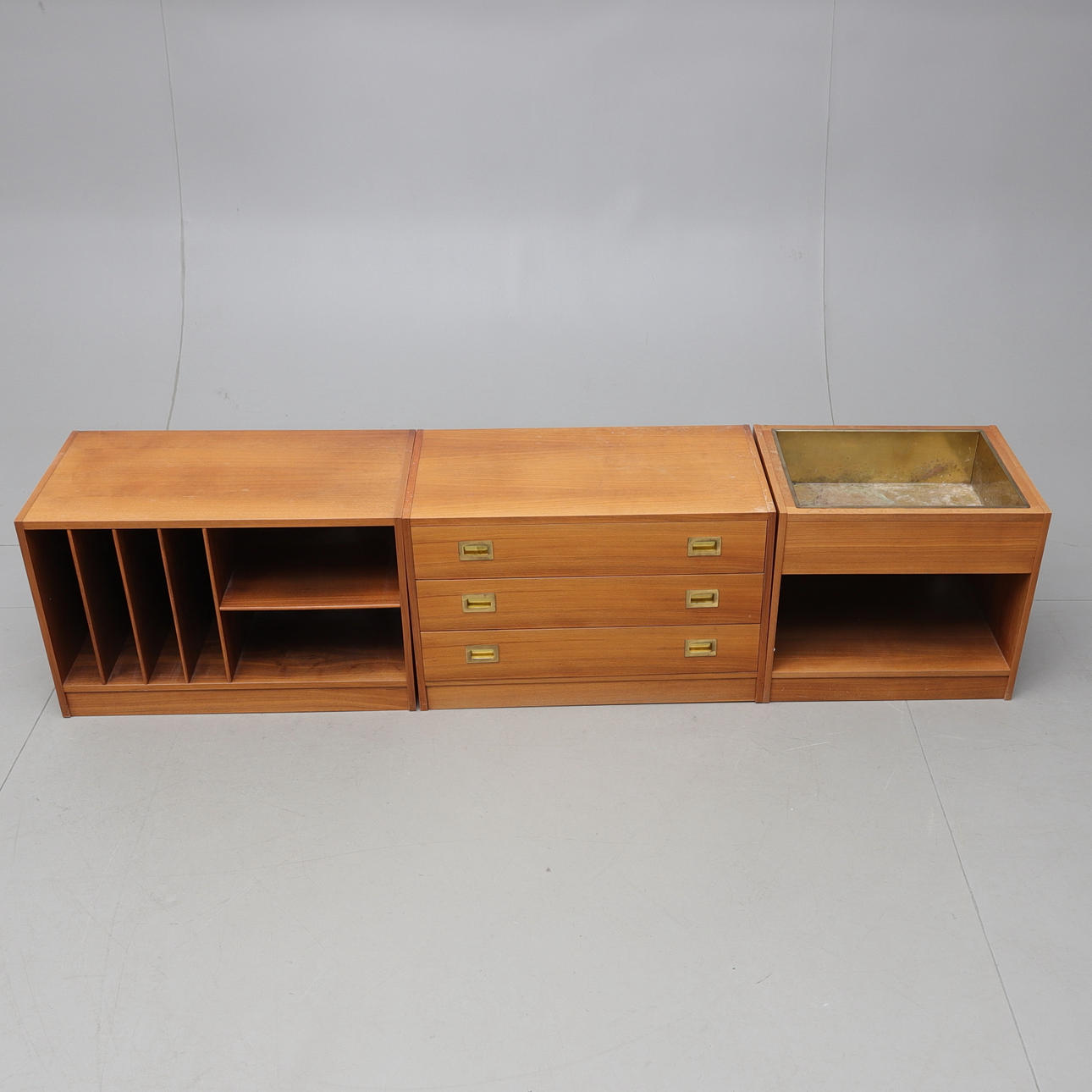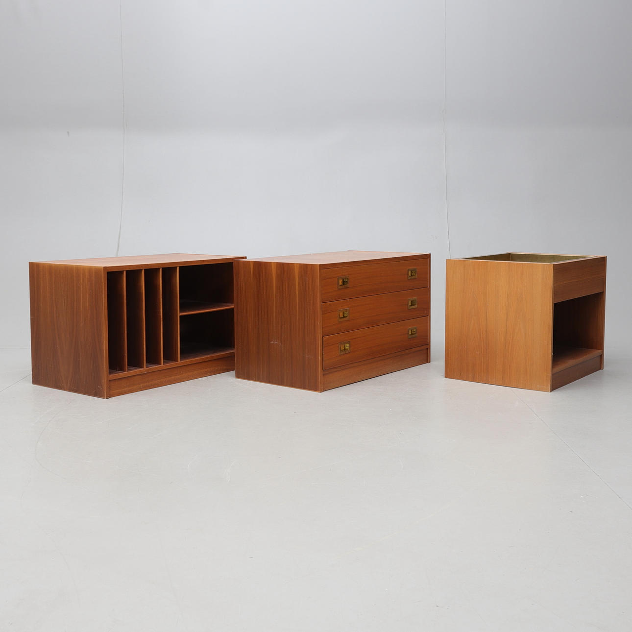 Veneered md walnut. Three modules, one of which is a chest of drawers, length 80, width 46, height 50 cm. Stereo bench, length approx. 80, width 46, height 50 cm. Flower table with brass insert, length approx. 60, width 46, height 50 cm.