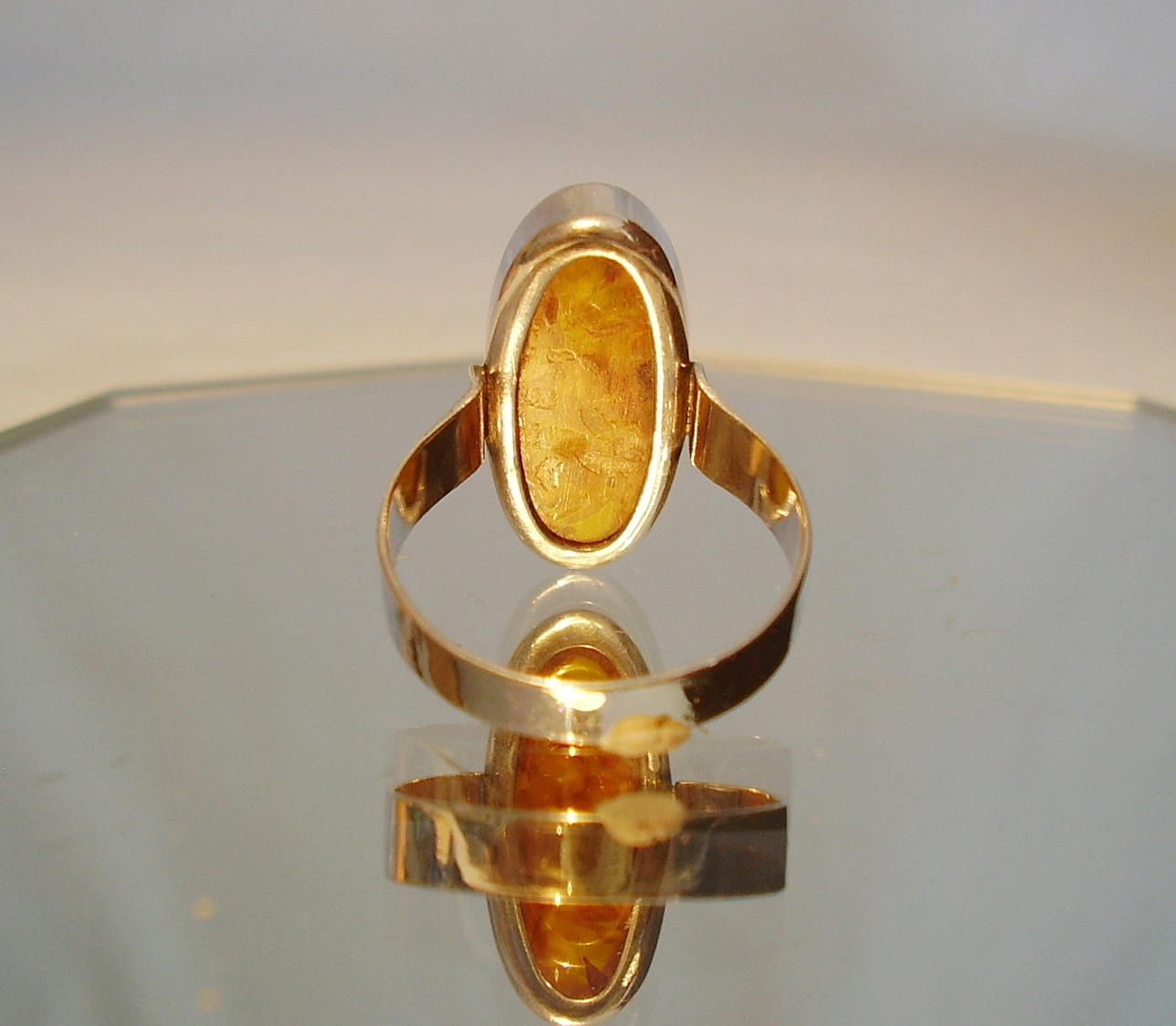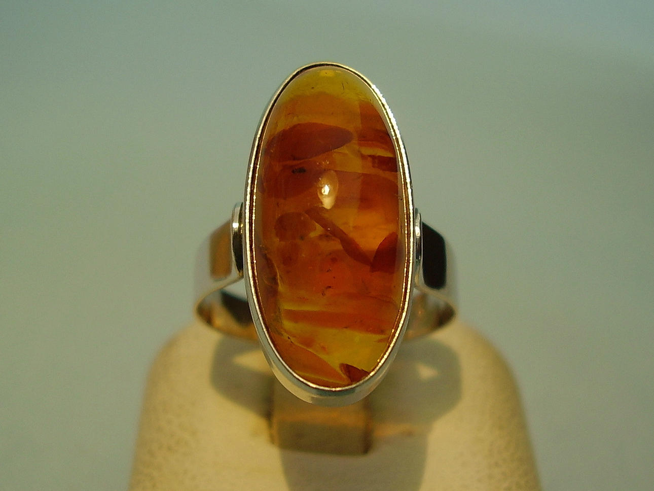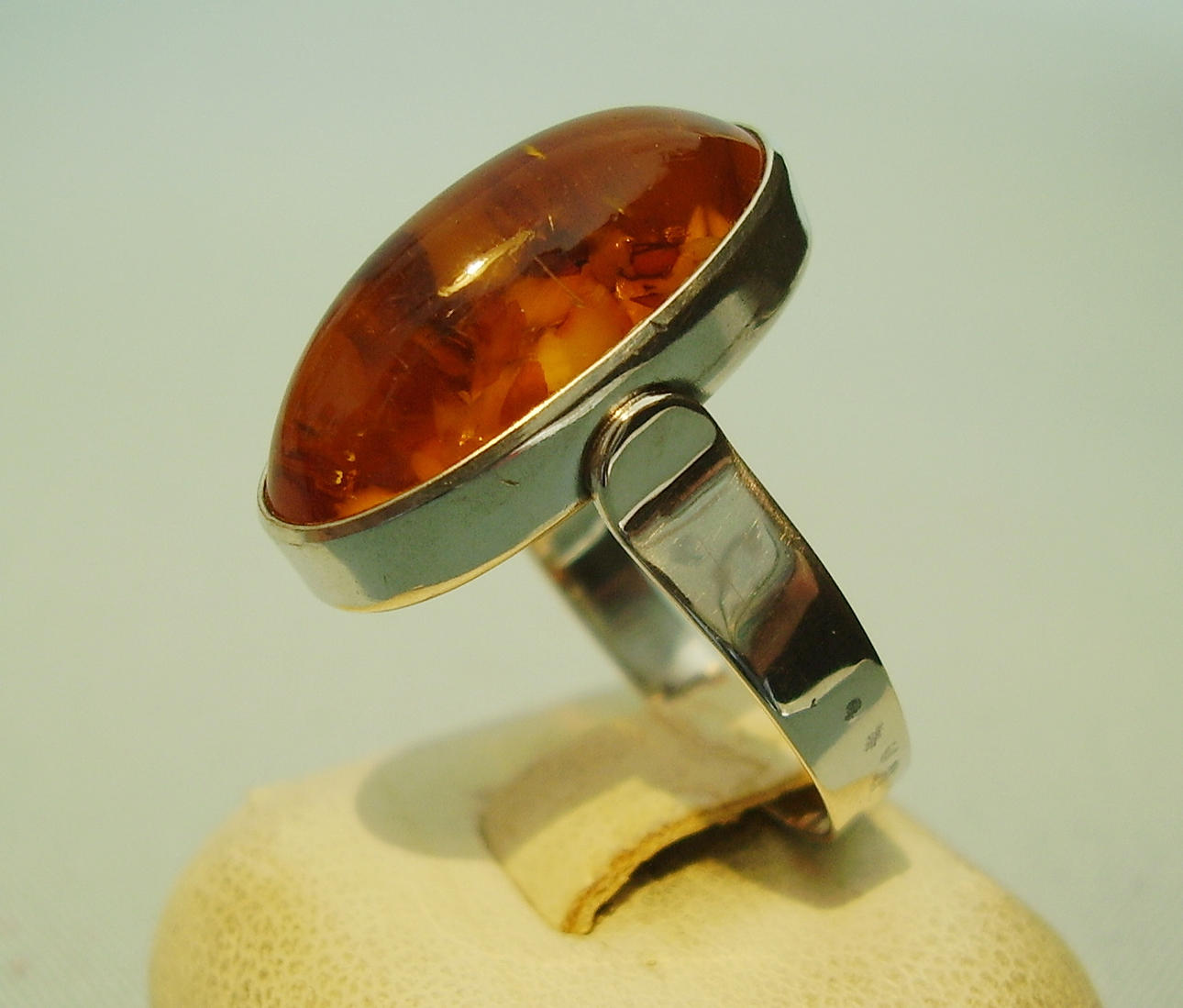 Inner diameter of the ring band 17.1 mm = ring size 55, ring head 20 x 11.1 mm, amber 18.2 x 8.6 mm, weight 2.8 grams.