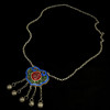 A Tibetan white metal jade and enamel amulet. Length: 39cm.