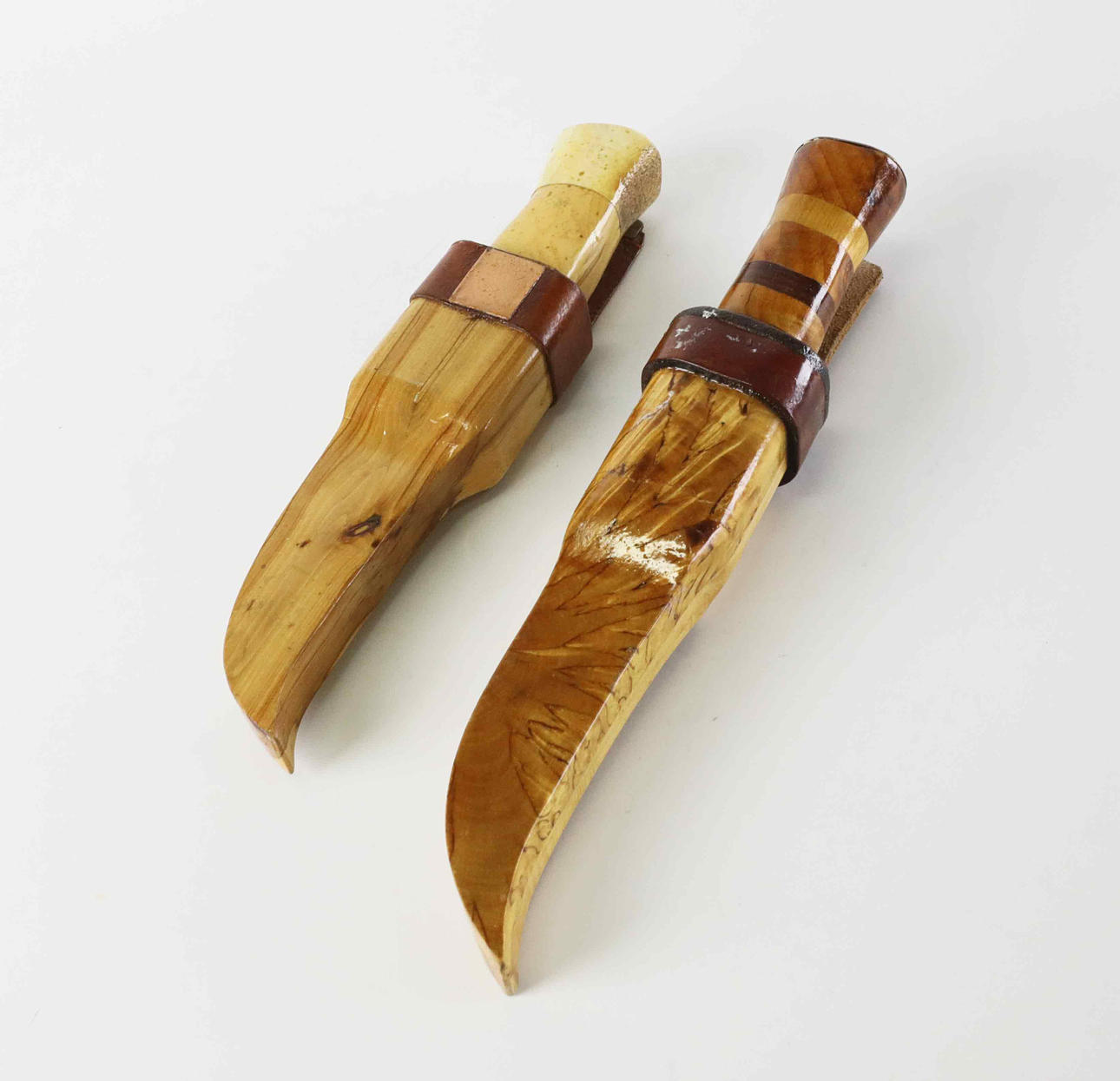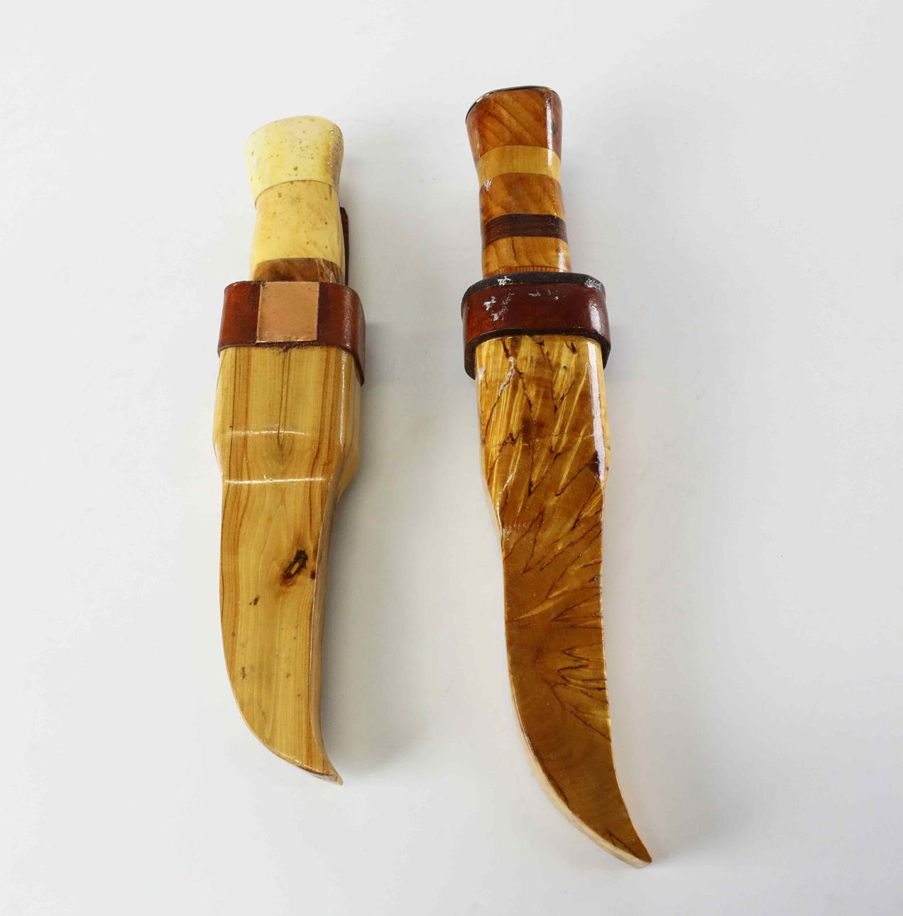 Slides in wood, knife blade stainless steel KJ Mora. Lengths 23 0ch 27 cm in total.