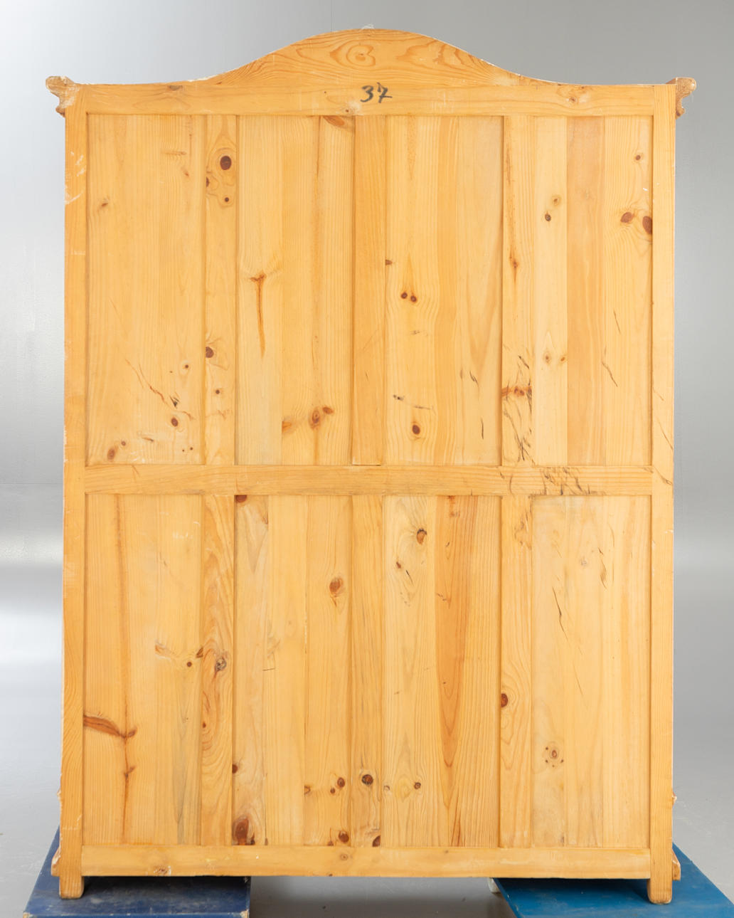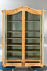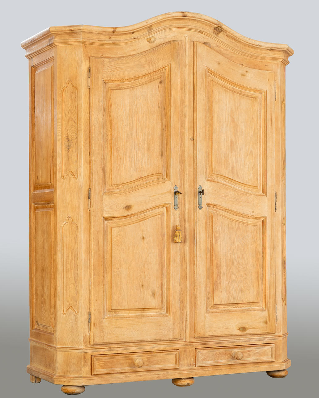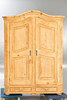 Softwood body, light stained, partly oak veneer. Inclined pilasters, raised wreath, 2 doors with filling decoration. Painted on the inside. 1 key available.
