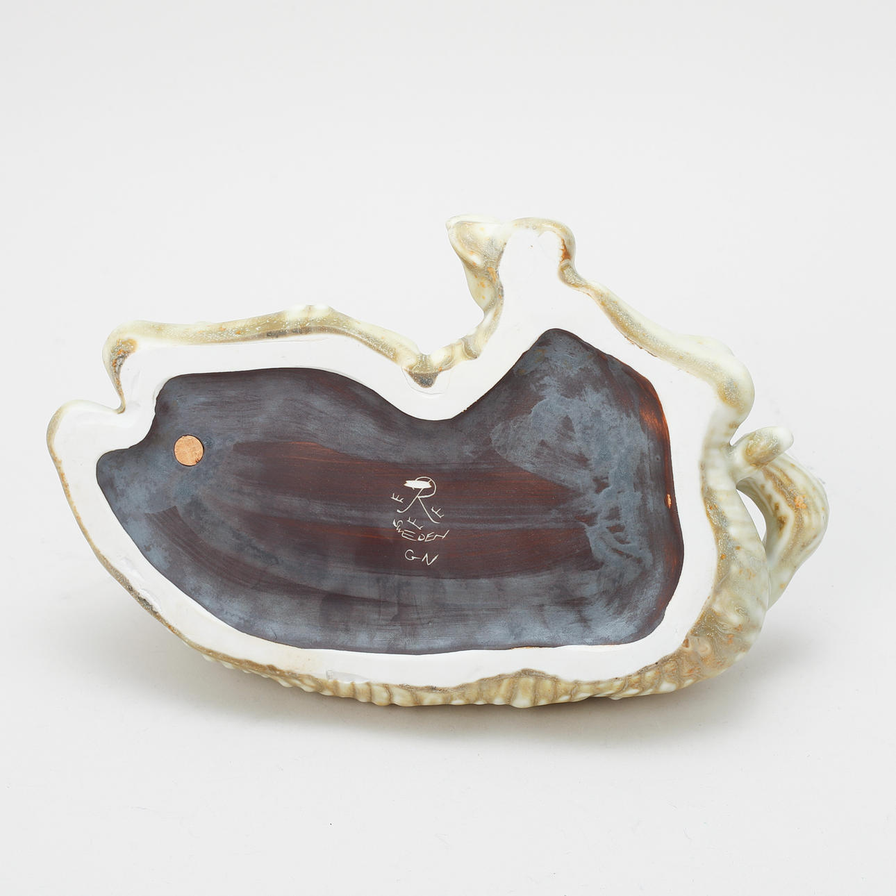 Glazed. On wooden plinth. Marked “R Sweden GN”. Length excl. plinth approx. 26 cm, height approx. 18,5 cm.