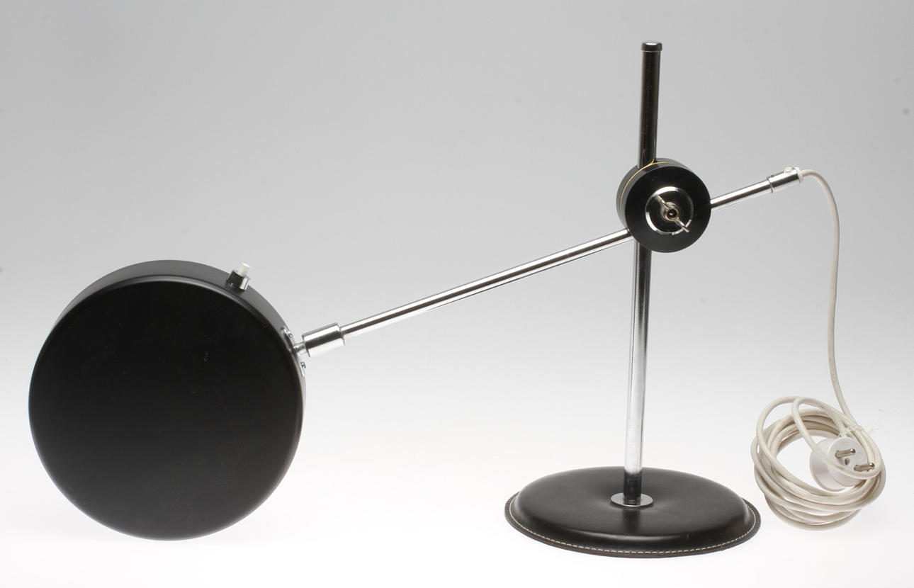 Adjustable arm. Sheet metal screen. Comed, foot covered in artificial leather.