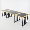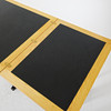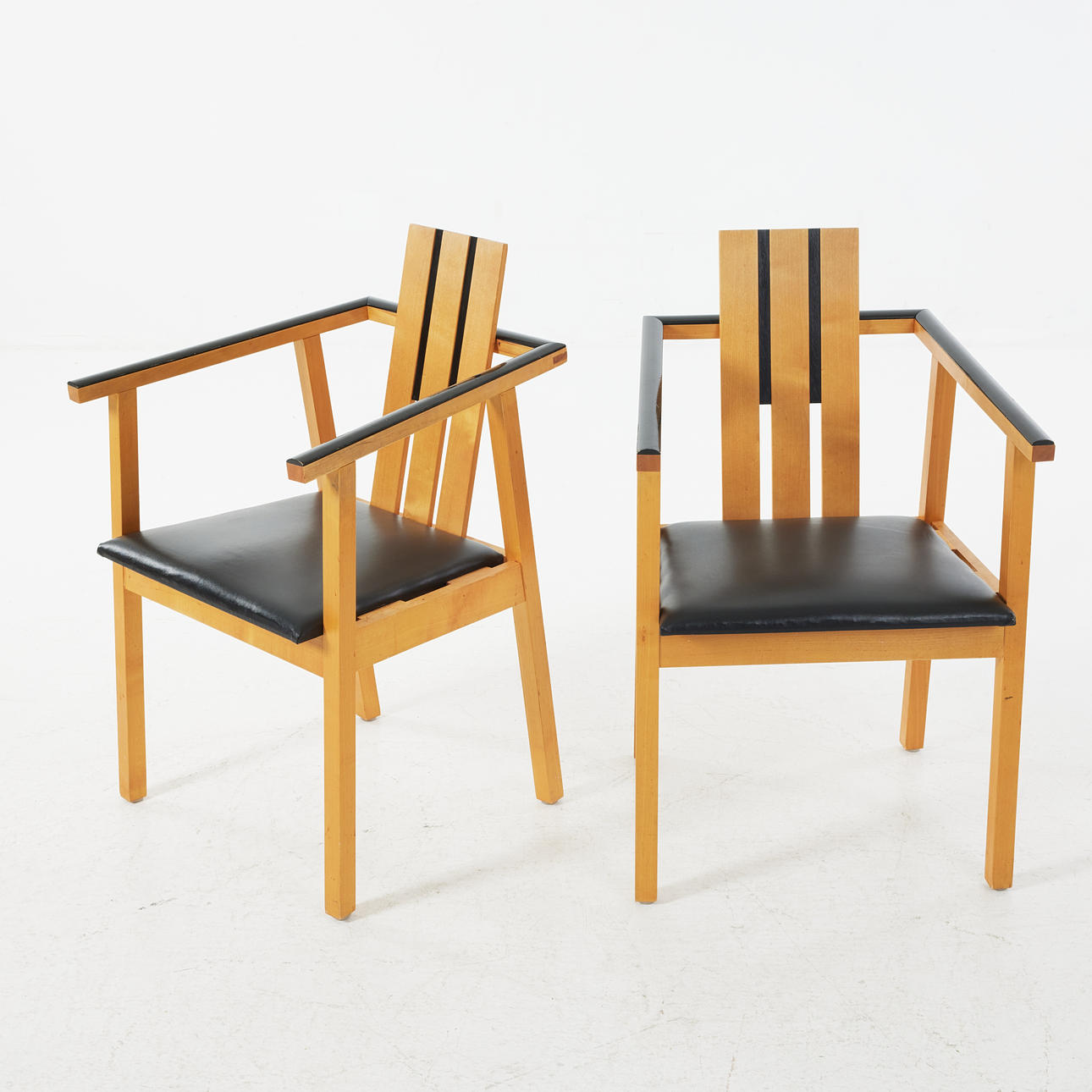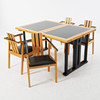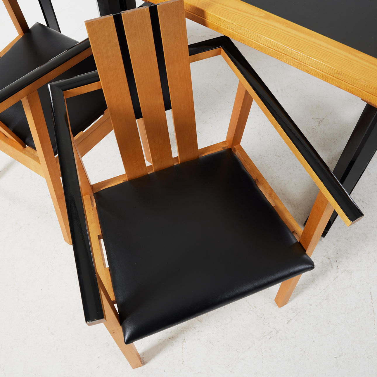 Unique and custom-made, e.g. in elm, laminate, and artificial leather, the dimensions of the chairs approx. 82, 52x53, table approx. 77,145x100 (290) cm
