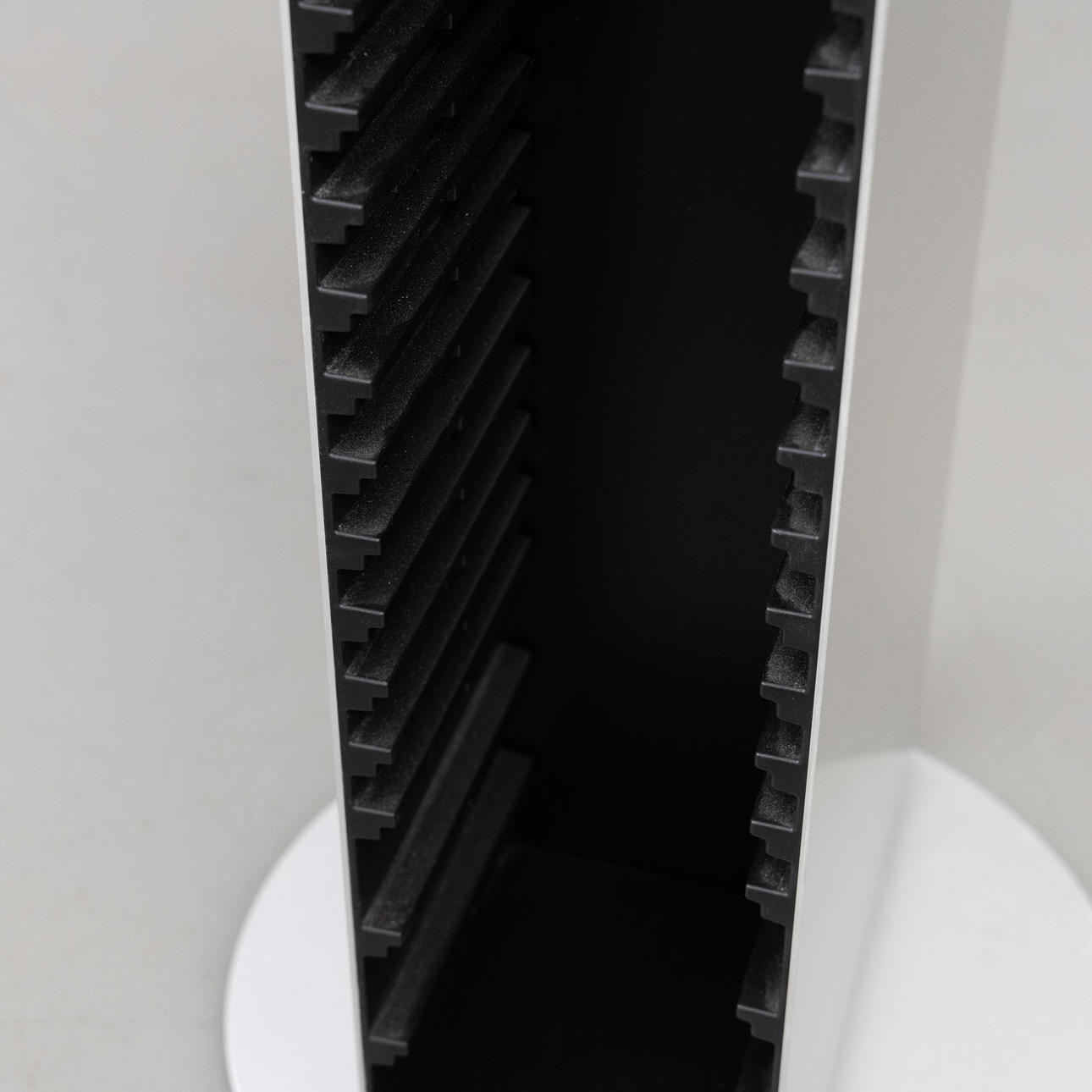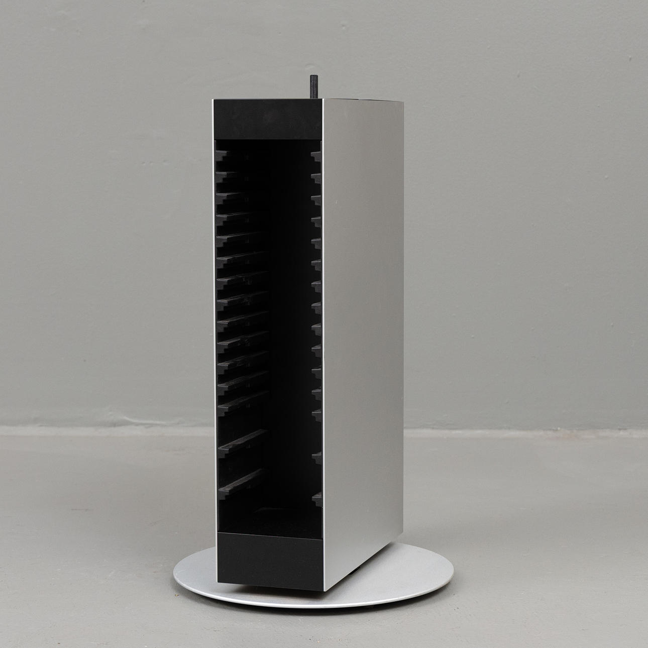 Bang & Olufsen stand with built-in CD storage, designed for BeoSound systems. Dimensions: Ø 35 cm, height 64 cm.