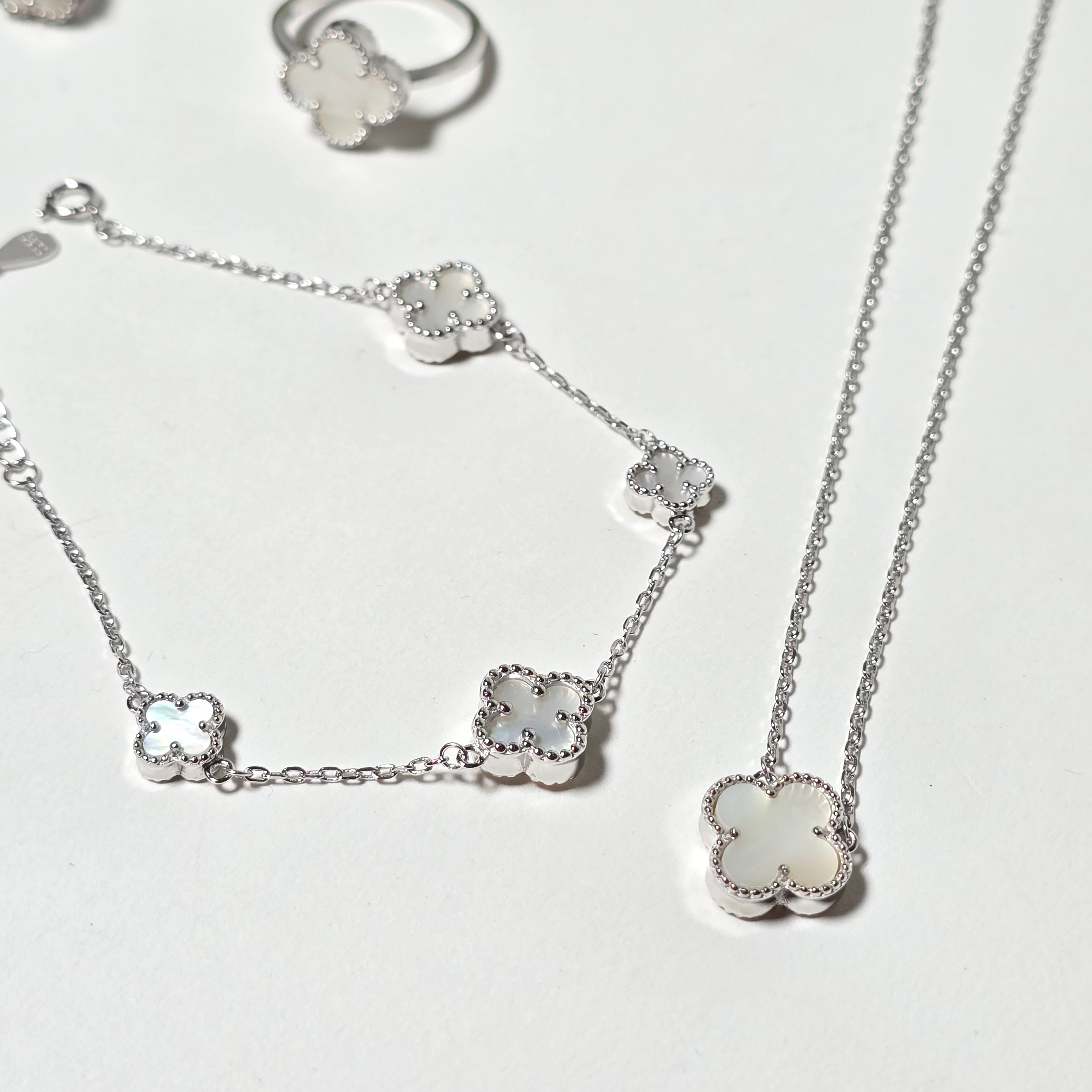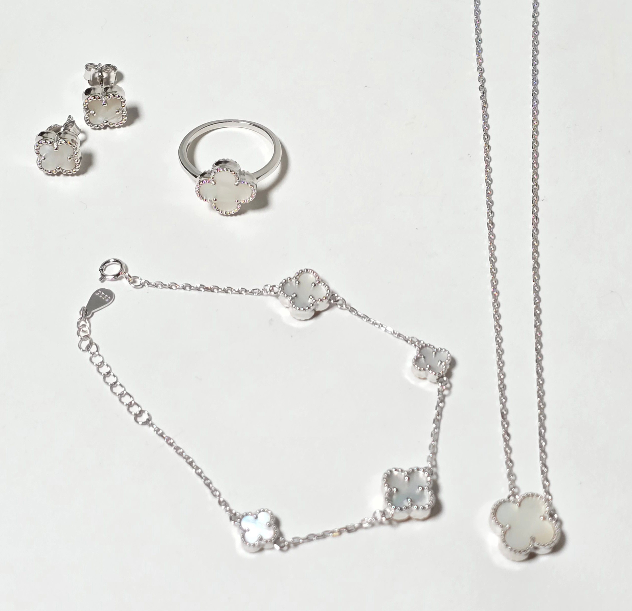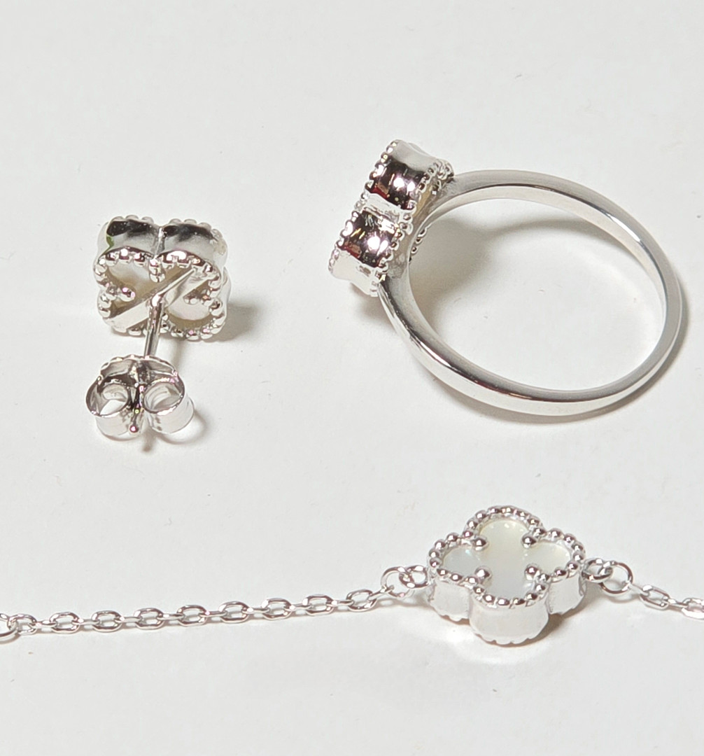 4111906. VAN CLEEF STYLE NECKLACE, BRACELET, RING AND EARRINGS.