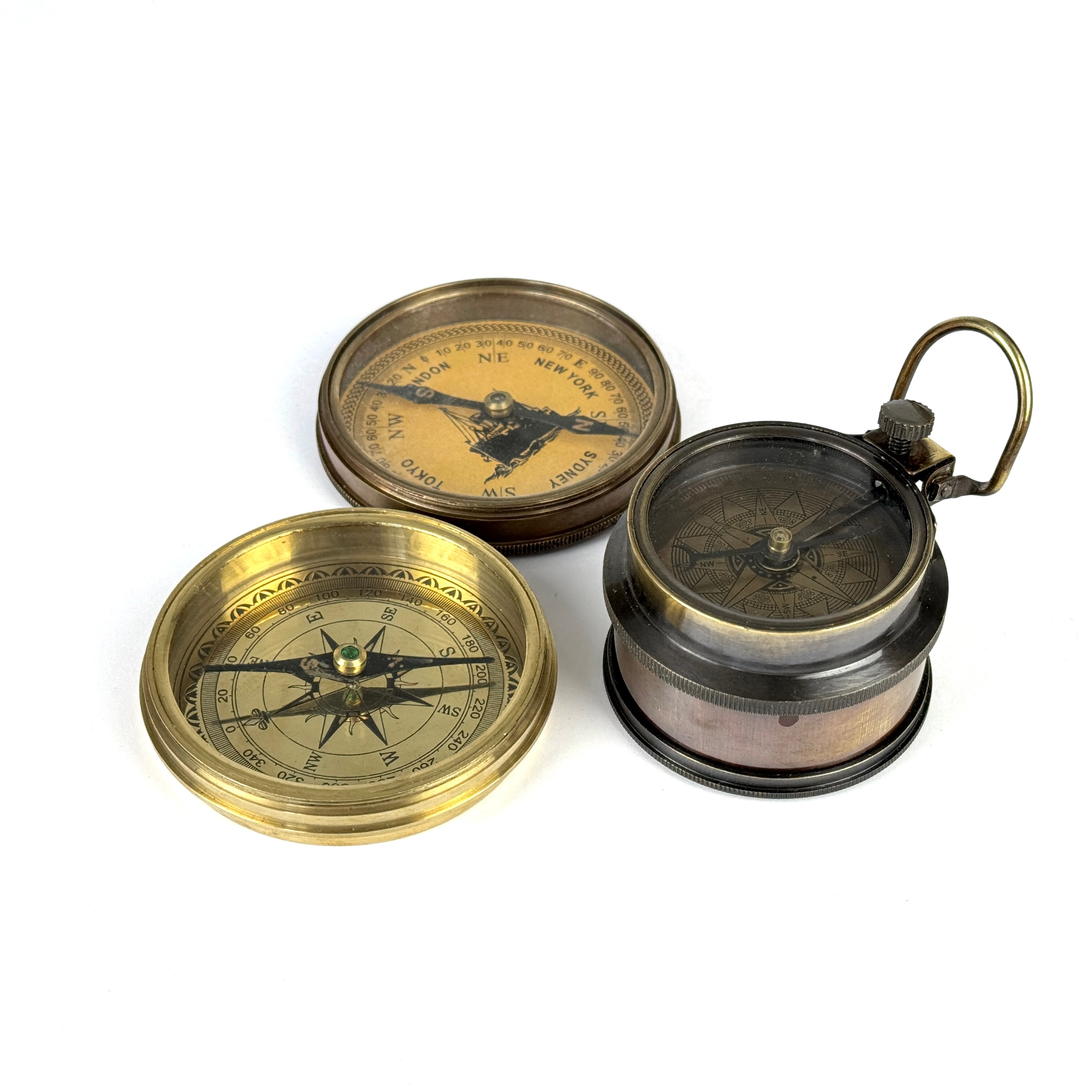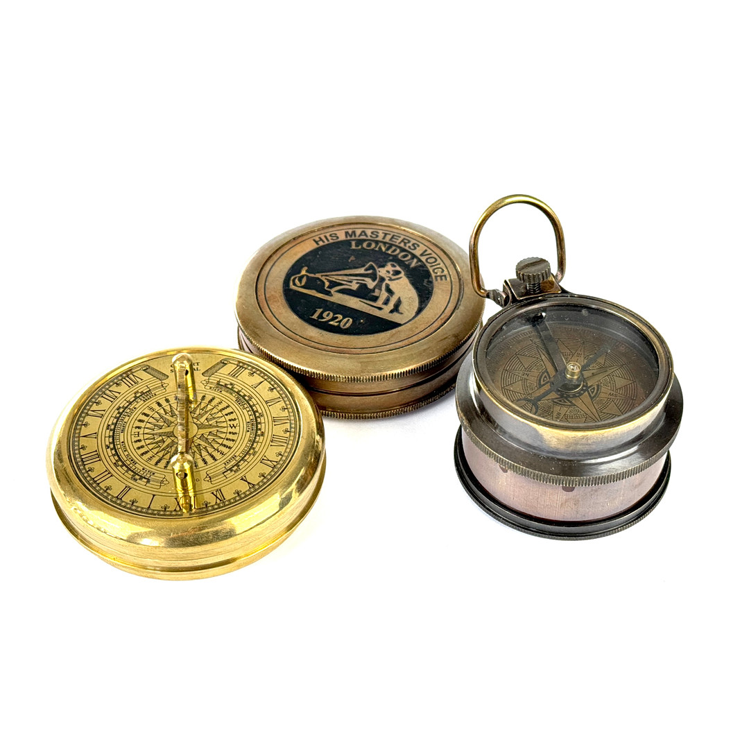4120515. THREE REPRODUCTION BRASS COMPASSES.