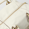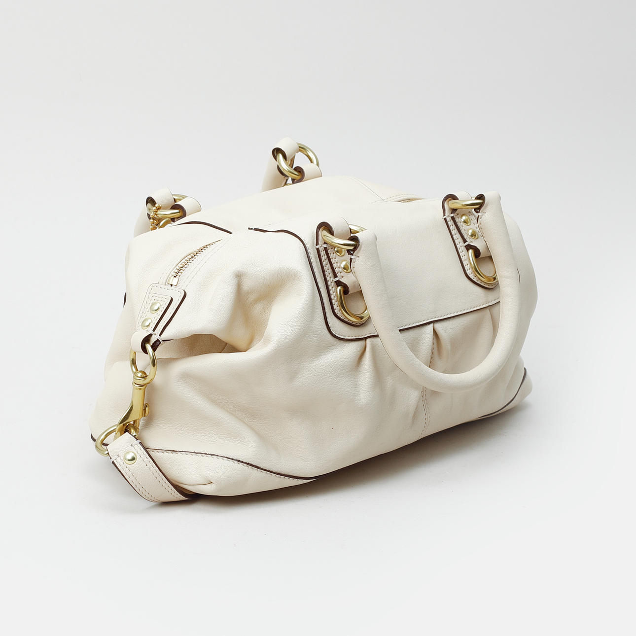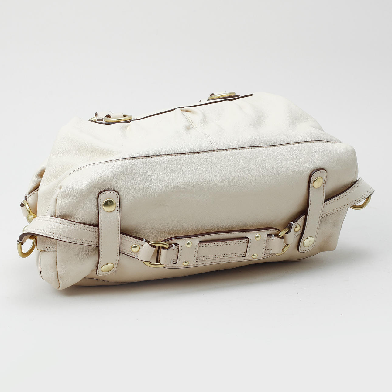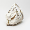 Light leather with yellow metal details. 30 x 16 x 23.