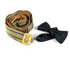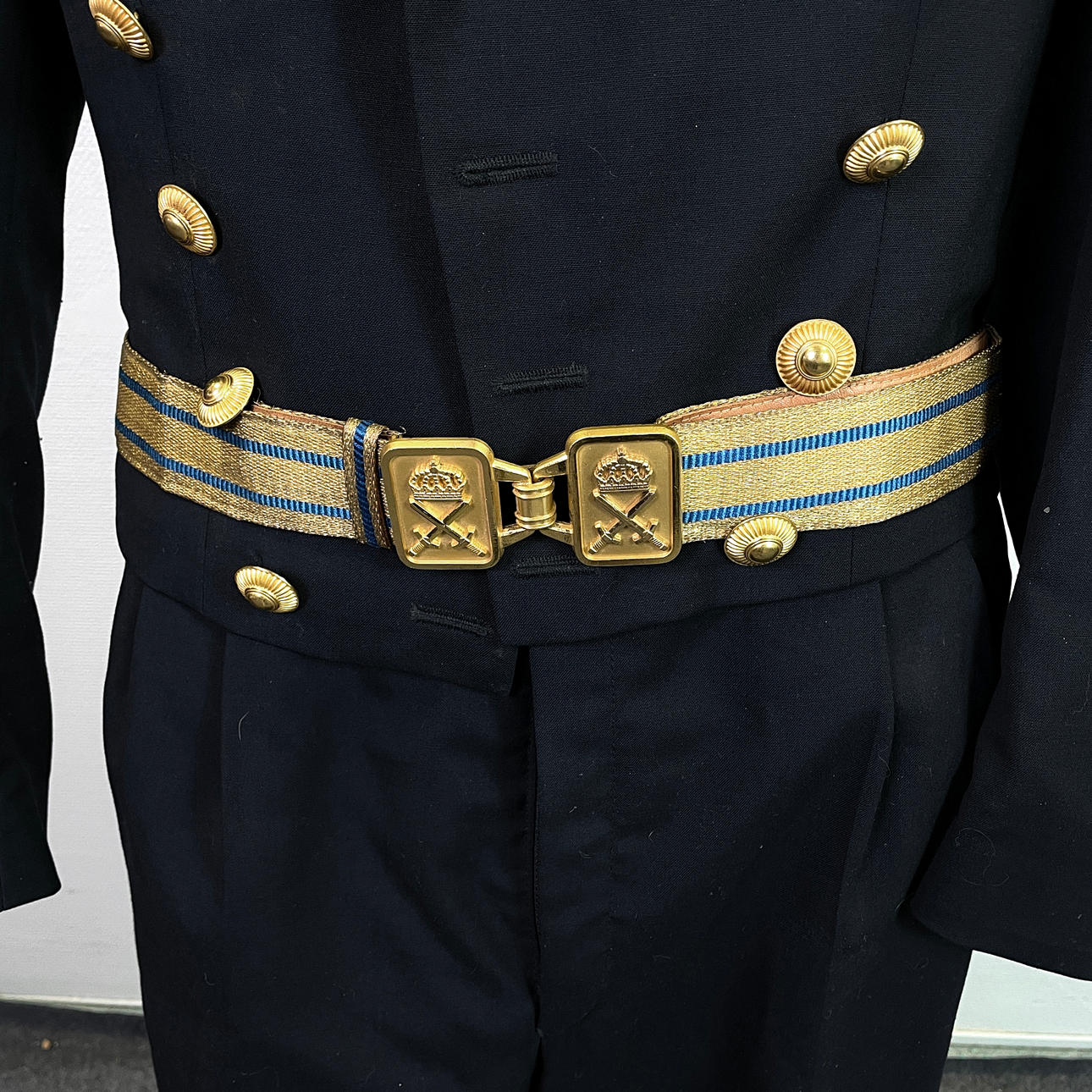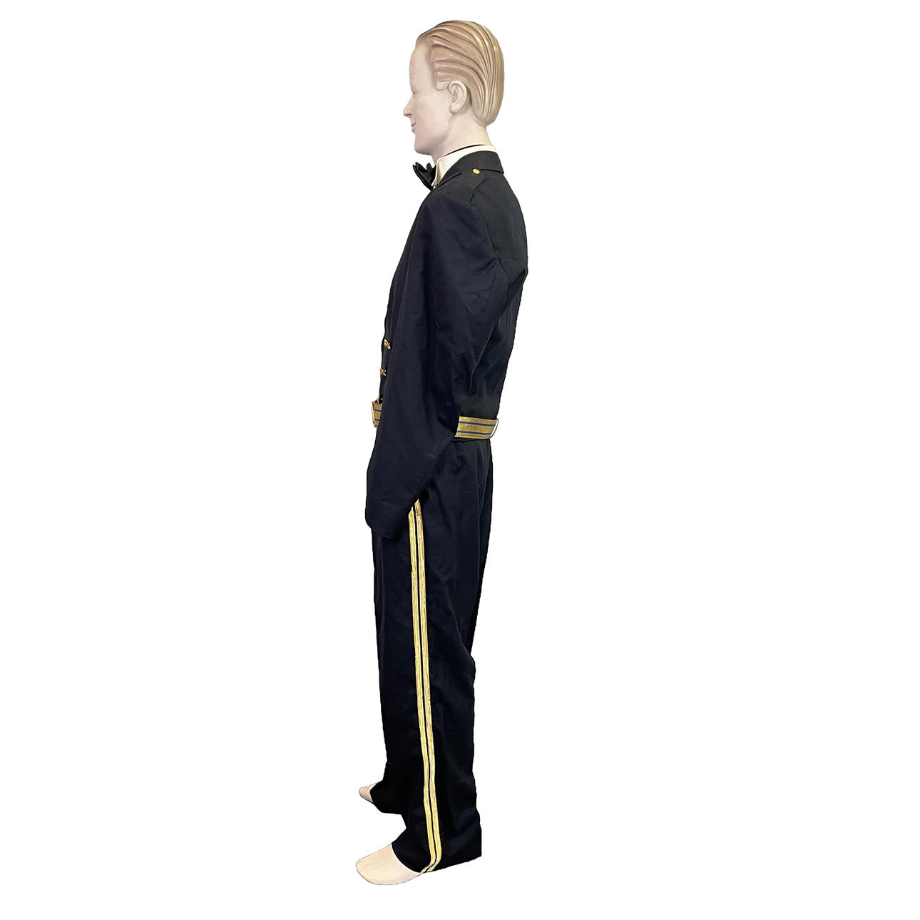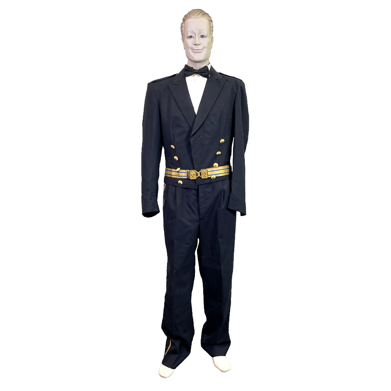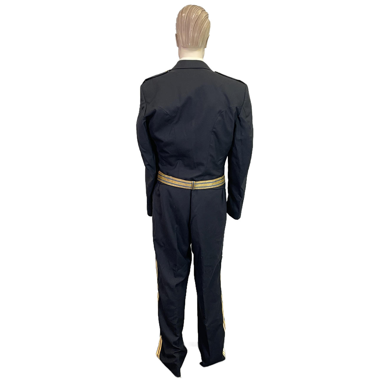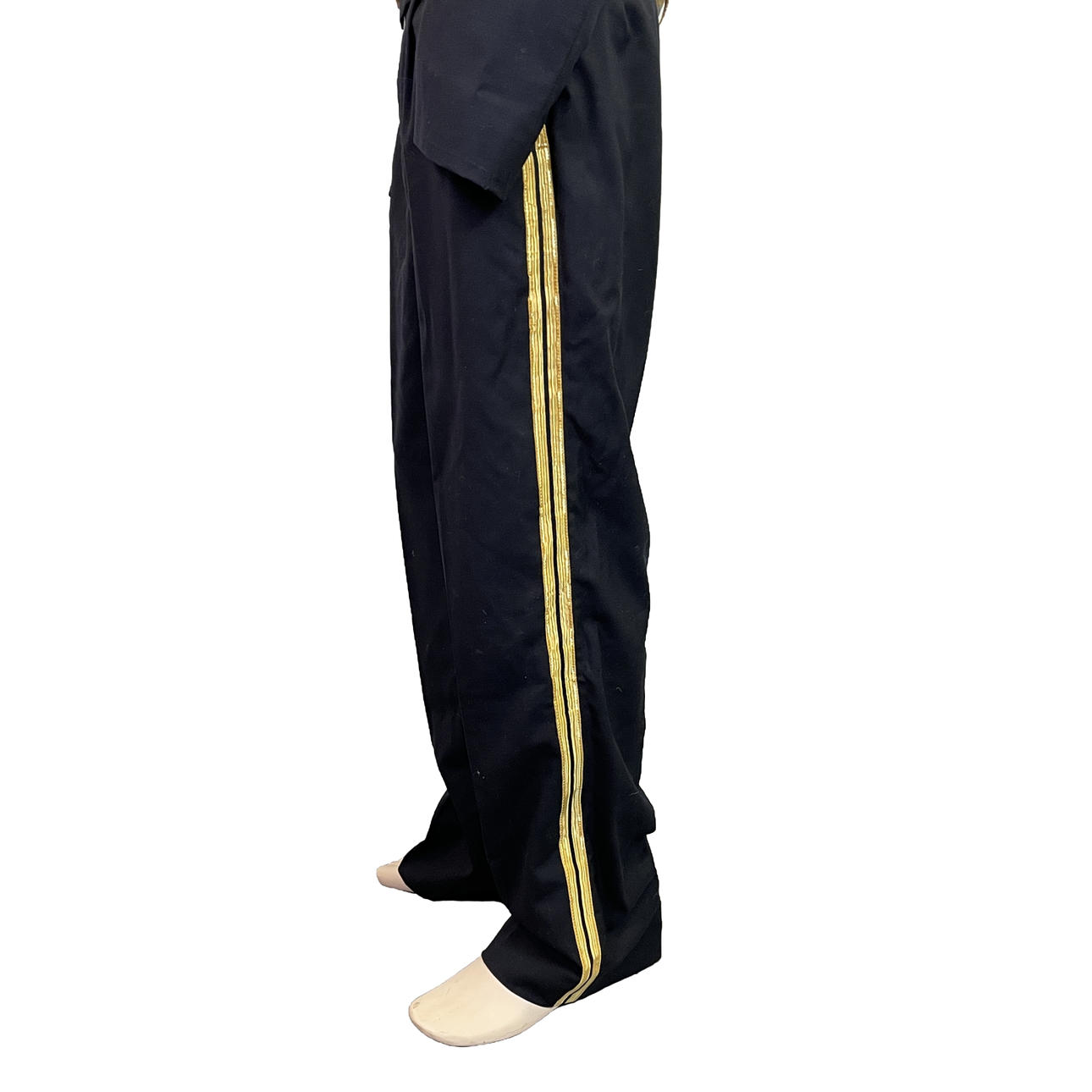 1 pair of navy blue trousers with gold lapels, waist 43x2 cm, length 107 cm