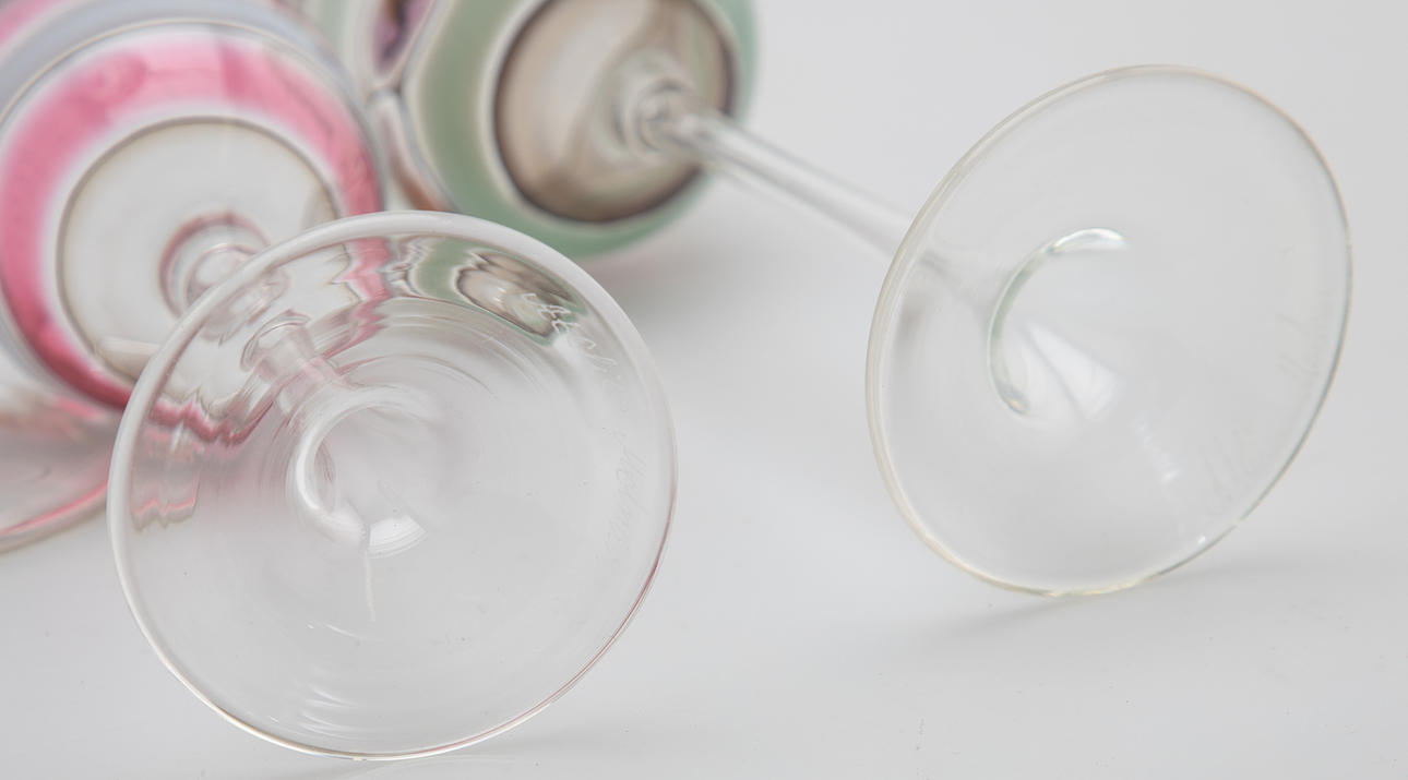 Consists of 3 glasses and a decanter. Colourless glass with applied decorative melts. Signed “Atelier Molár” on the ground.