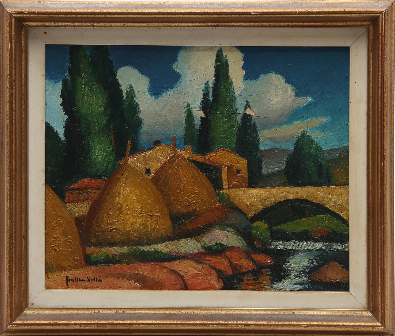 Slight flaws on the paint layer. Gilt and stuccoed wood frame, with defects. Surface dirt.