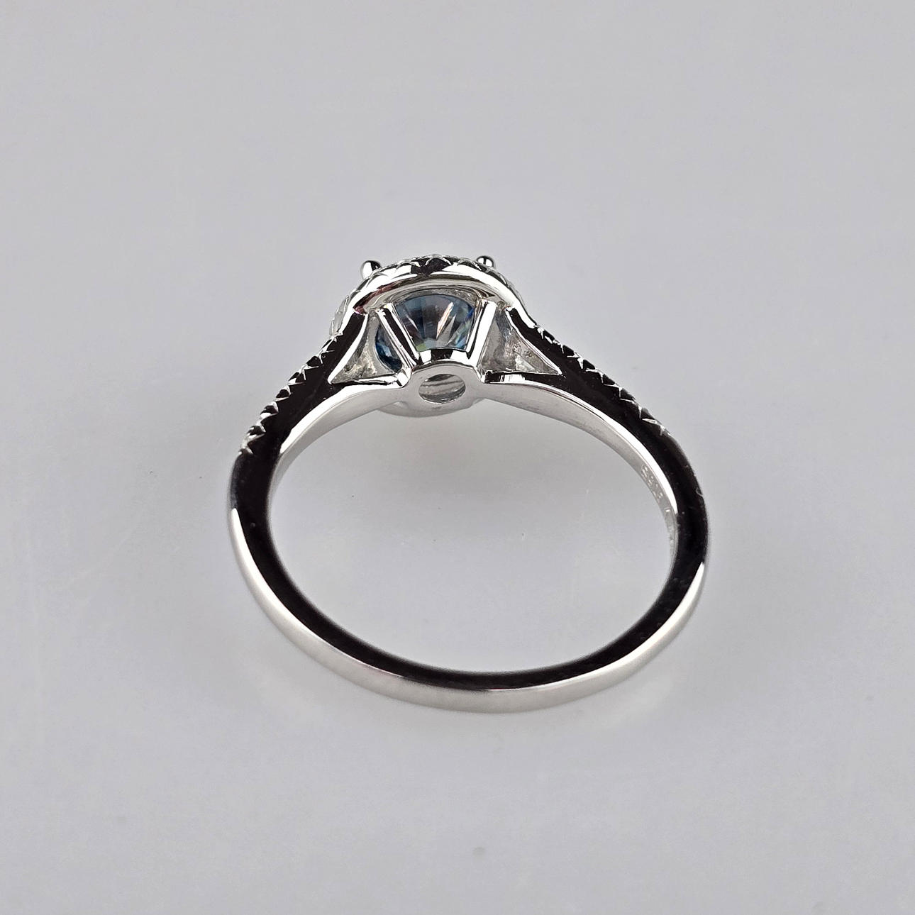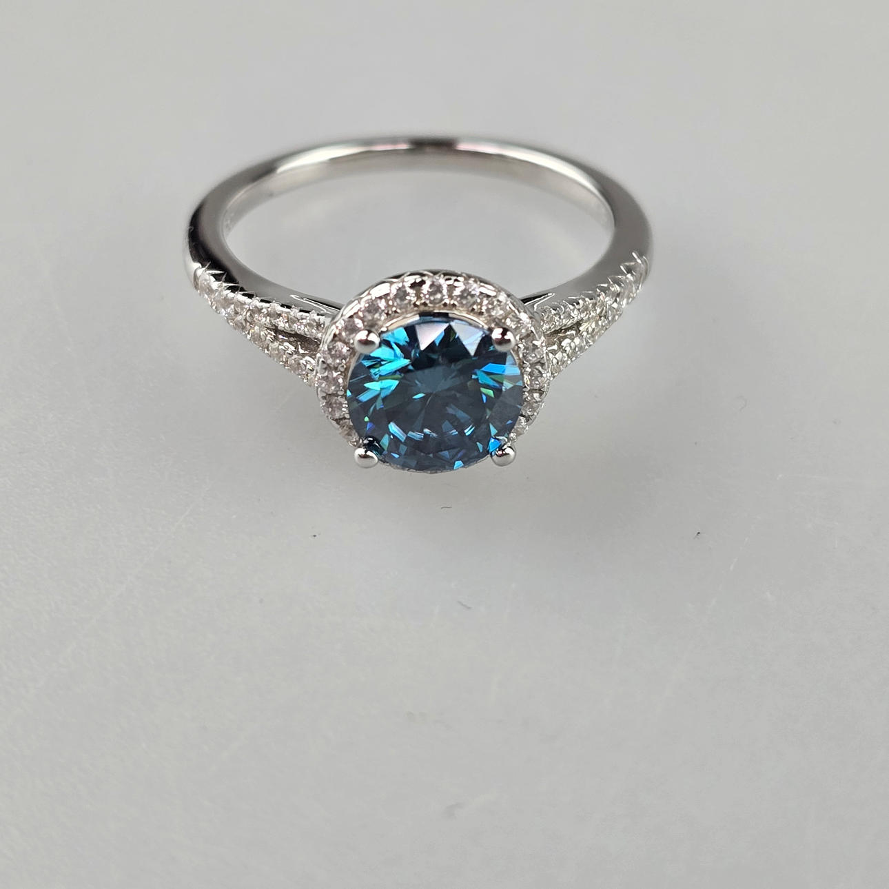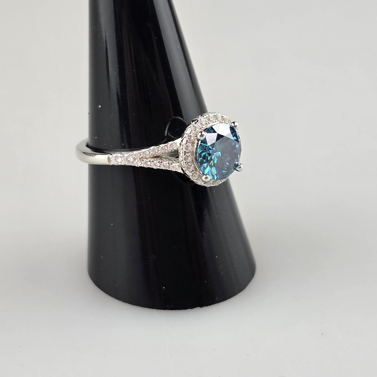 Solitaire ring - sterling silver 925/000, stamped “S925”, (lab grown diamond) blue moissanite from ca. 1.5 ct. (carat number engraved on the inside),