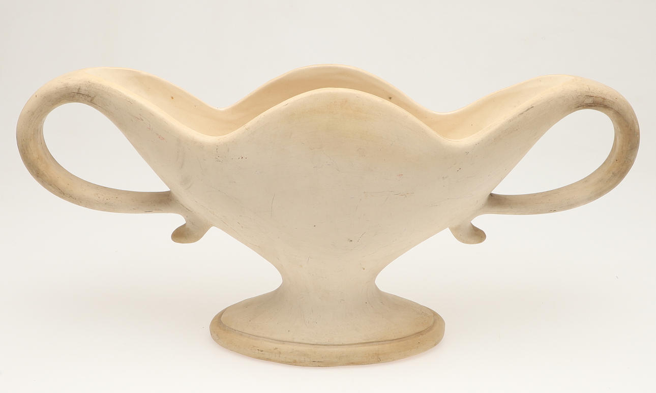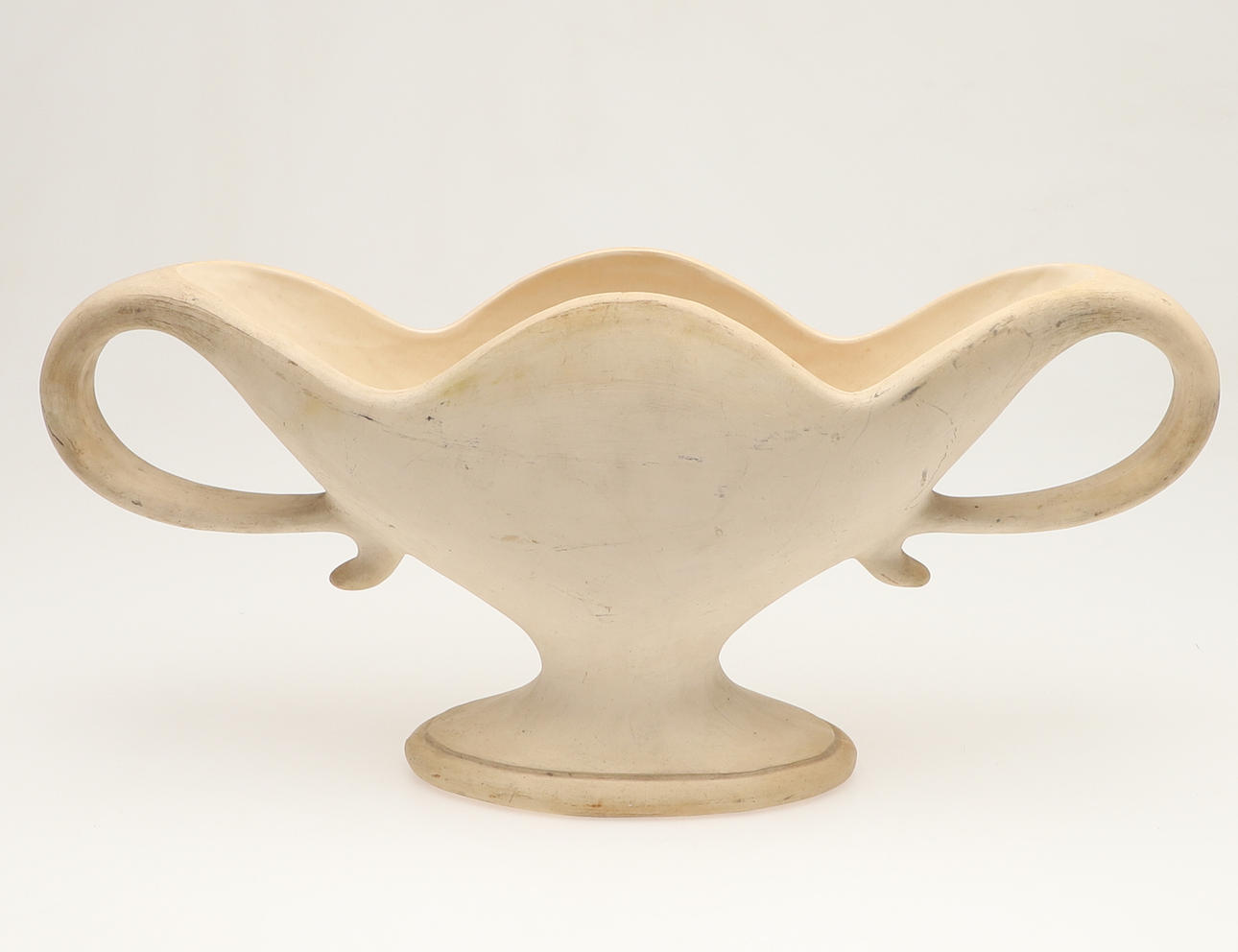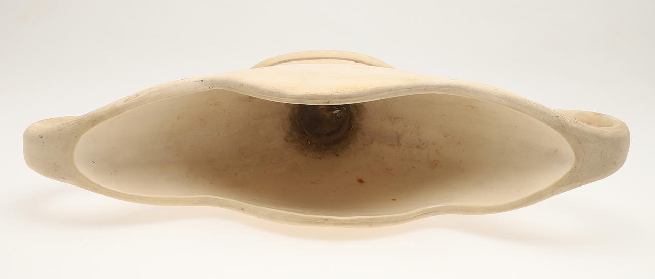 Probably designed by William John Marriner (1881-1967) for the Fulham Pottery, with a glazed interior and matt finish to the exterior, with large handles attached to each side. With impressed marks to the base. Approx 55cms across overall, rim 43.5cms across, 26cms high.
