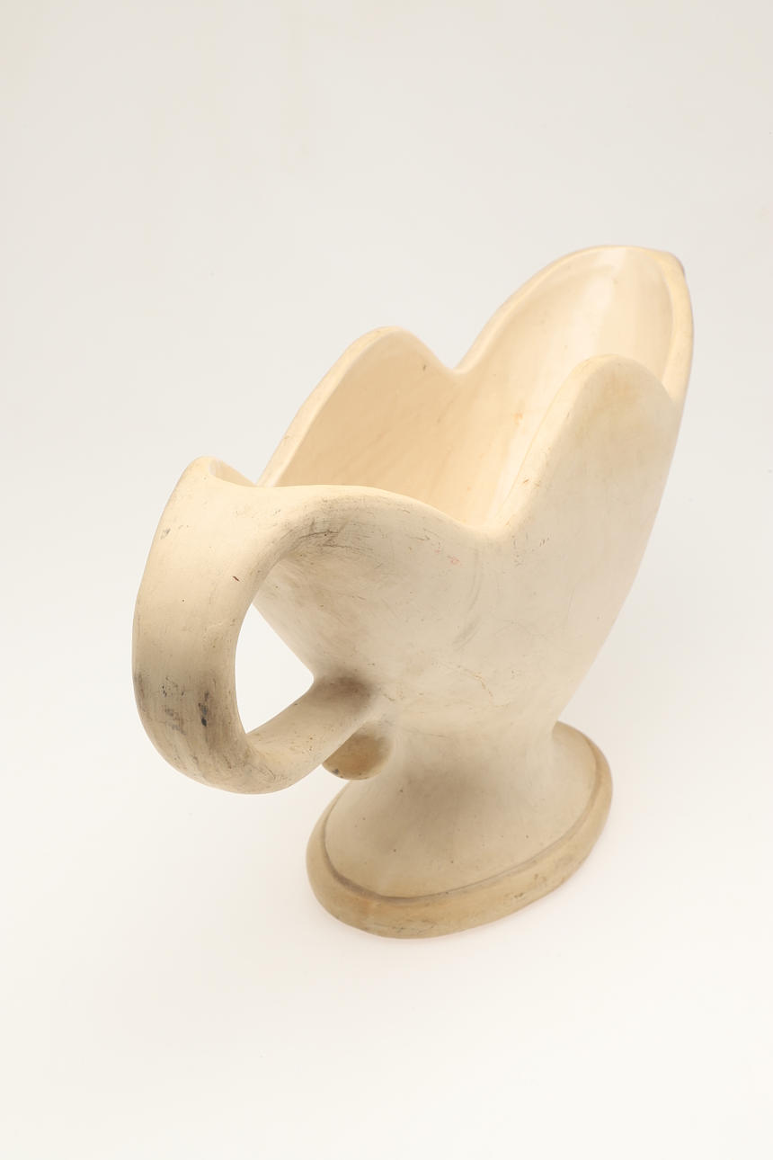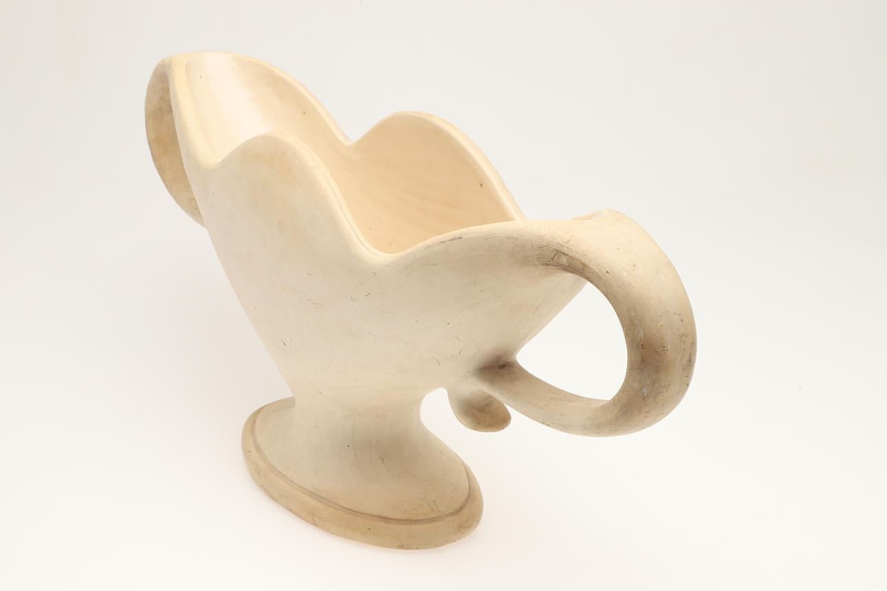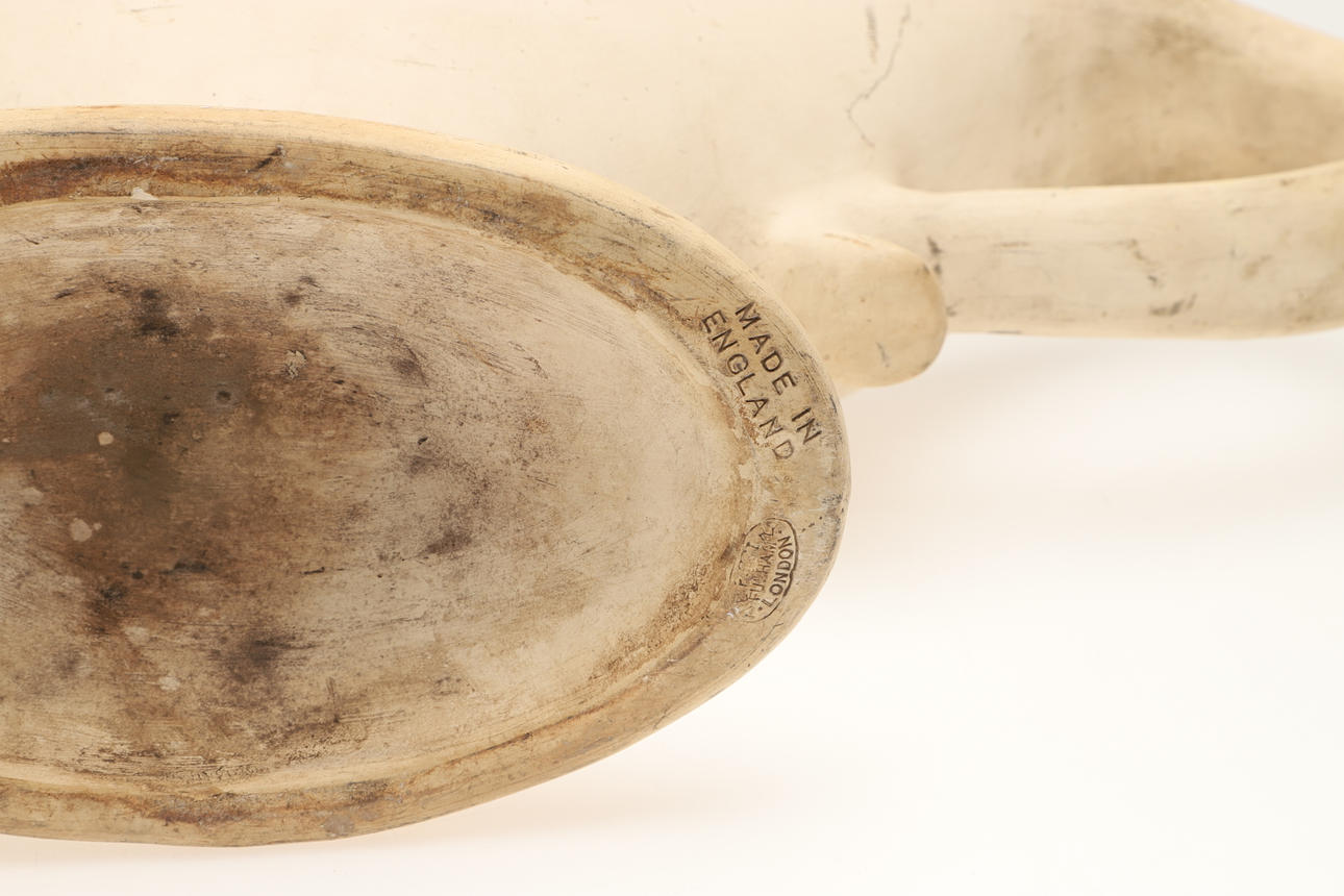 Probably designed by William John Marriner (1881-1967) for the Fulham Pottery, with a glazed interior and matt finish to the exterior, with large handles attached to each side. With impressed marks to the base. Approx 55cms across overall, rim 43.5cms across, 26cms high.
