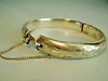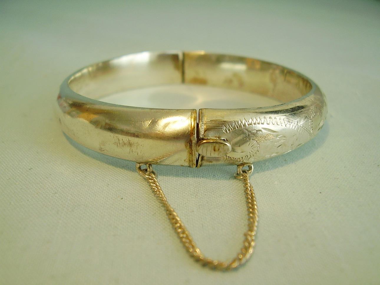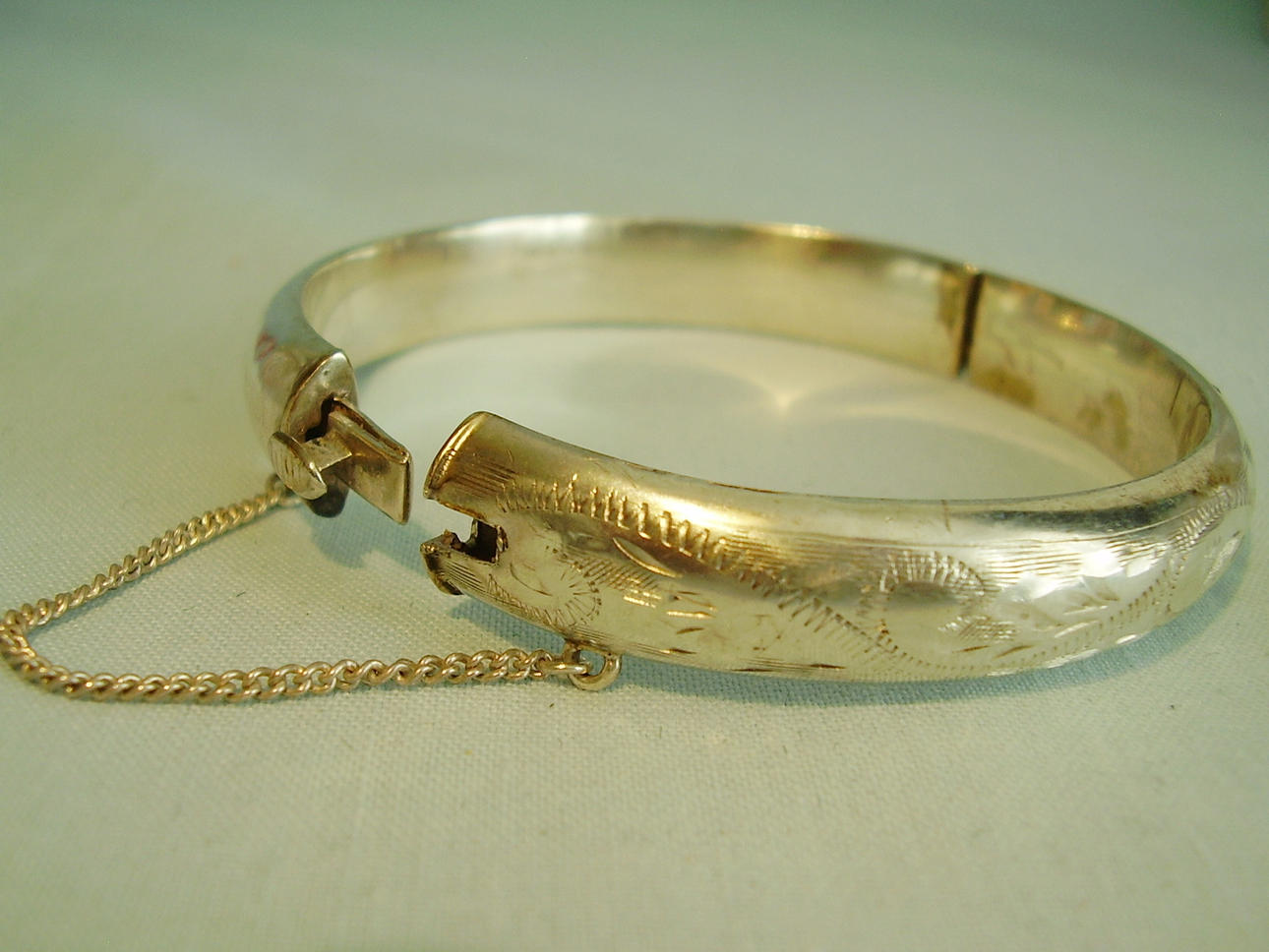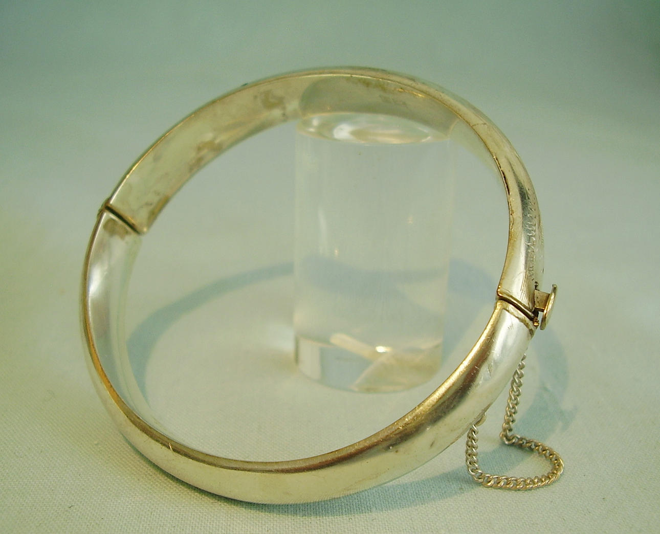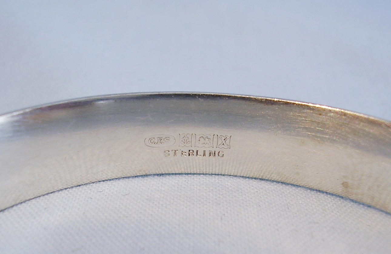 The opening bangle is sterling silver and has an English hallmark of Birmingham 1972, jeweler's mark CPS