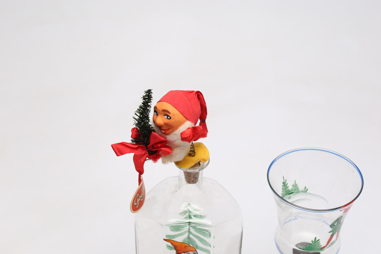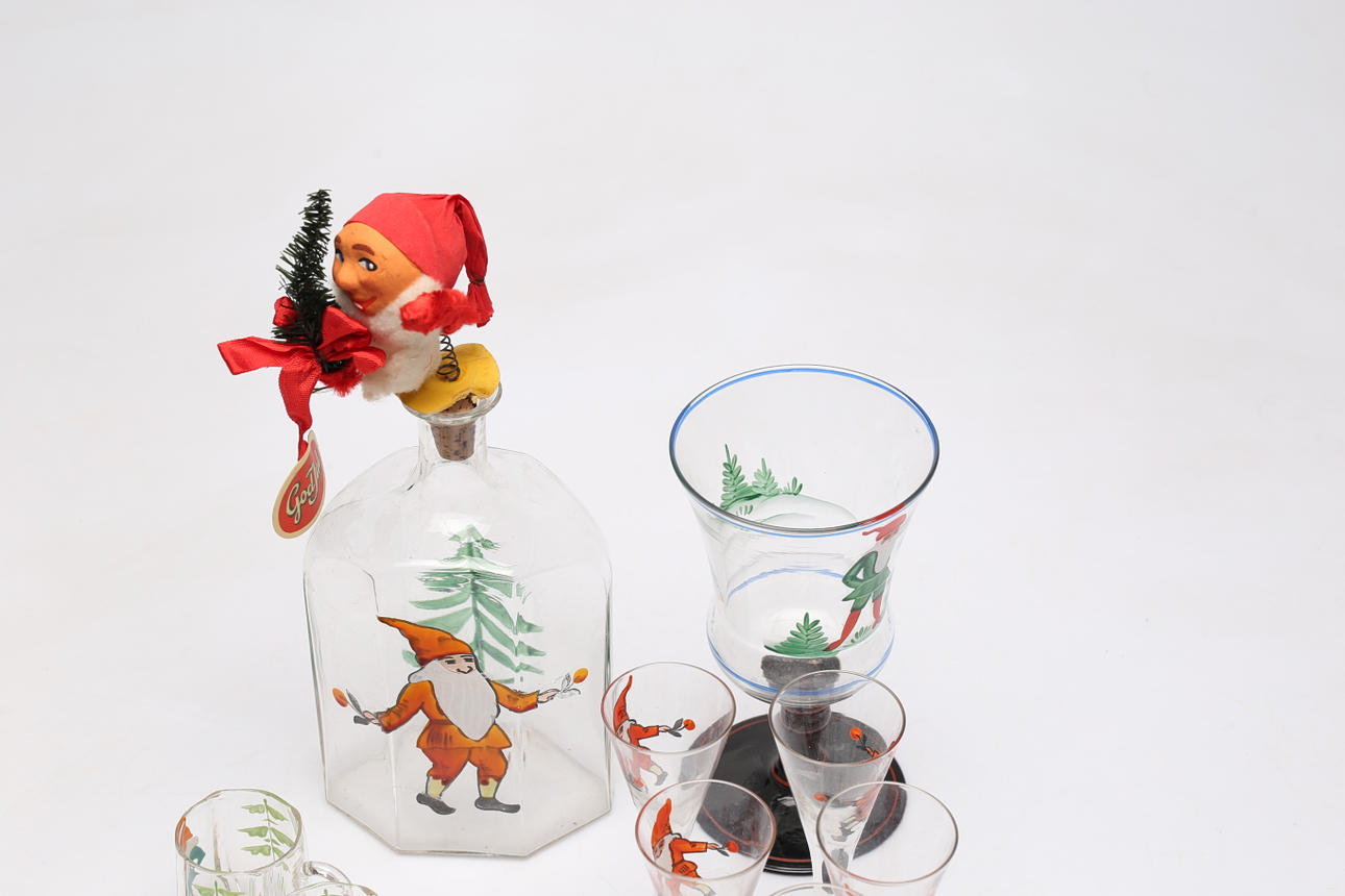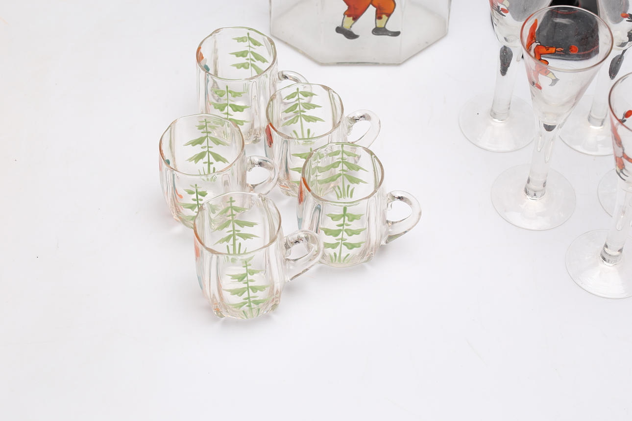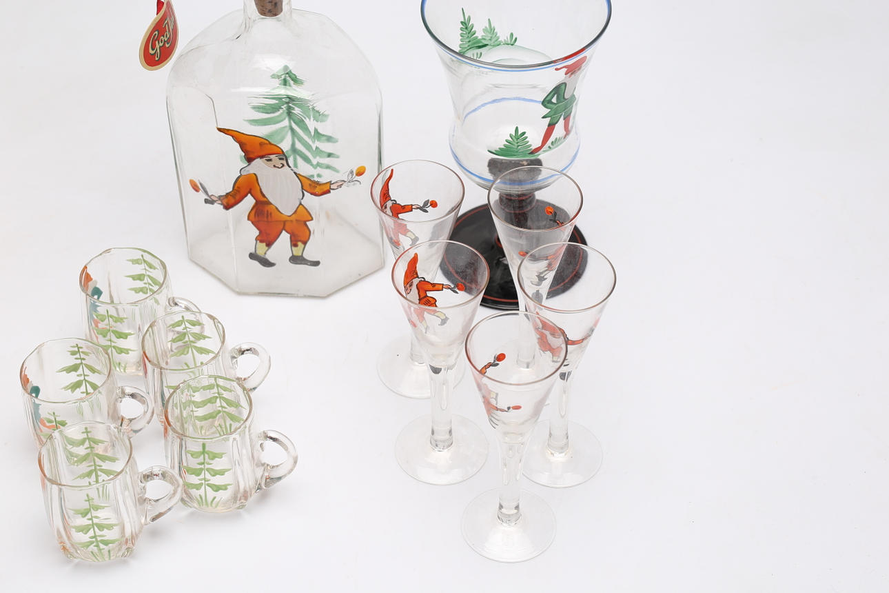 TABLEWARE SET, 12 pieces, glass, painted decor with gnomes.